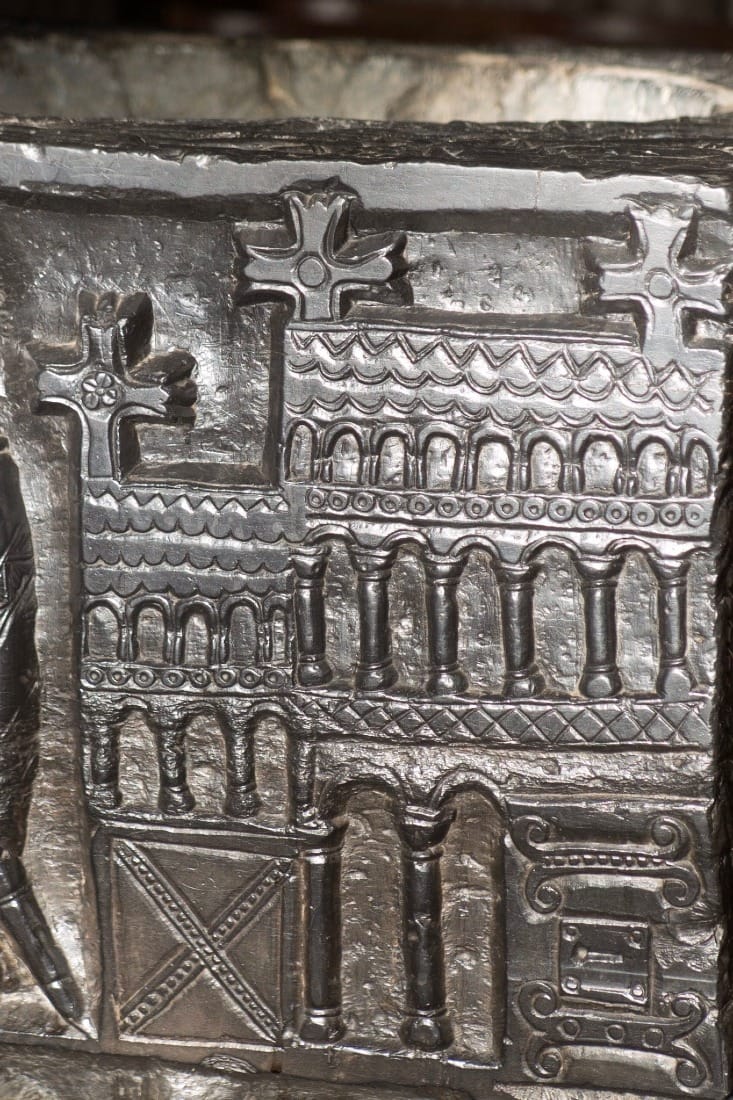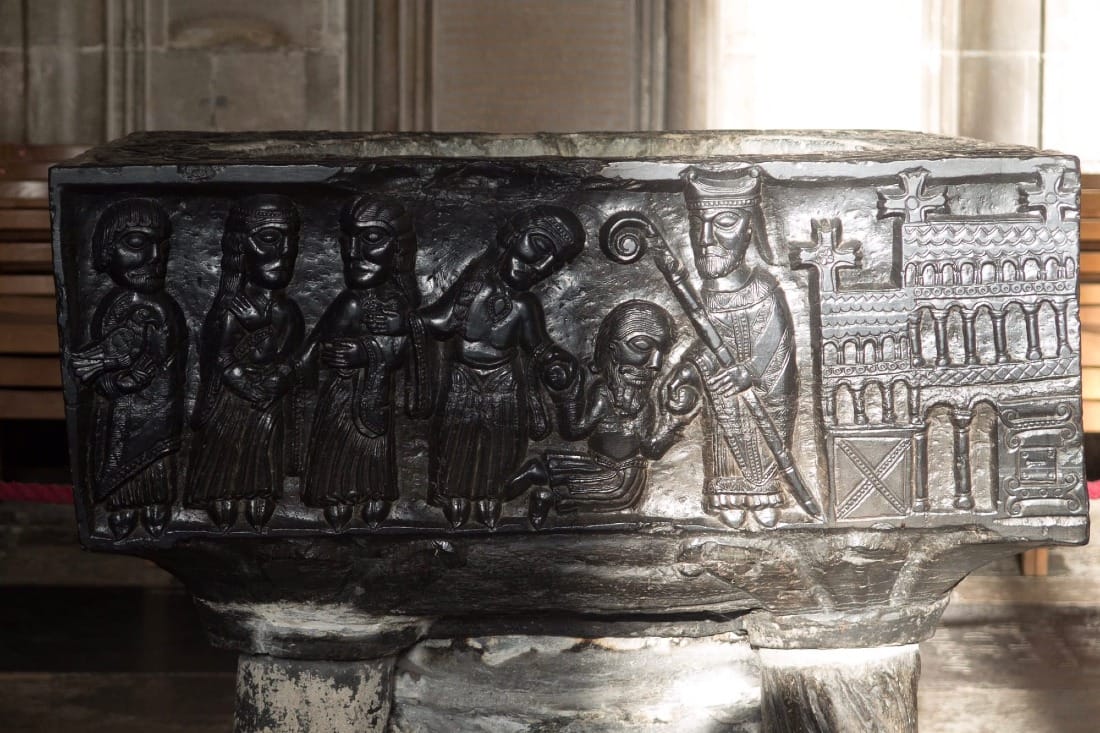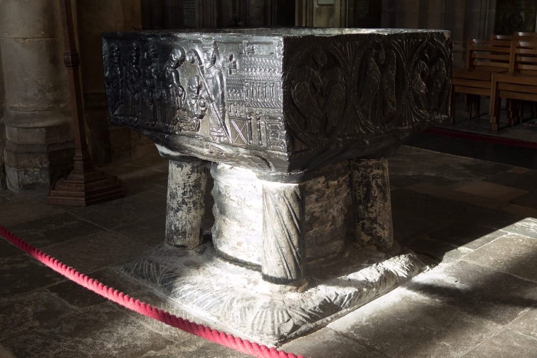 If you are able to see the font (it's undergoing conservation at the moment) you will see on the side, etched into the Tournai marble, a depiction of a building that looks much like the transepts in the photo above.