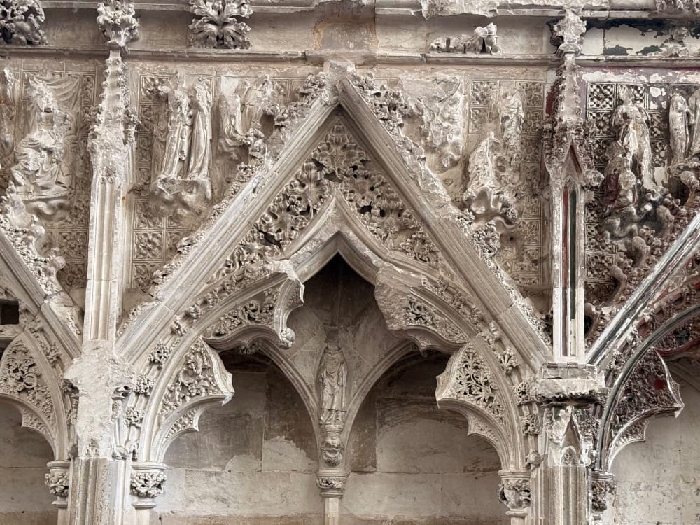 The Lady Chapel at Ely Cathedral, completed in 1349, is the largest of its kind in England. Its delicate tracery and star-like vaulting create a celestial effect, resembling a constellation. It would have been painted back in the day with stained glass in the windows. The decoration was stripped back (including the statuary in the niches) during the Reformation.