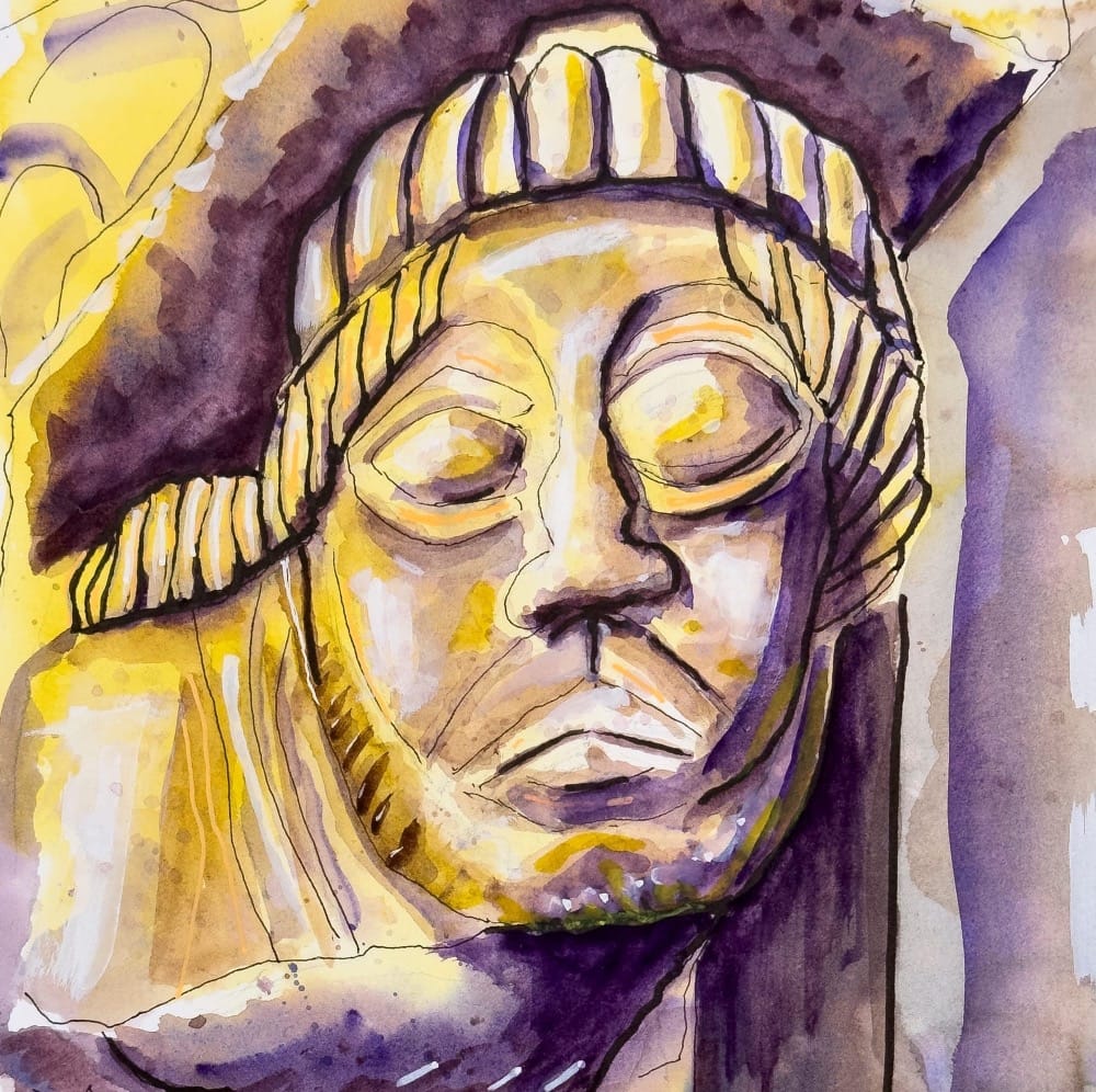And so I do. I sketch it. I trace its contours, map its imperfections. I bring it into my own world, into my art. The sculpture is no longer just an ancient face set in stone - it lives now in my mind, my hand, my brush. And as I brush in the colour, I get a powerful sense of the hand that shaped it, nearly a millennium ago, reaching forward through time. And in some small way, as my hand moves across the canvas, as the image takes shape beneath my fingers, I reach back and touch it.