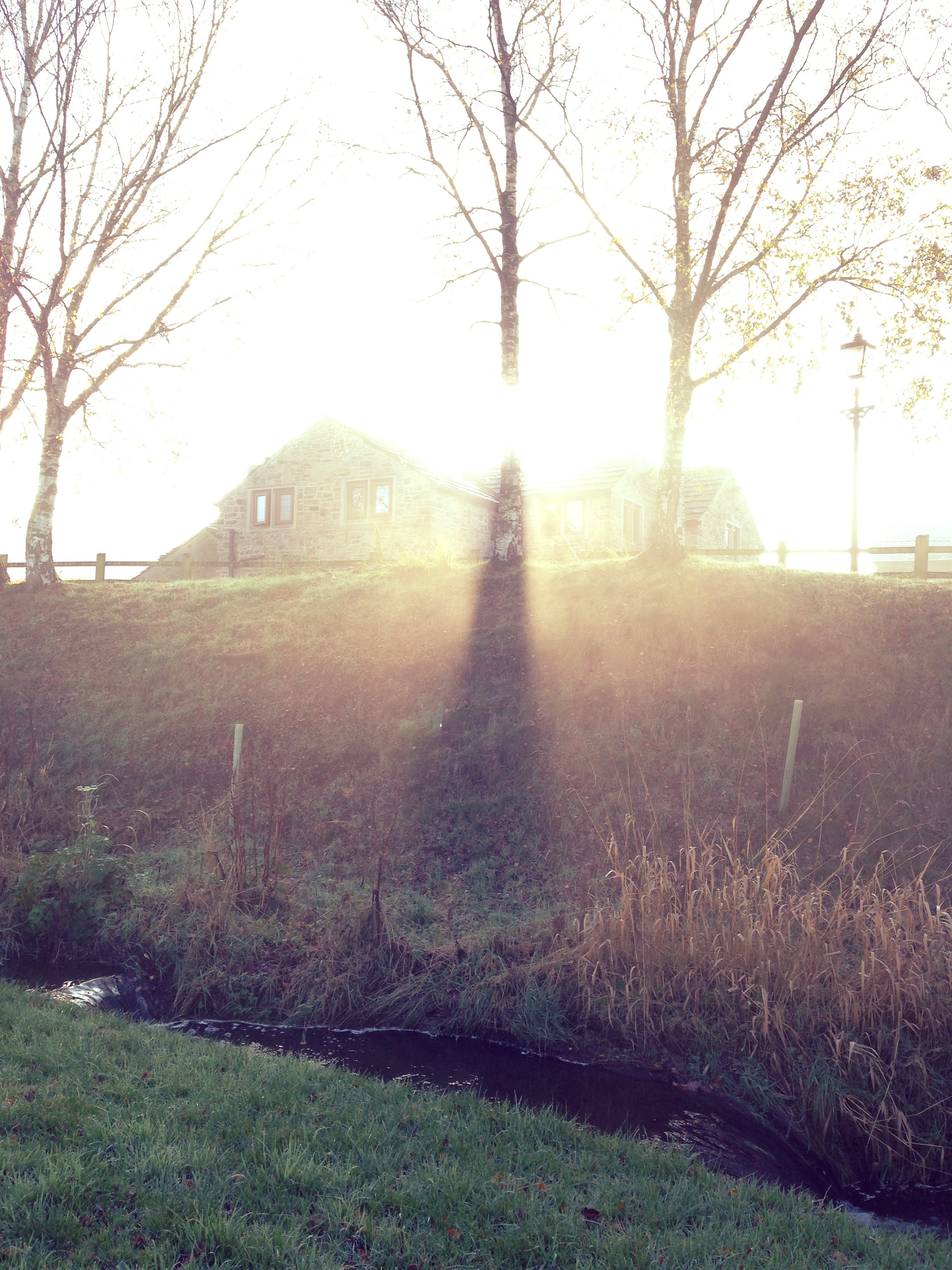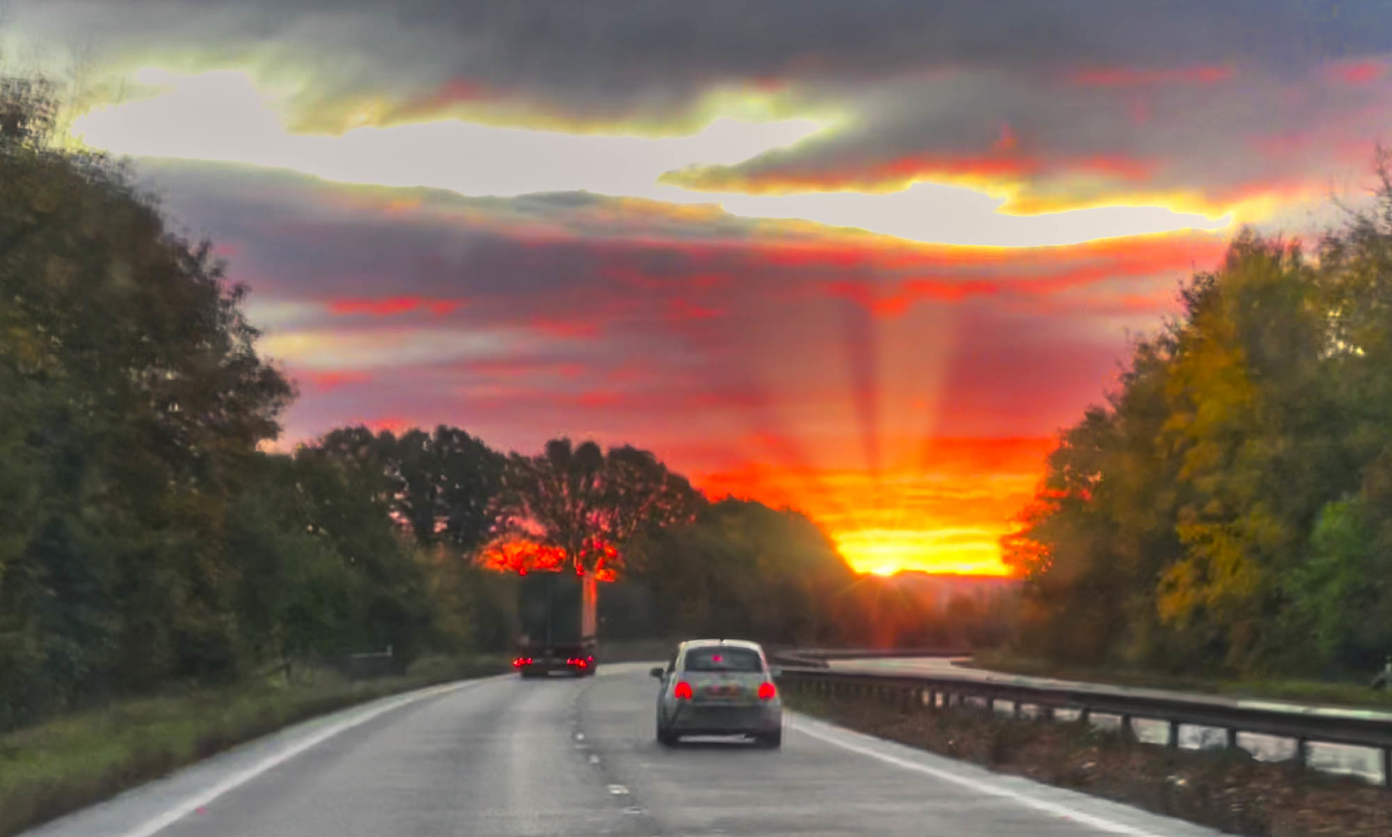 On some days Iβve been witness to the sunβs antics whilst in motion. One morning, whilst driving down the A1, I was entertained by the pinky adolescent globe swinging from left to right and then back again, as I snaked along the ancient Roman route. For a short while it perched on top of a lorry cab hurtling up the inside lane, until a rise in the road dropped it into a distant village vignetted by a blanket of fog with the buildings embossed like cardboard cut outs.