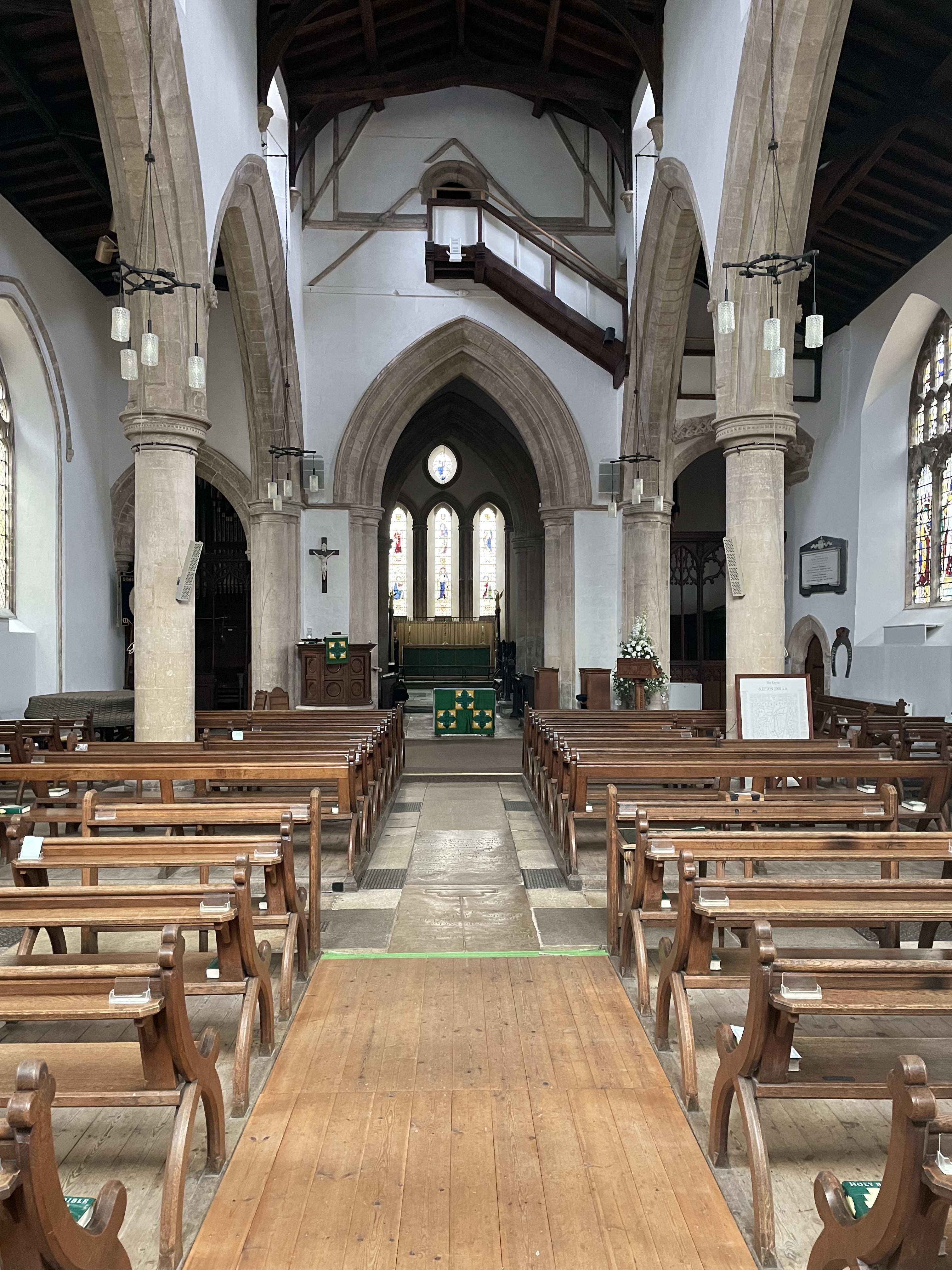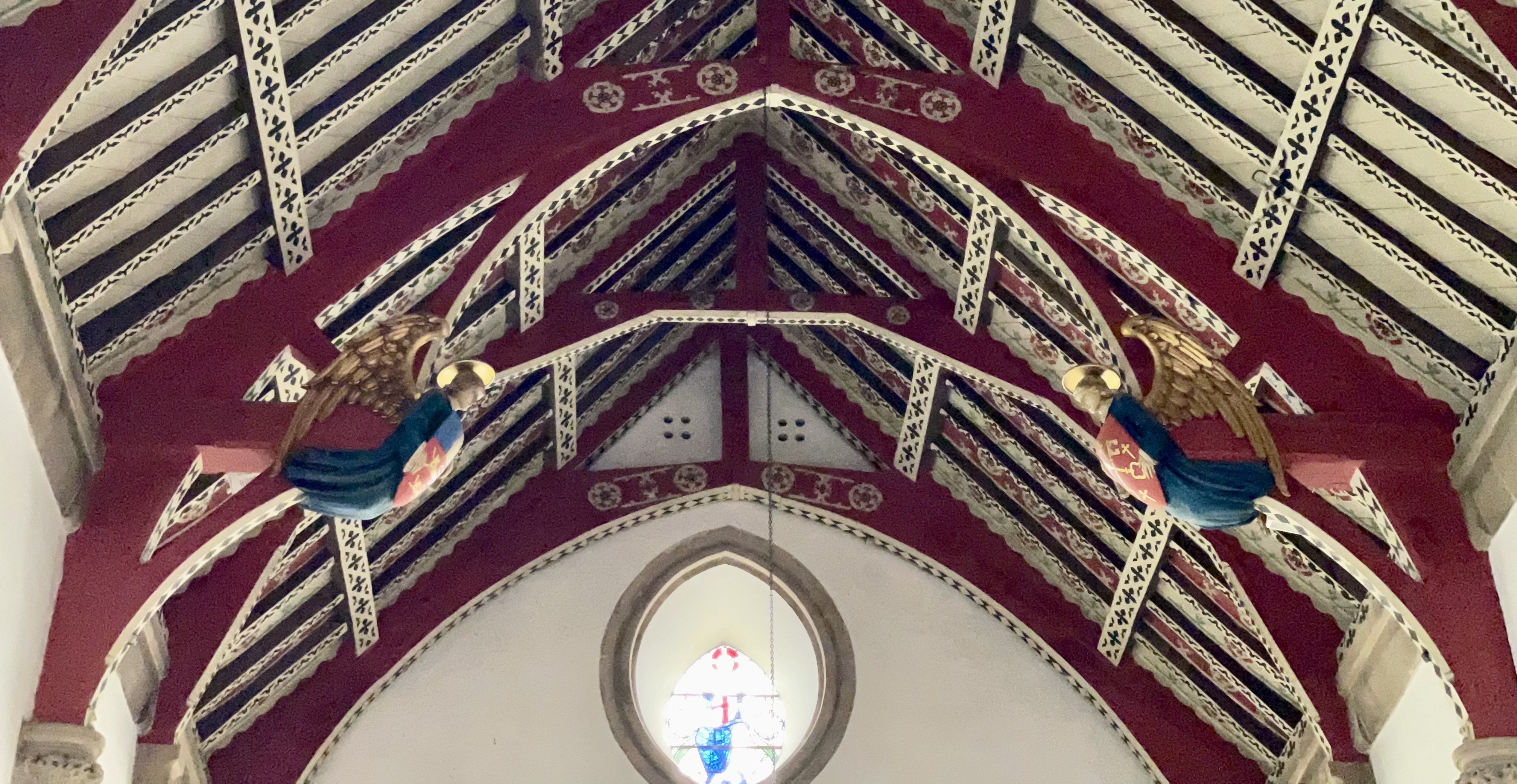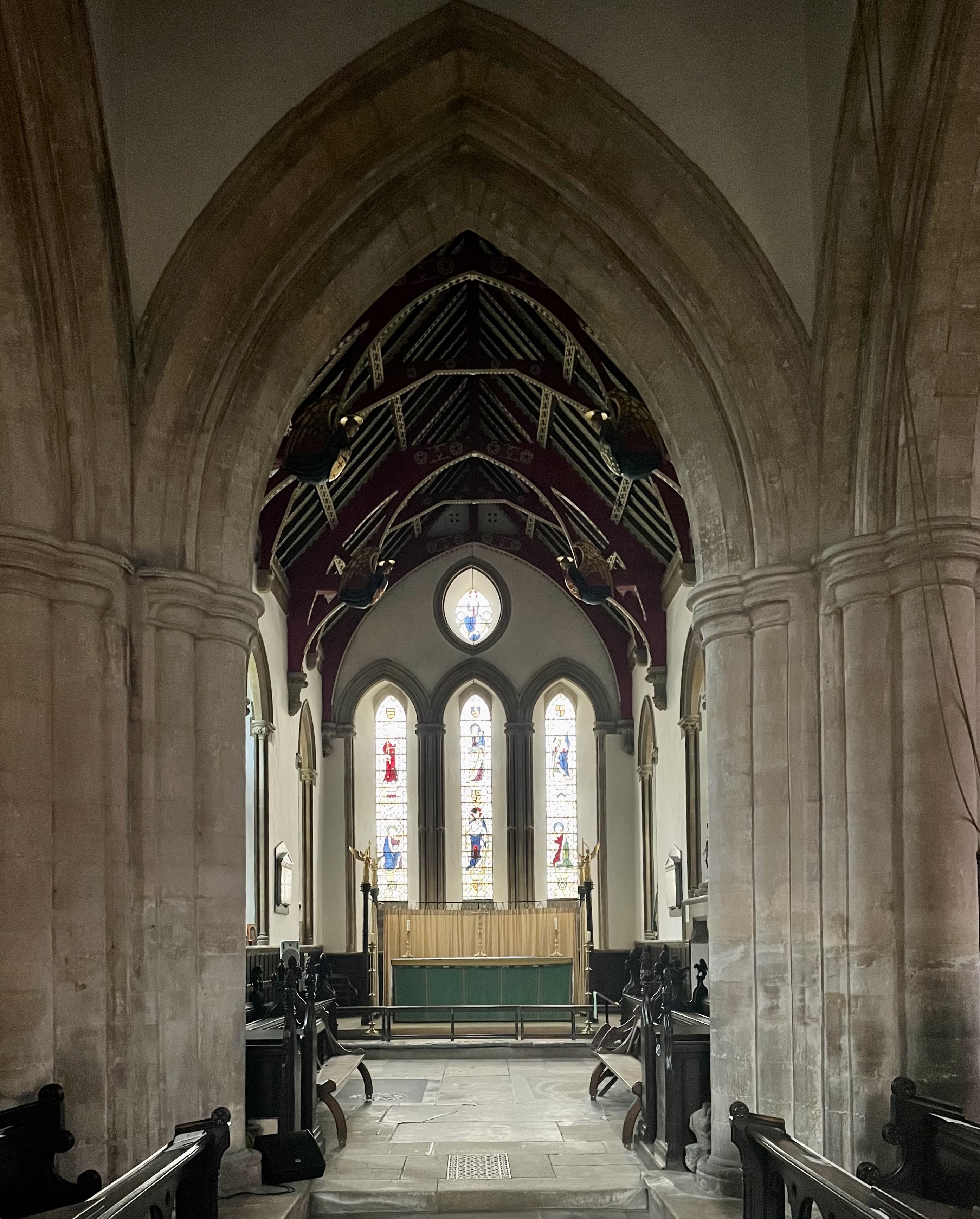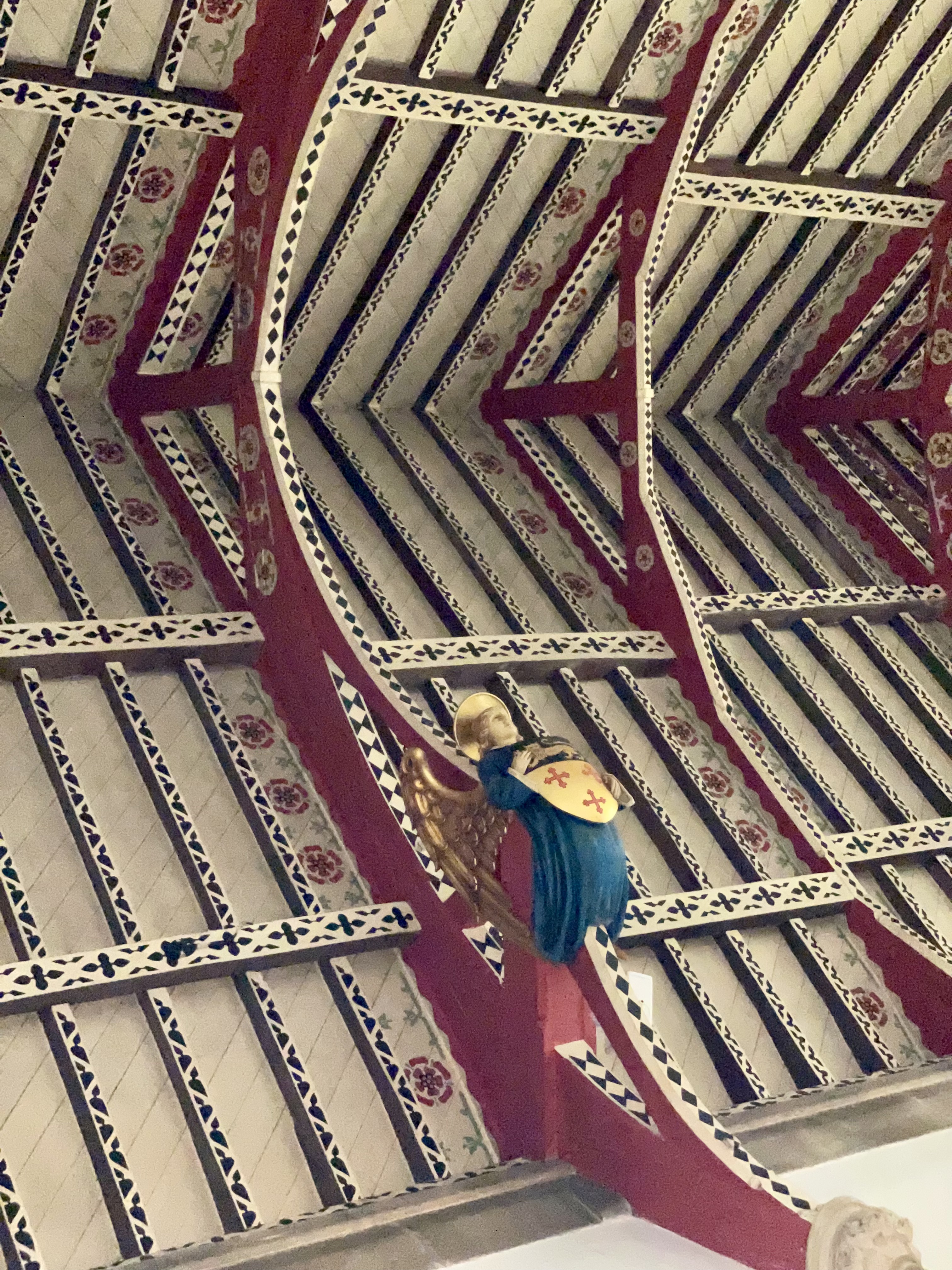 There is a chancel full of angels painted by Ninian Comper and some remarkable choir stall finials carved to perfection but the joy of this church is the textile map and kneelers made by the local community.