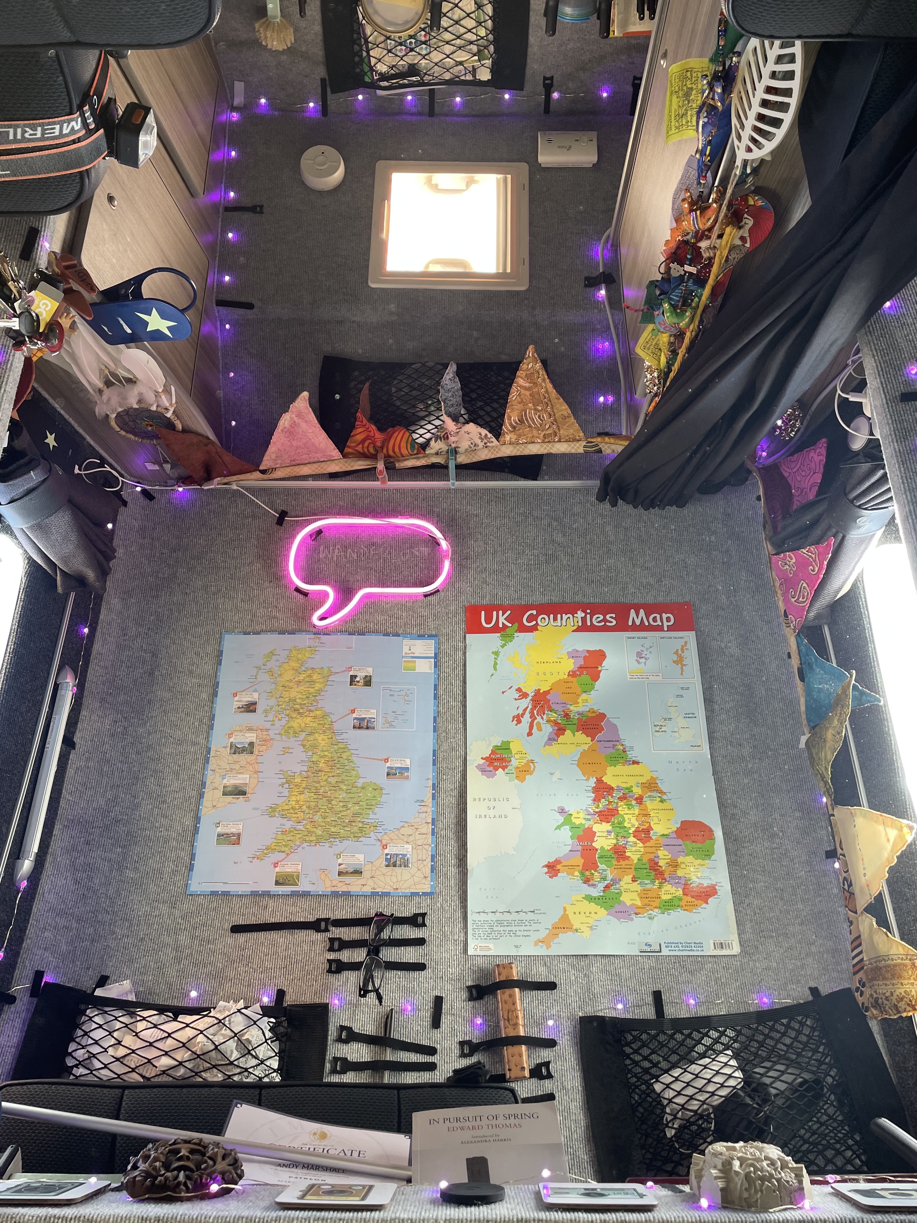 I've upgraded my bed view to add another 'counties' map to the ceiling. Gives me a little more perspective as to where I am. The two plastic boxes at the top of the photo are carbon monoxide and fire alarms. The curtain on the right is a privacy curtain (there is a loo in the back). When it's cold I close the curtain to keep in the warmth. Next to the curtain is my 'van charm' - a growing string of token objects collected from the places I visit.
