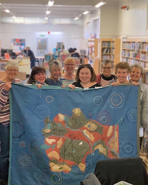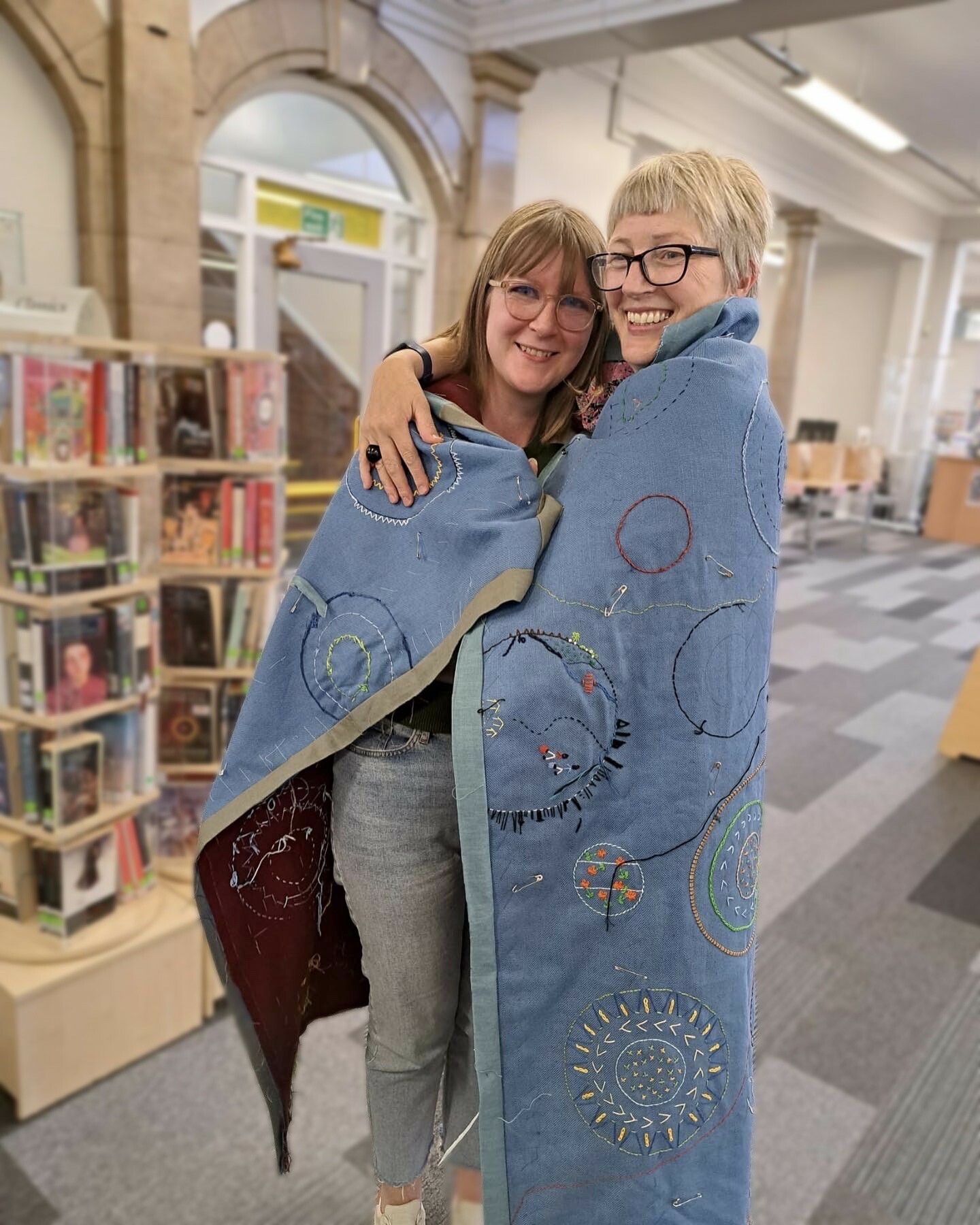Textile Artists Rowan Bridgwood and Corinne Cottam wrap themselves in the Radcliffe community textile map which they have designed and created with a wonderful team of local volunteers.
