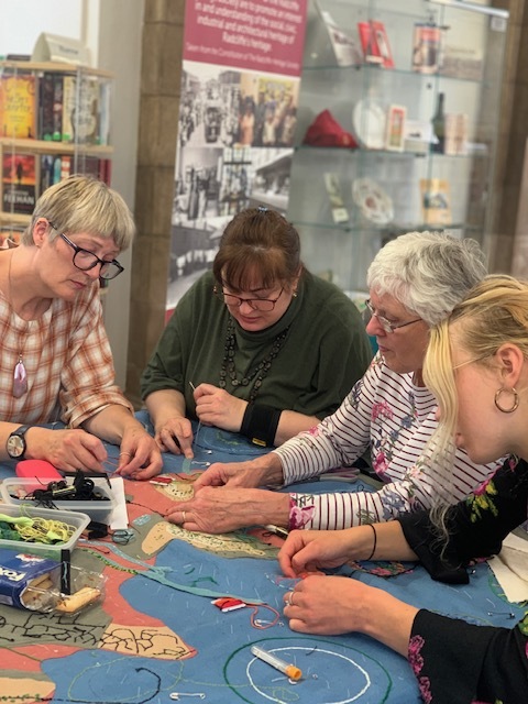 I'm very proud to be involved with a project called Spirit of Place, Radcliffe. As a part of that project Rowan Bridgwood and Corinne Cottam have designed a textile map which has been made by members of the Radcliffe, Greater Manchester community. It is a thing of beauty, and has had many stories and memories woven into its fabric. Here are some photos from the making of the textile map.