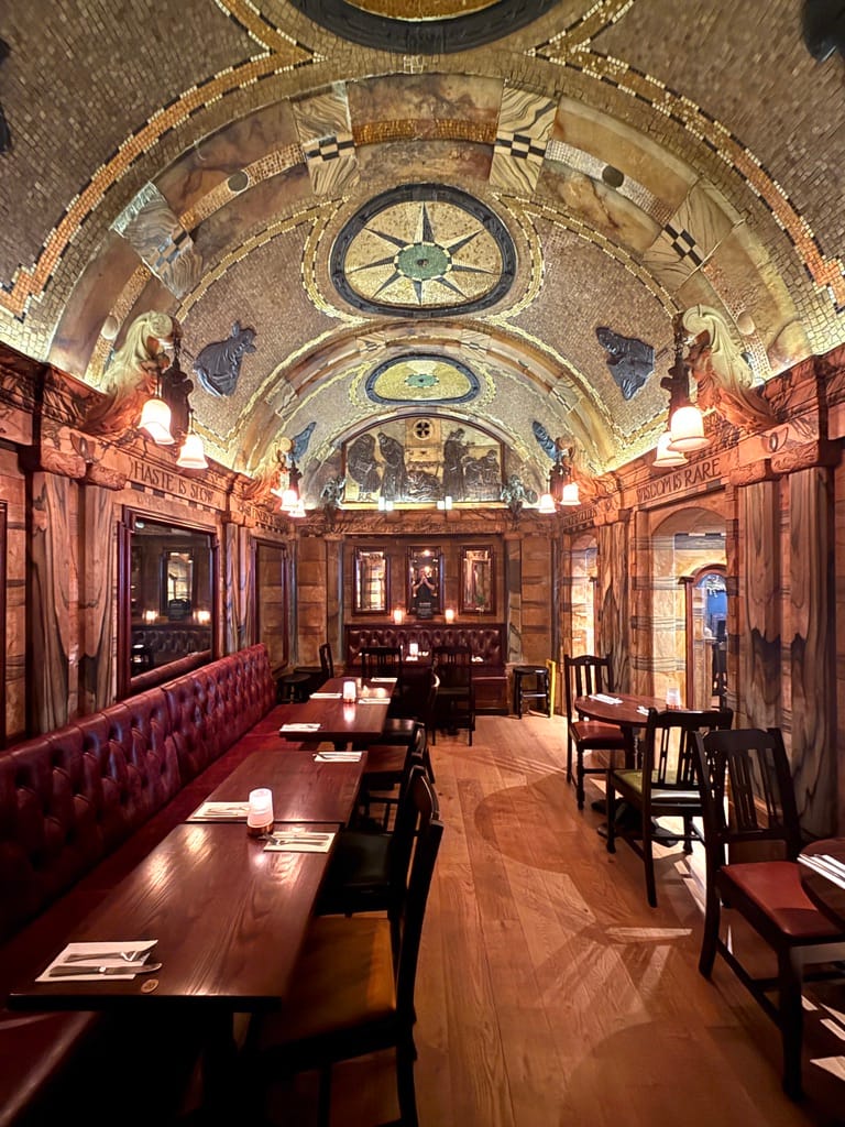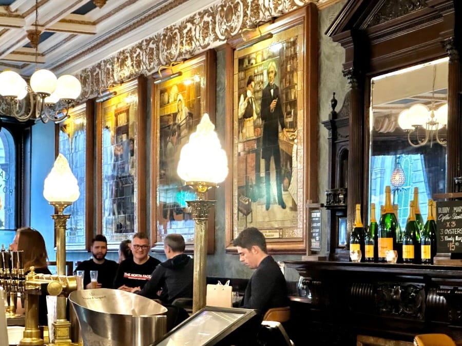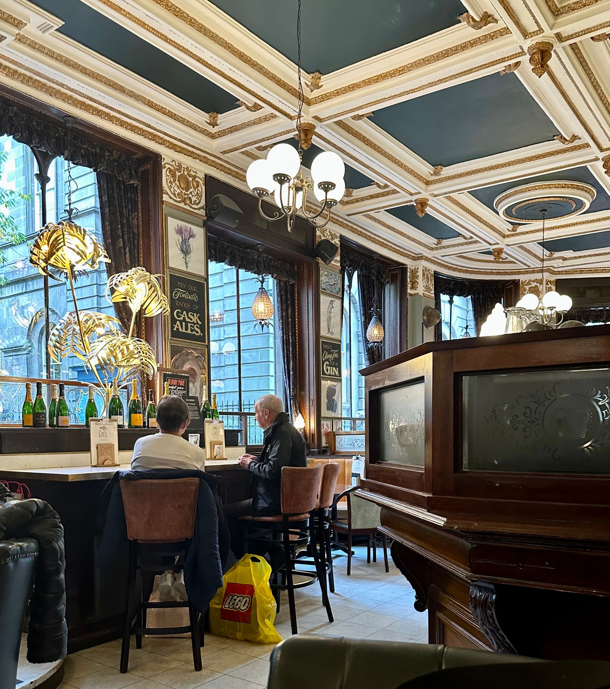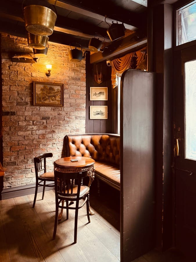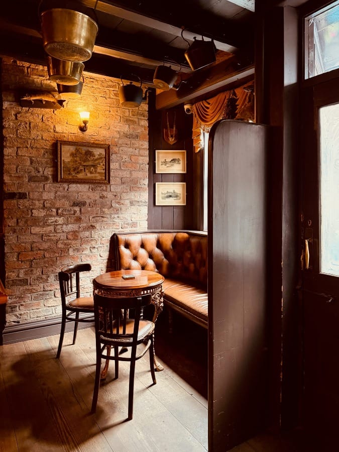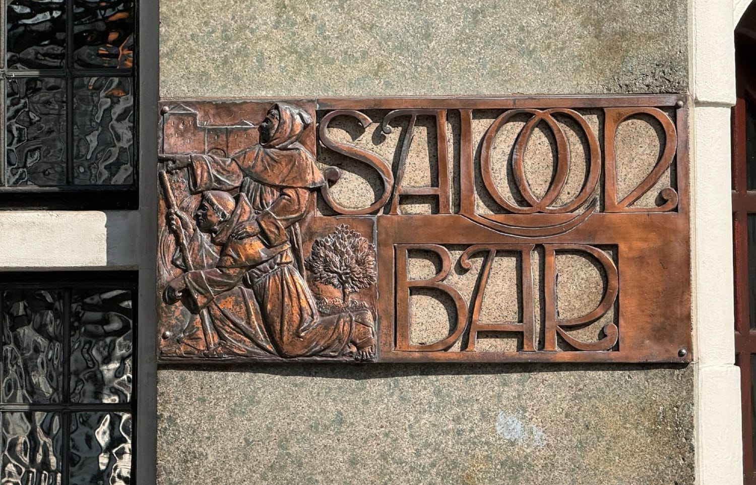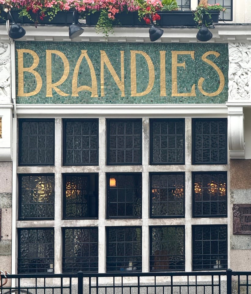 Whilst a merry monk leans from the corner of the building, around the bend the façade bursts into delight - golden mosaics gleam with the word Brandies, and brass signage, its lettering curled and lyrical, directs the passer-by toward the saloon bar.