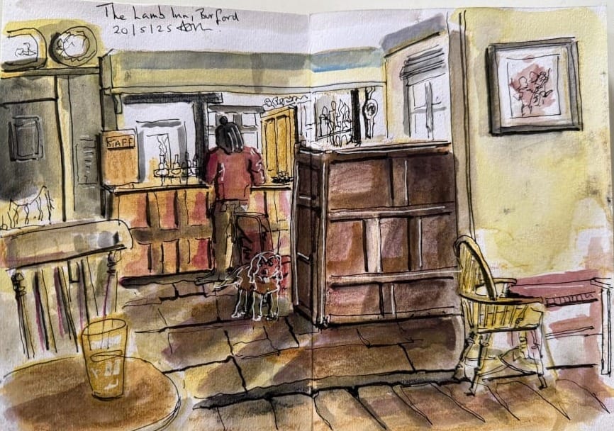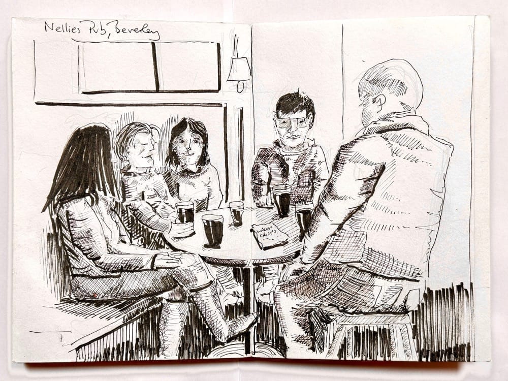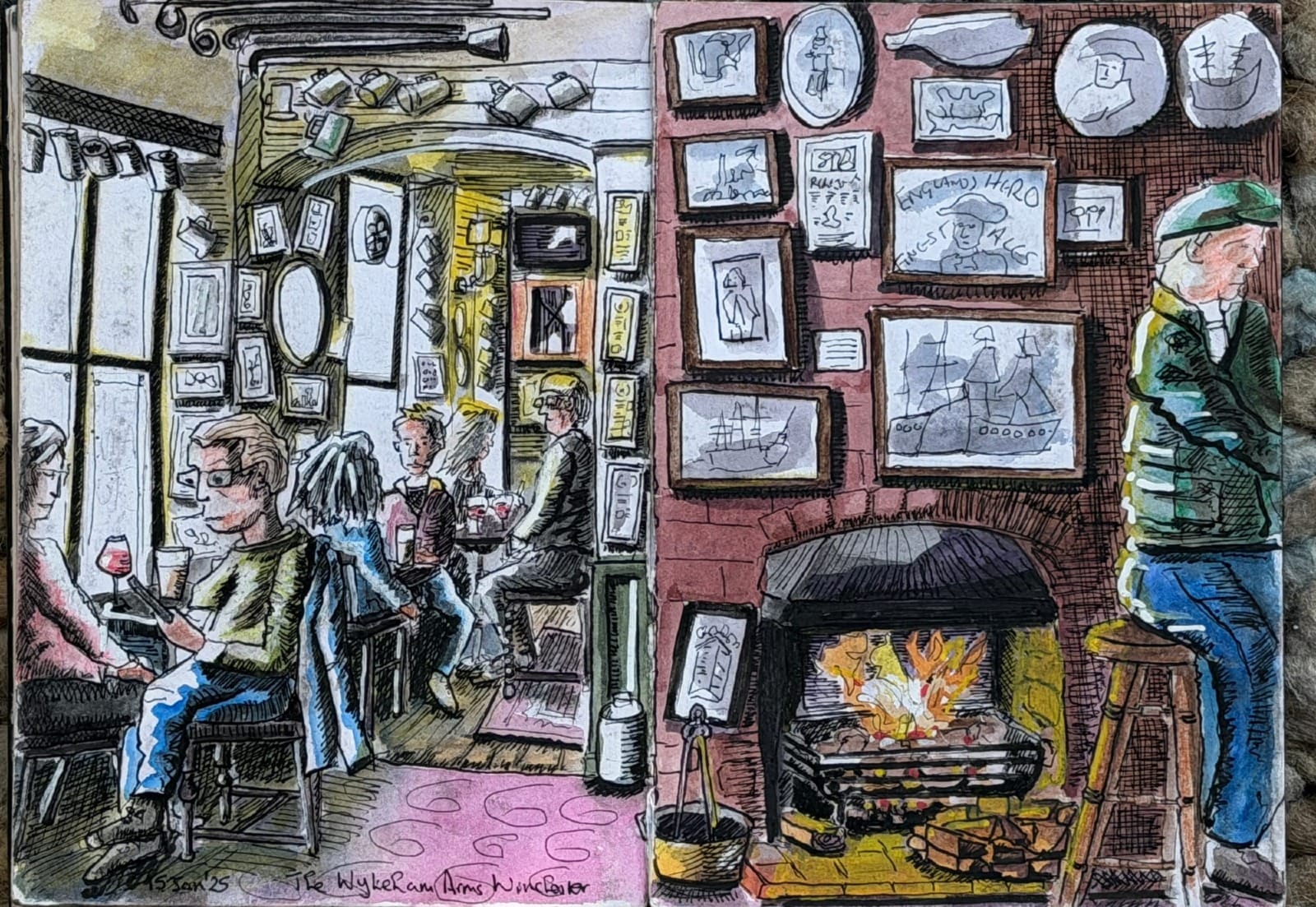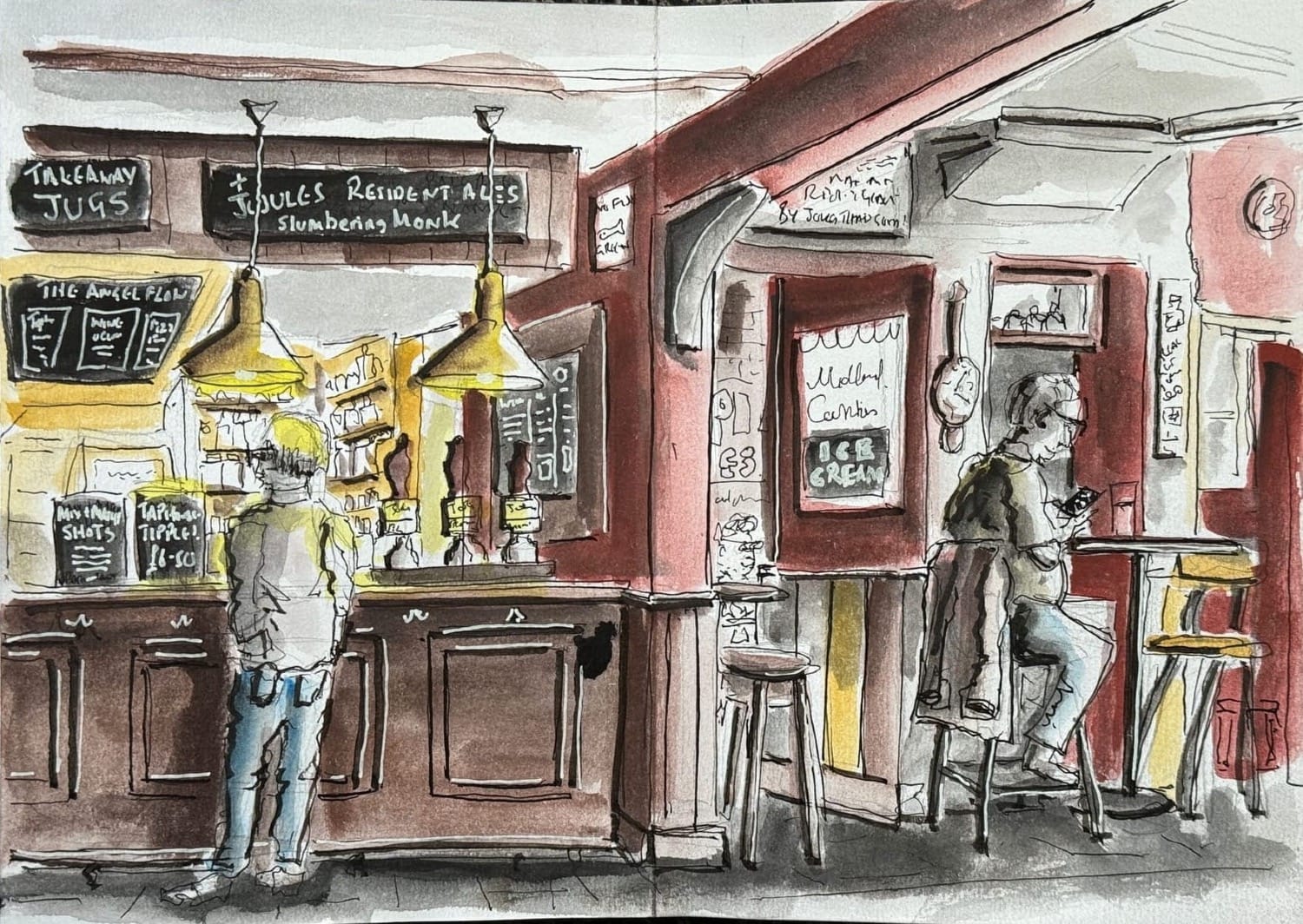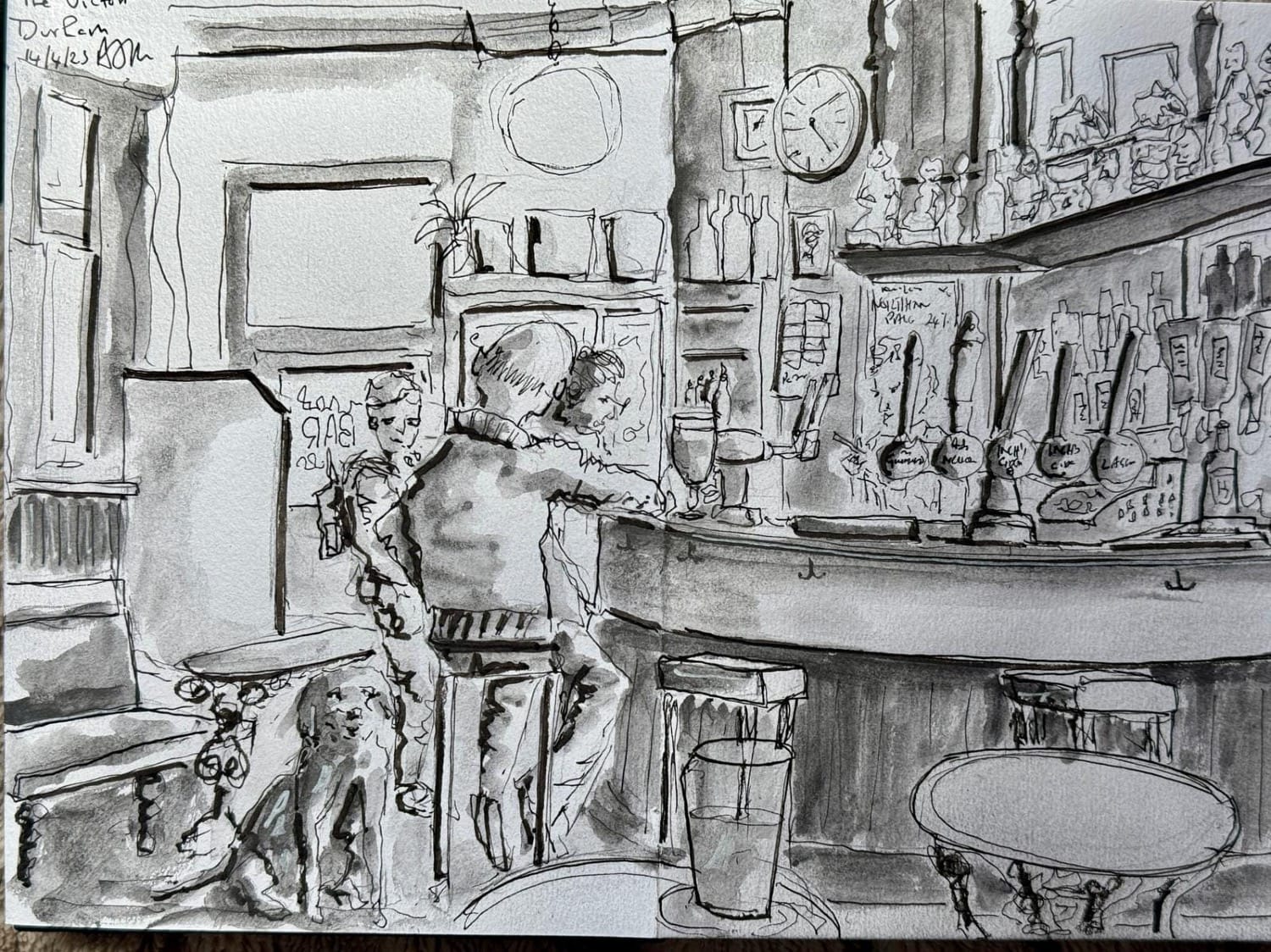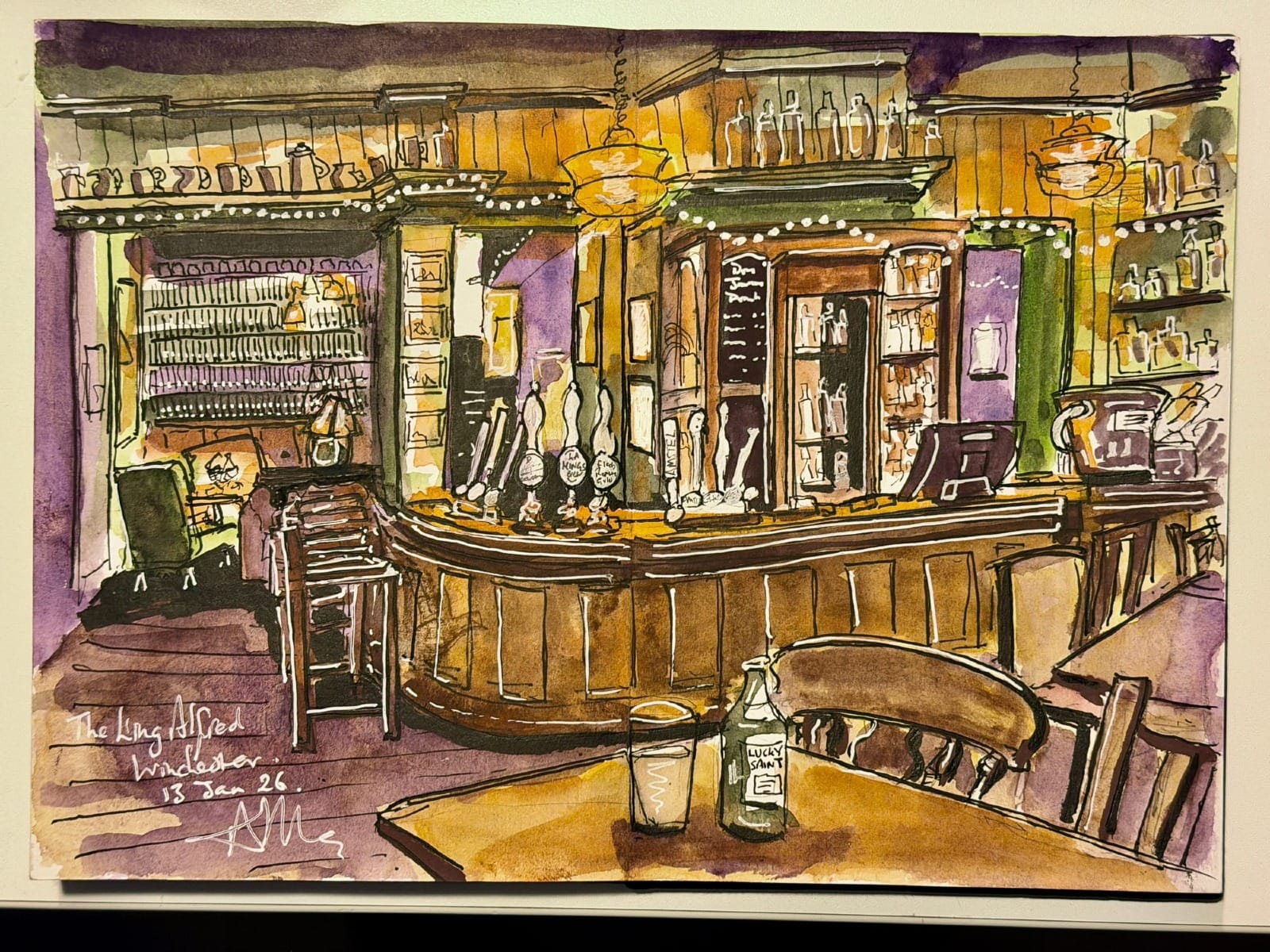 Inside the pub, the shift is immediate – warmth, welcome, timber and glass, food and drink. My shoulders drop. My hands come back to life. Before long I’m talking, then sketching – the interior slowly assembling itself on the page as my breathing steadies. The King Alfred holds me without ceremony.