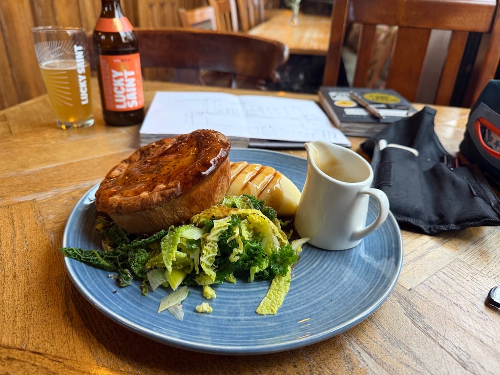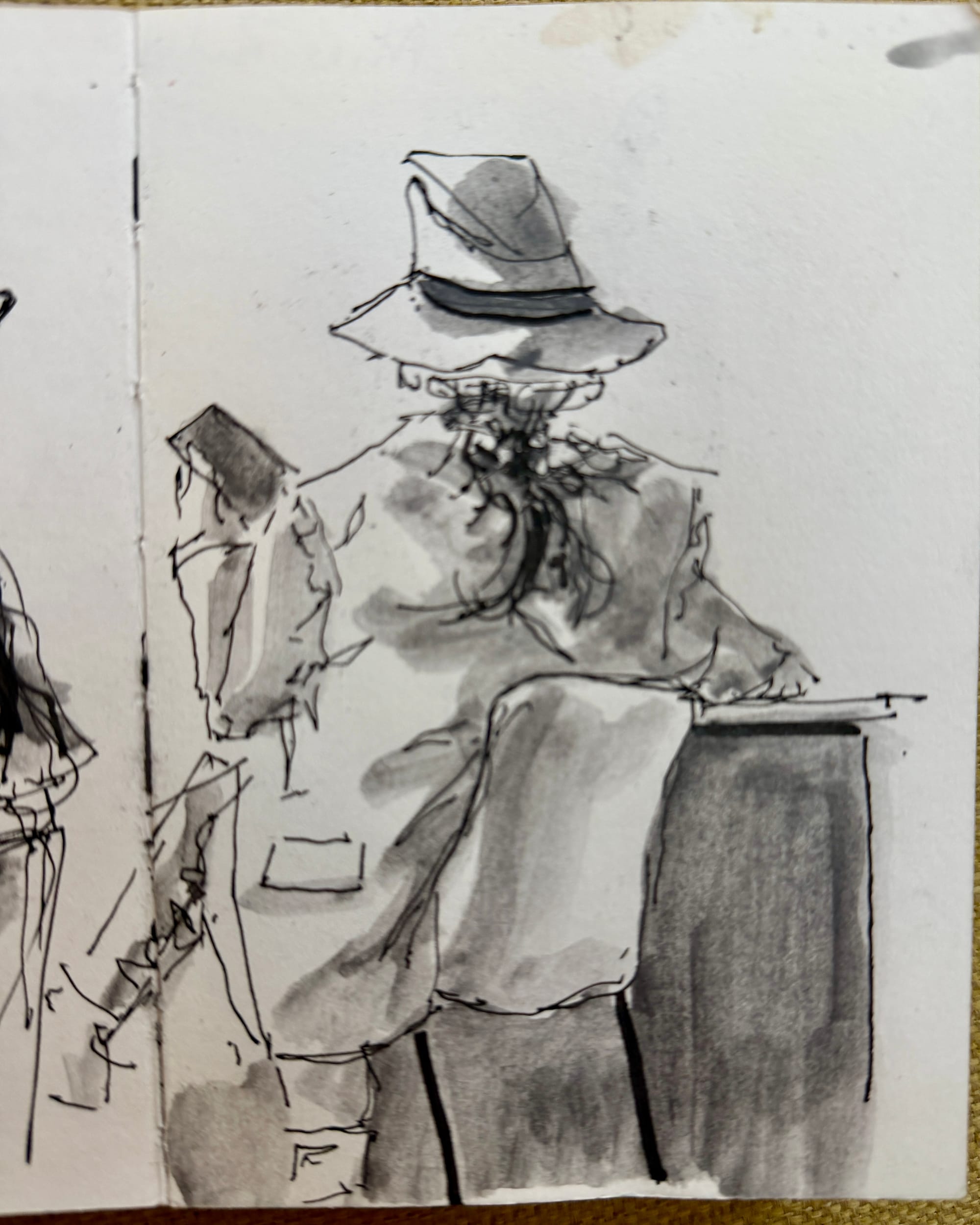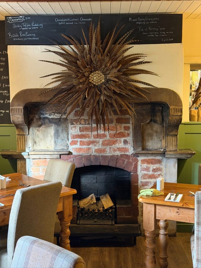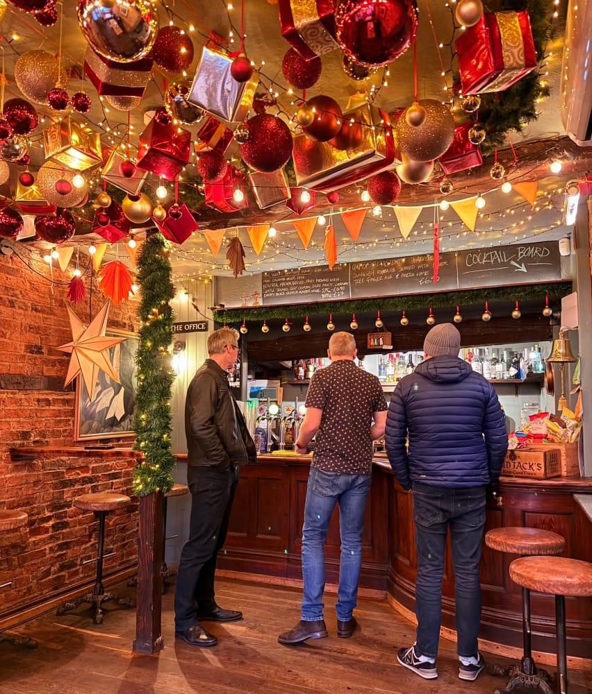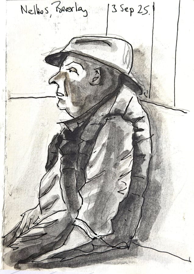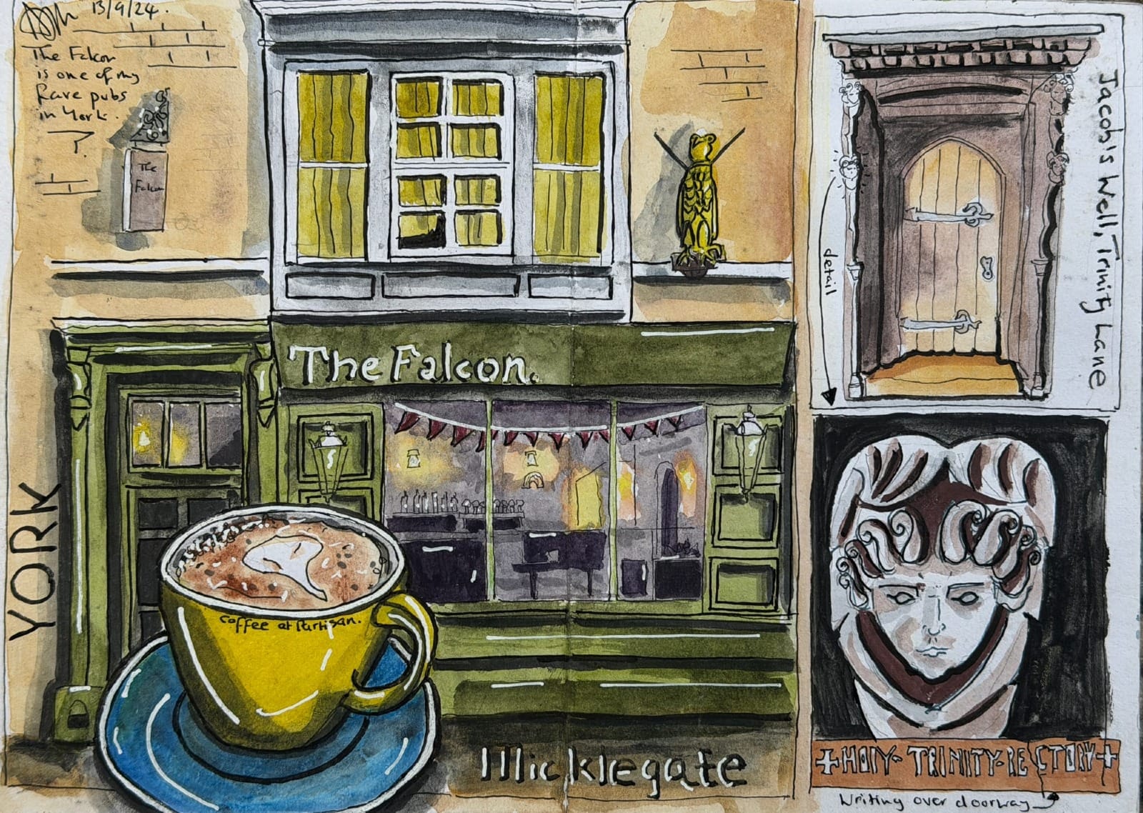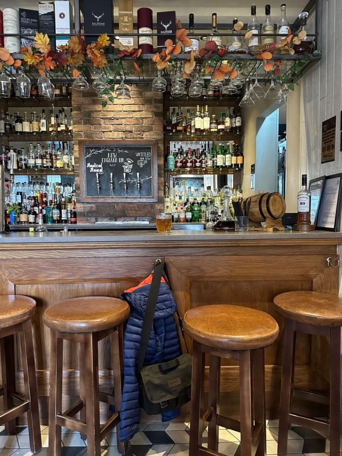Inside the pub, the shift is immediate – warmth, welcome, timber and glass, food and drink. My shoulders drop. My hands come back to life. Before long I’m talking, then sketching – the interior slowly assembling itself on the page as my breathing steadies. The King Alfred holds me without ceremony.