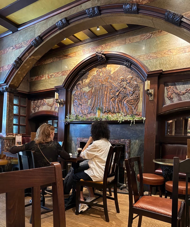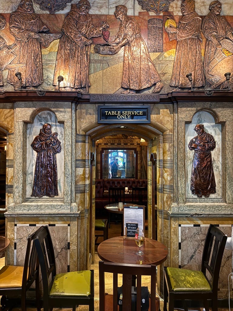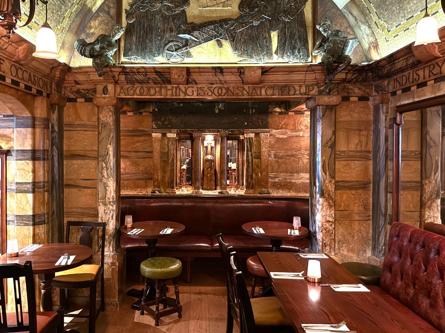Its exuberant copper repoussé panels were designed by sculptor Henry Poole RA and executed with metalworker Frederick T. Callcott, uniting skill and imagination in true Arts and Crafts spirit. Every surface - bronze, alabaster, mosaic, and marble - bears the mark of care and humour: cherubic friars brewing, feasting, and laughing beneath tongue-in-cheek mottos. A living pub and total artwork, the Black Friar celebrates fellowship, craftsmanship, and the handmade poetry of the Edwardian age.