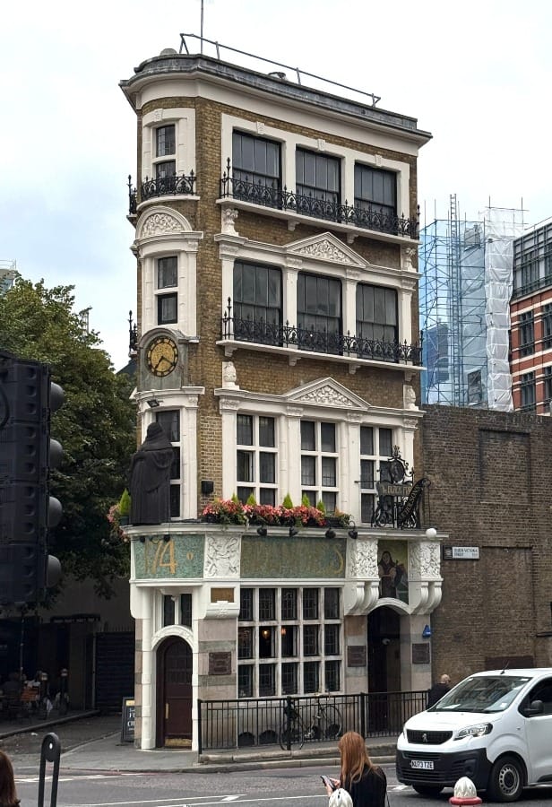 The exterior reminds me of the Flatiron Building in New York - that same bold, triangular thrust into the street, as if the pub itself were cutting through the fast stream of modernity, holding its ground while the city rushes by.