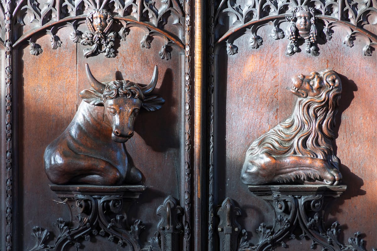 The door is early C18th and was carved by William Thornton. It depicts the figures of Matthew, Mark, Luke and John with the symbols below: an angel, a lion, a bull and an eagle. The other symbols represent the seasons of the year.