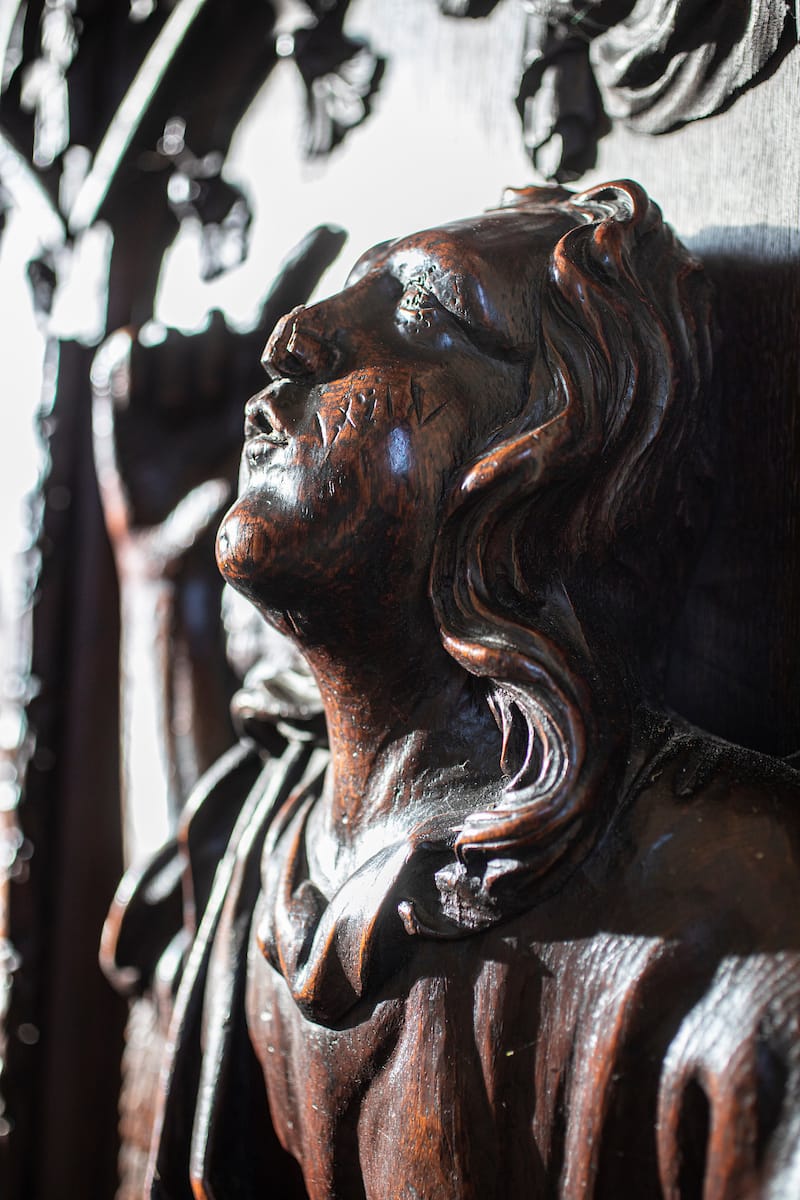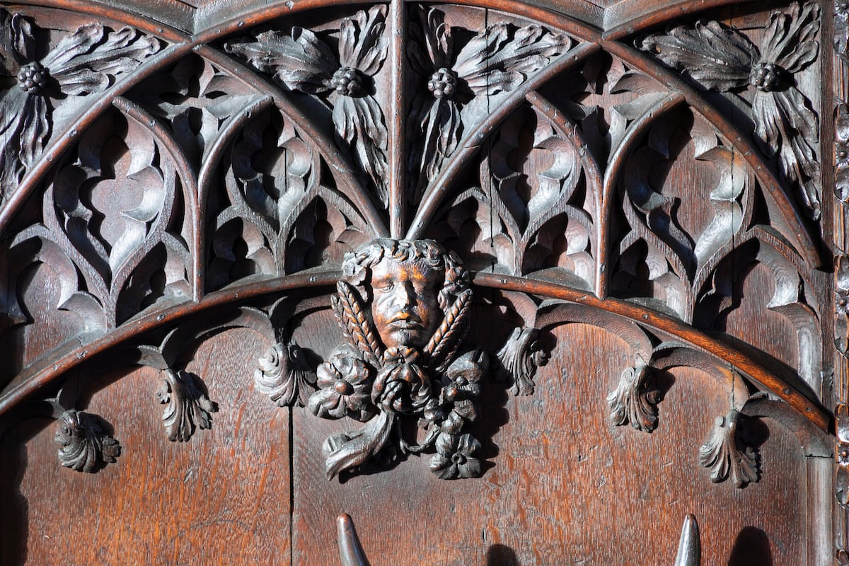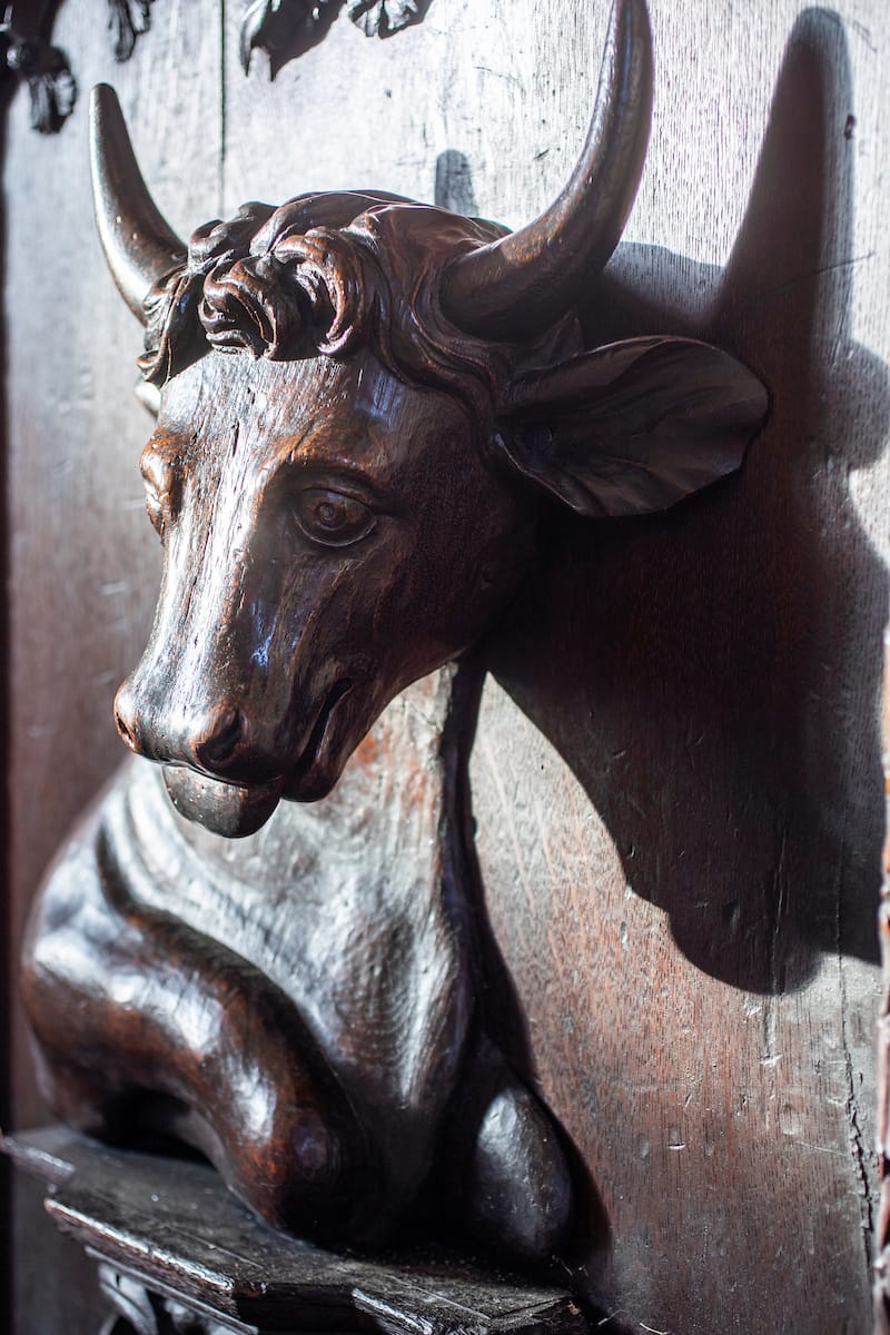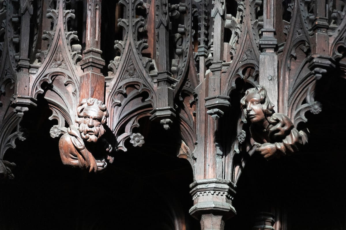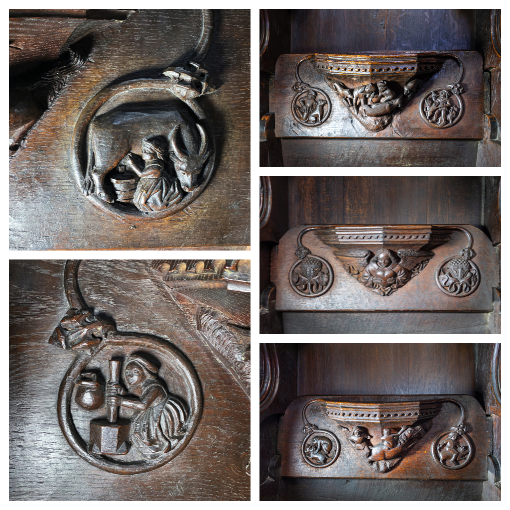 Misericords are little seats that fold up to relieve the misery of the choristers during a long service. They are often decorated with carvings depicting tales from the bible or bestiary.