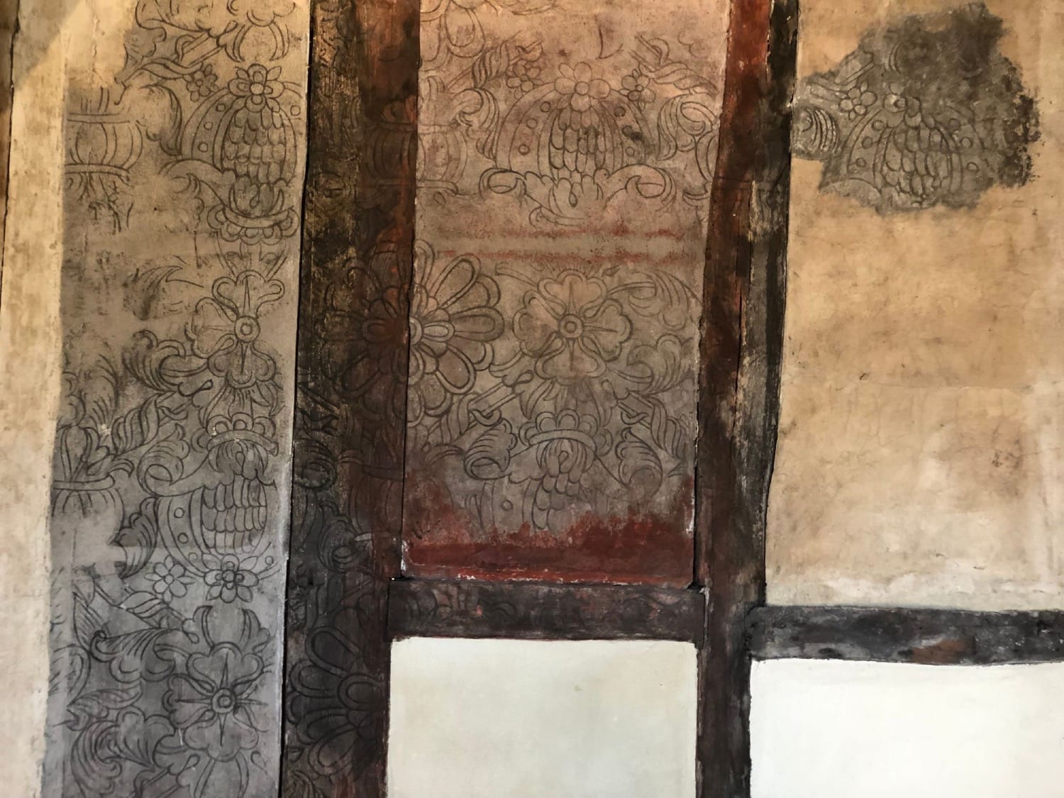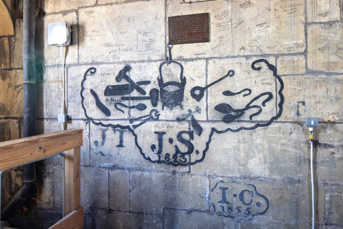 Graffiti in the tympanum room at Beverley Minster - depicting a lead roofer's tools painted on the walls in 1823 during the reign of King George IV.
