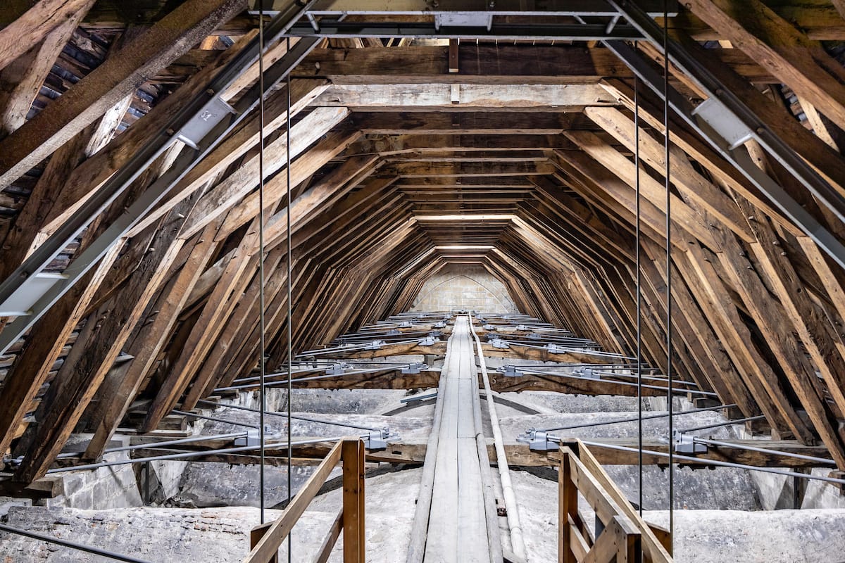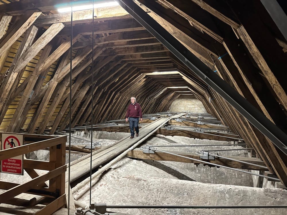 INSIDE THE MEDIEVAL ROOF TIMBERS AND OVER THE NAVE VAULTING