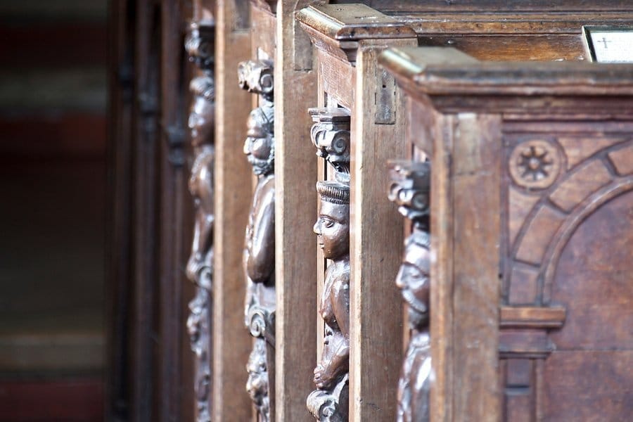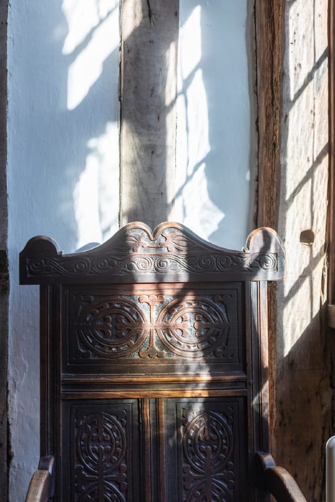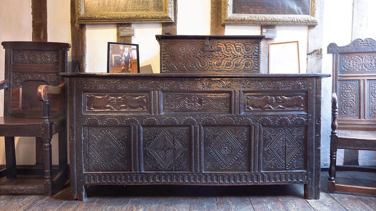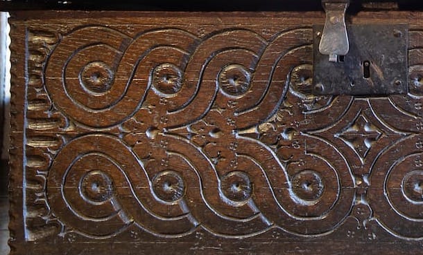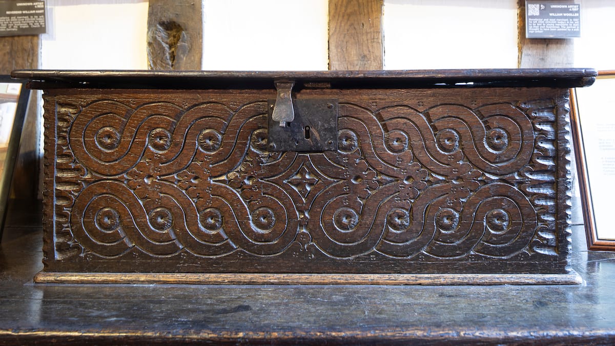 I’m at the Merchant Adventurers’ Hall, standing in front of a small chest adorned with a scrolling pattern. It feels like the work of a young person—there’s a freshness and naivety in its design. The undercutting is made with a touch of uncertainty, as though the carpenter, unsure of where the chisel might lead, was feeling their way through the wood.