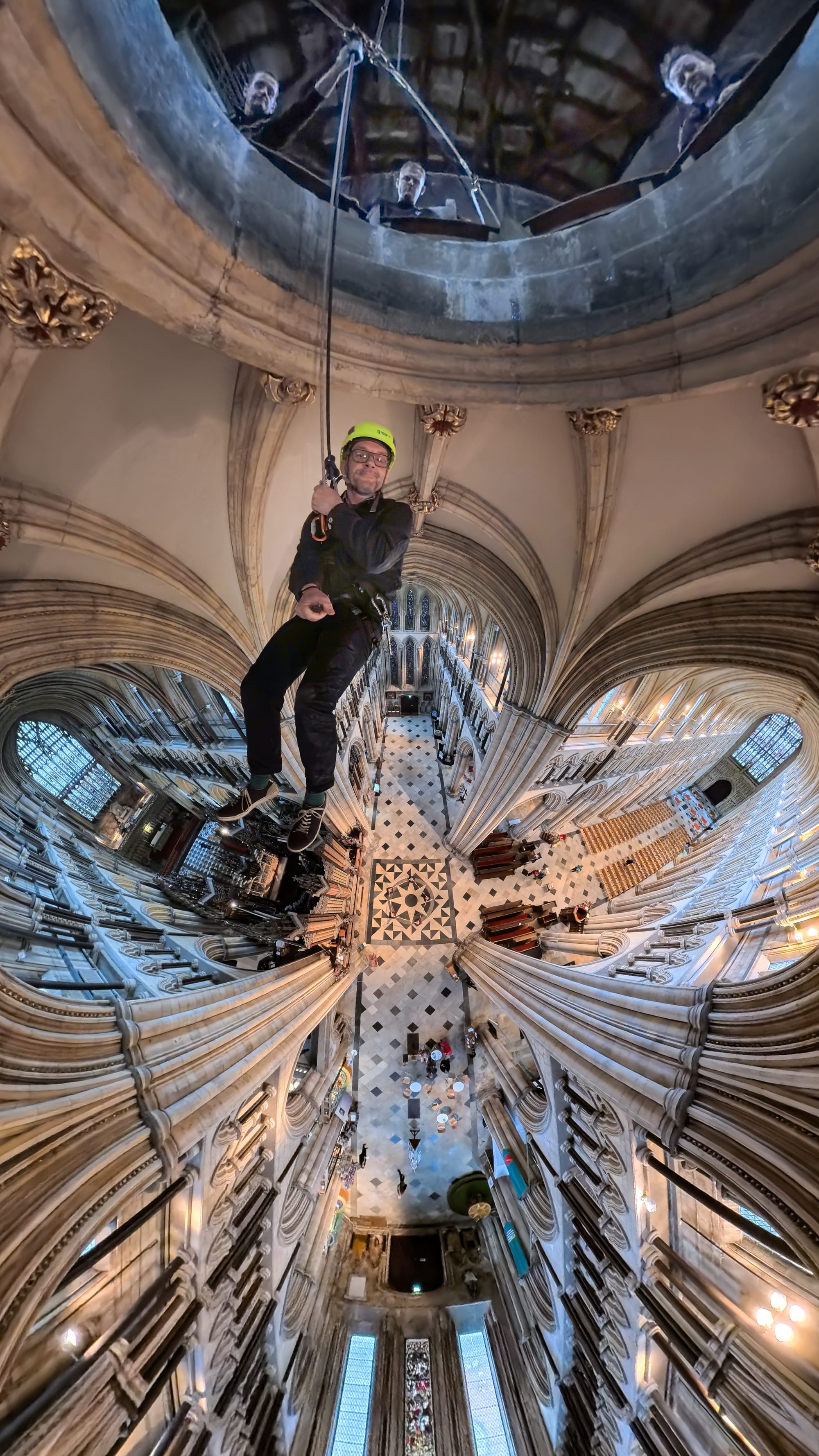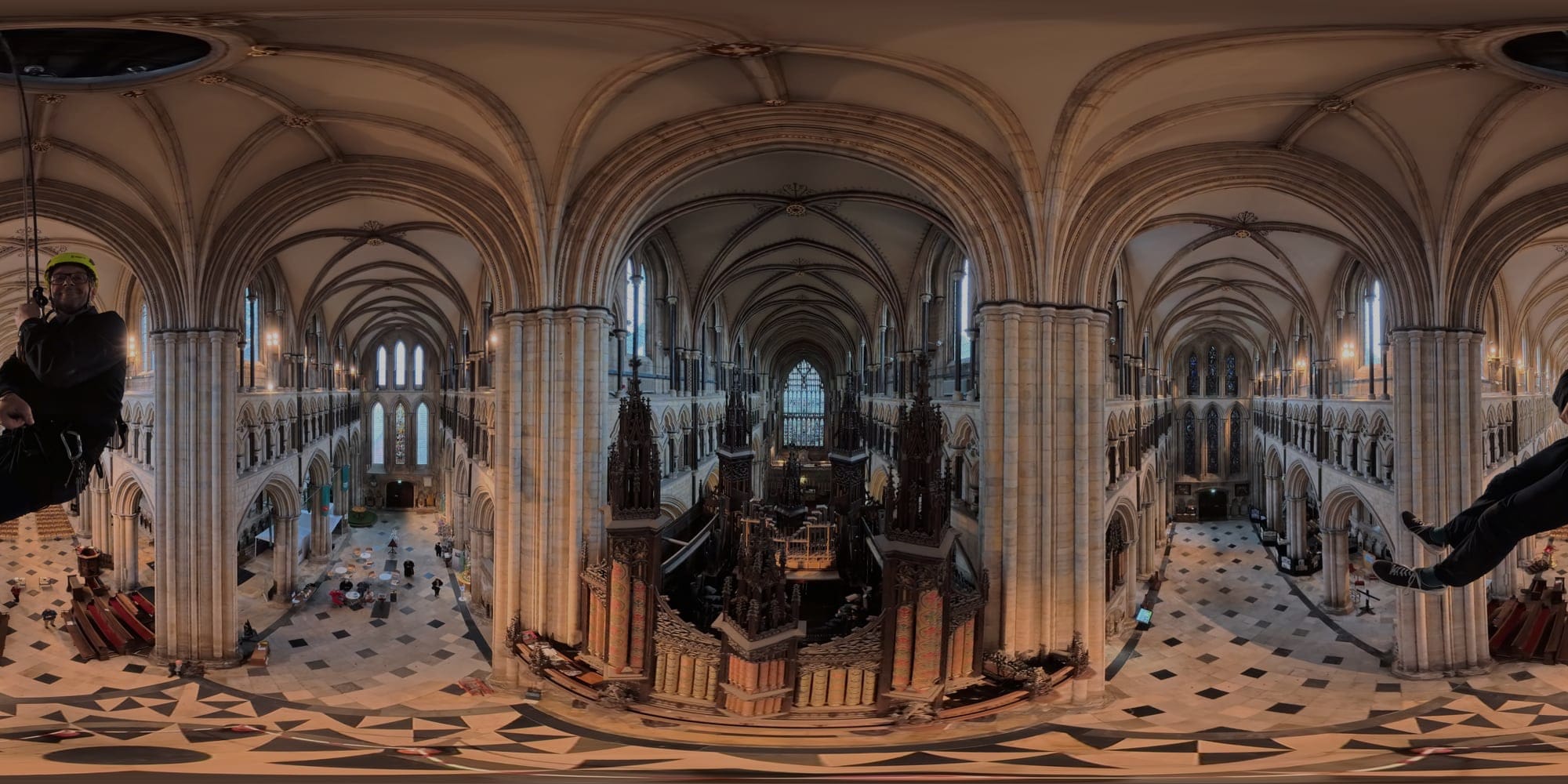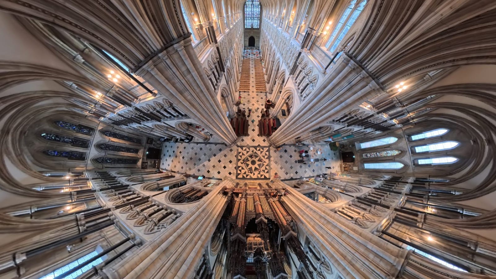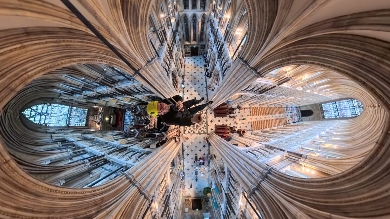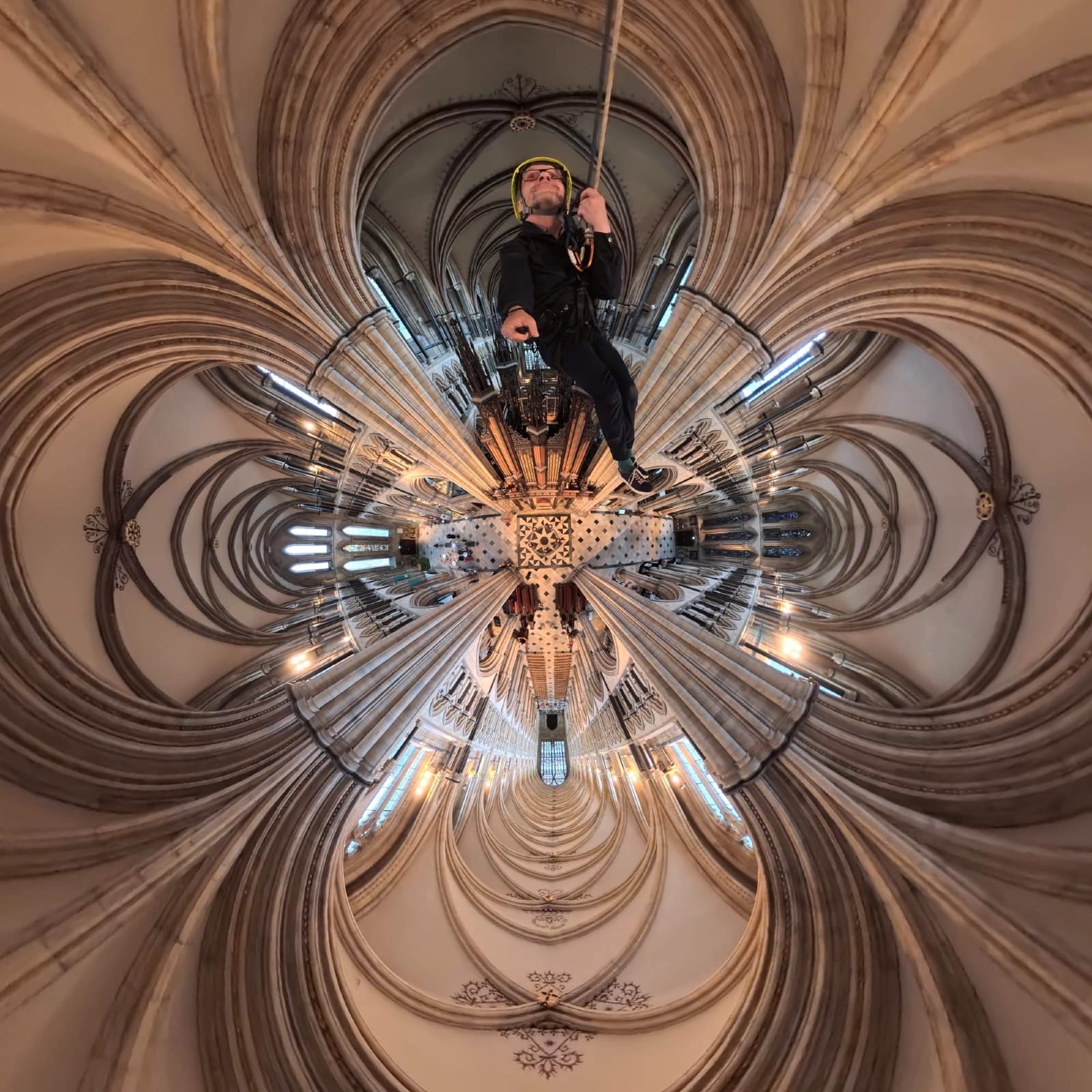 During my descent, there is a moment that stretches thinly. I turn slowly, and the whole Minster gathers itself before me in one sweeping gesture: geometry drawn taut from east to west, vaults and arcades rippling like concentric waves on water. The interventions that usually stopper my view from my earthly perspective - all gone. The building, stiffened by centuries, seems alive and full of motion, yet time is held in perfect stillness.
