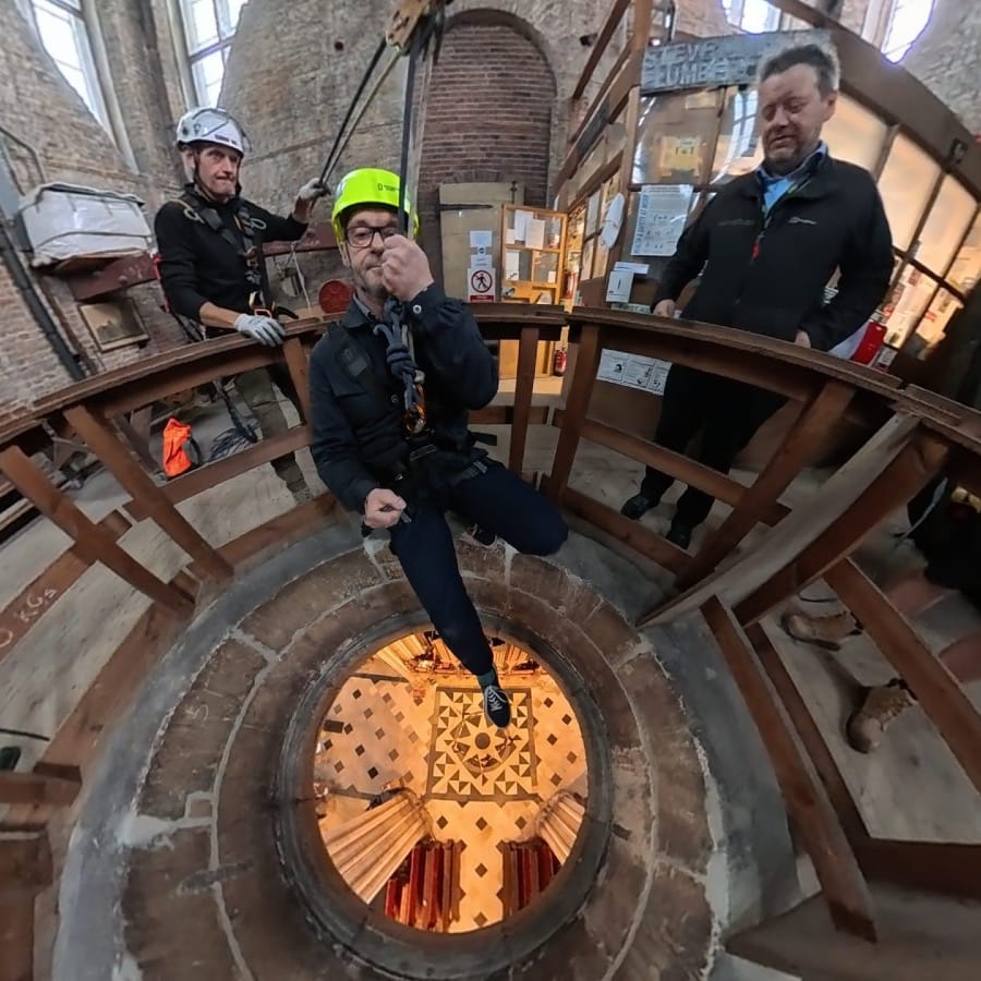 As part of a day of training for emergency evacuation of people from the roof tower, I stand on the lip of the void to the roof boss that has been hoisted upwards and sideways to reveal the most gut-wrenching, yet mesmerising view of the world below. Next to me, the boss is the size of a dinner table – but from the tower crossing far below, it appears no more than a tiny dot.