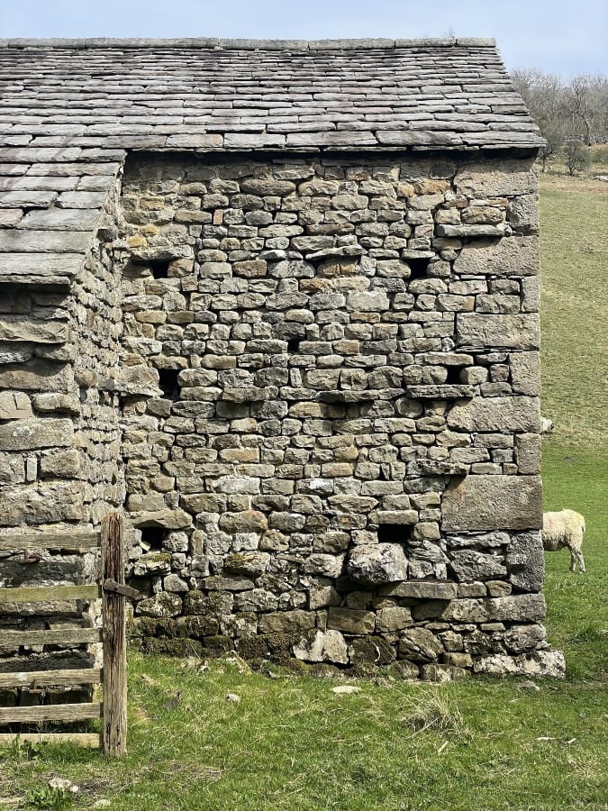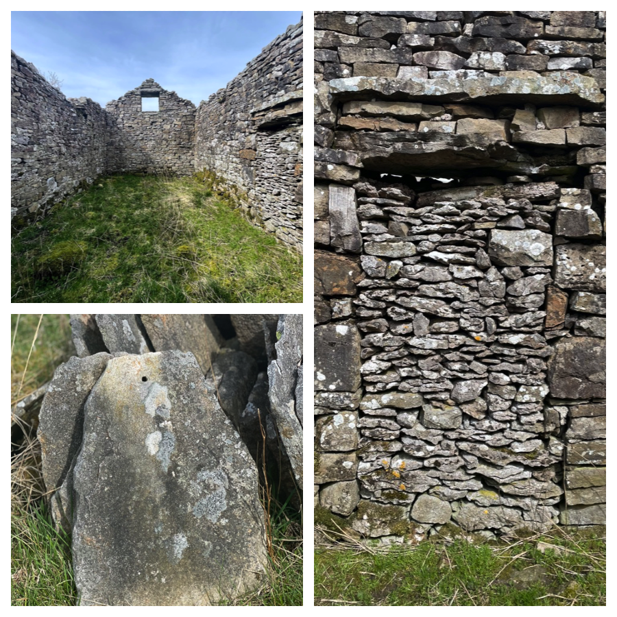It’s a curious feeling: there’s a need to scour the detritus for clues of human occupancy. I concoct a story by scanning the standing stones. A door has been blocked with infill. A stack of stone slates stands outside in random sizes. There are linear grass bumps where purlins have fallen. The through stones are enamelled in moss. There’s a shrinking of its purpose. I notice another laithe further along the scarp. It’s in pristine condition and I realise that the derelict building in which I’m standing is sacrificial; it is resurrected in stops and starts, in stone patches and roof parts, in its cousin up the brew.