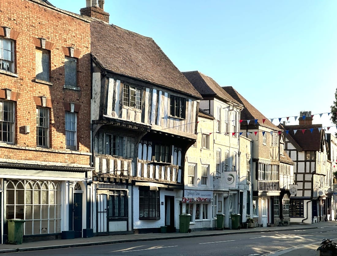 The raking light reveals the delightful nested complexity and golden patina of the streets of Tewkesbury