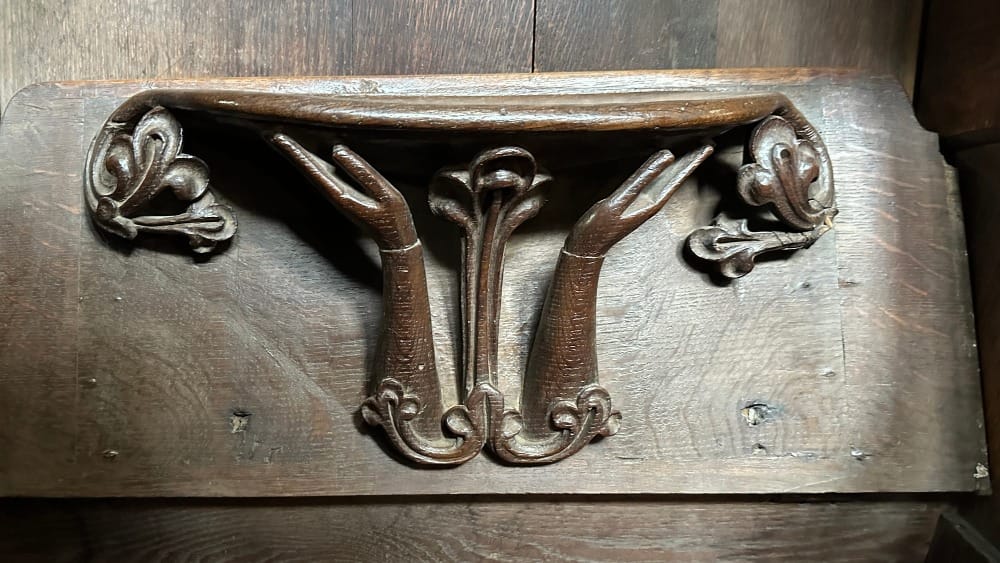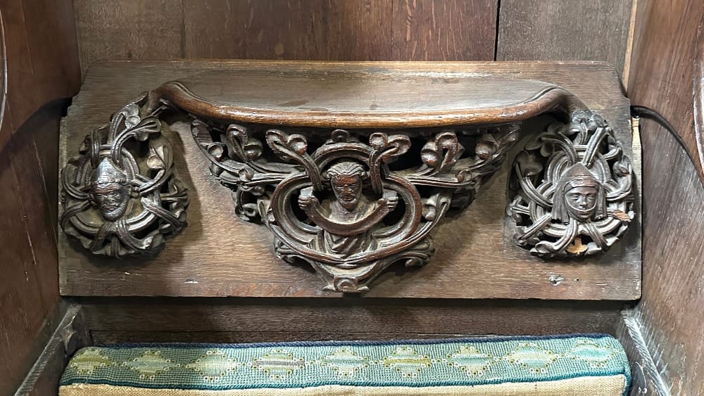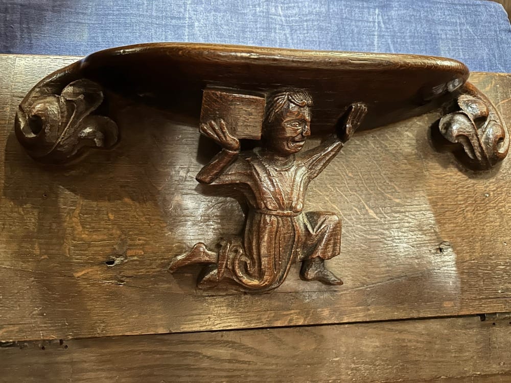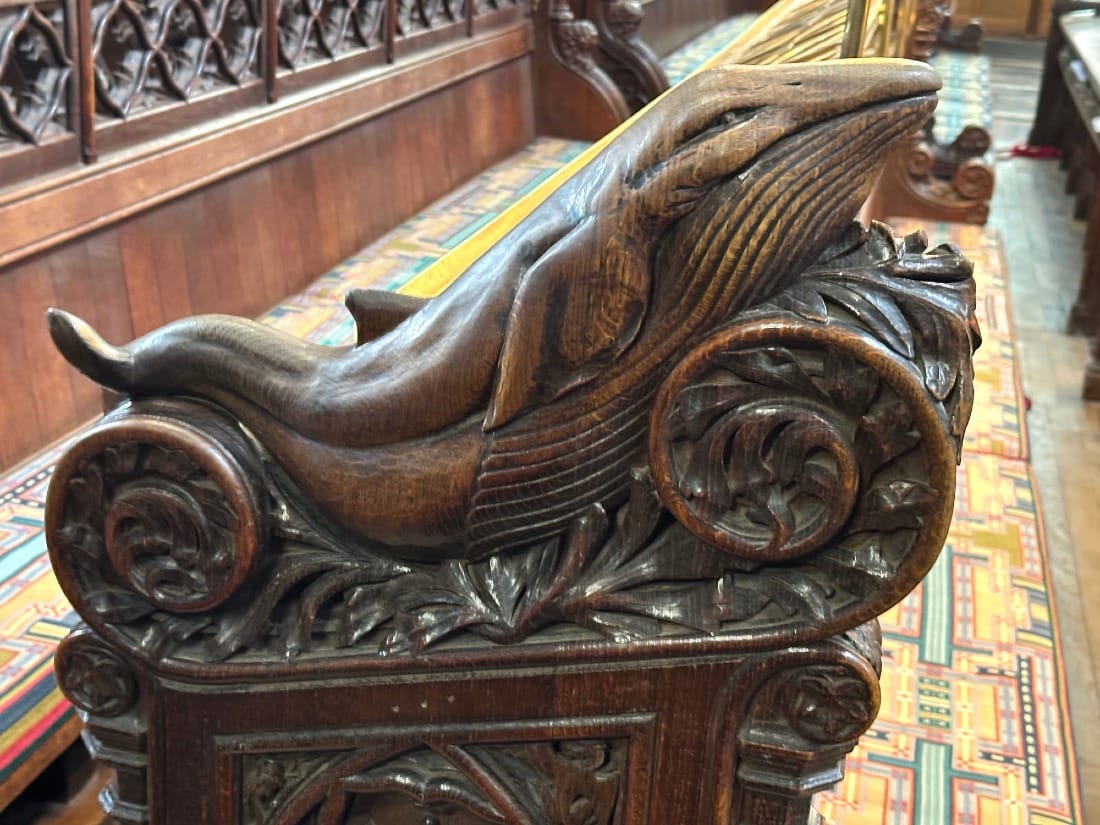 I’m mesmerised by it. The carving is a breathtakingly beautiful, organic embodiment of a whale. The genius lies in the creator’s ability to convey the fluidity and vitality of a living creature within the stillness of wood, capturing the essence of movement and life force in an otherwise lifeless form. The bench end is richly layered with meaning: a religious symbol, a nod towards our inherent love of nature, a reminder of the majesty and mystery of the ocean, an emblem of strength and endurance, and a tribute to the artisan’s skill and imagination.