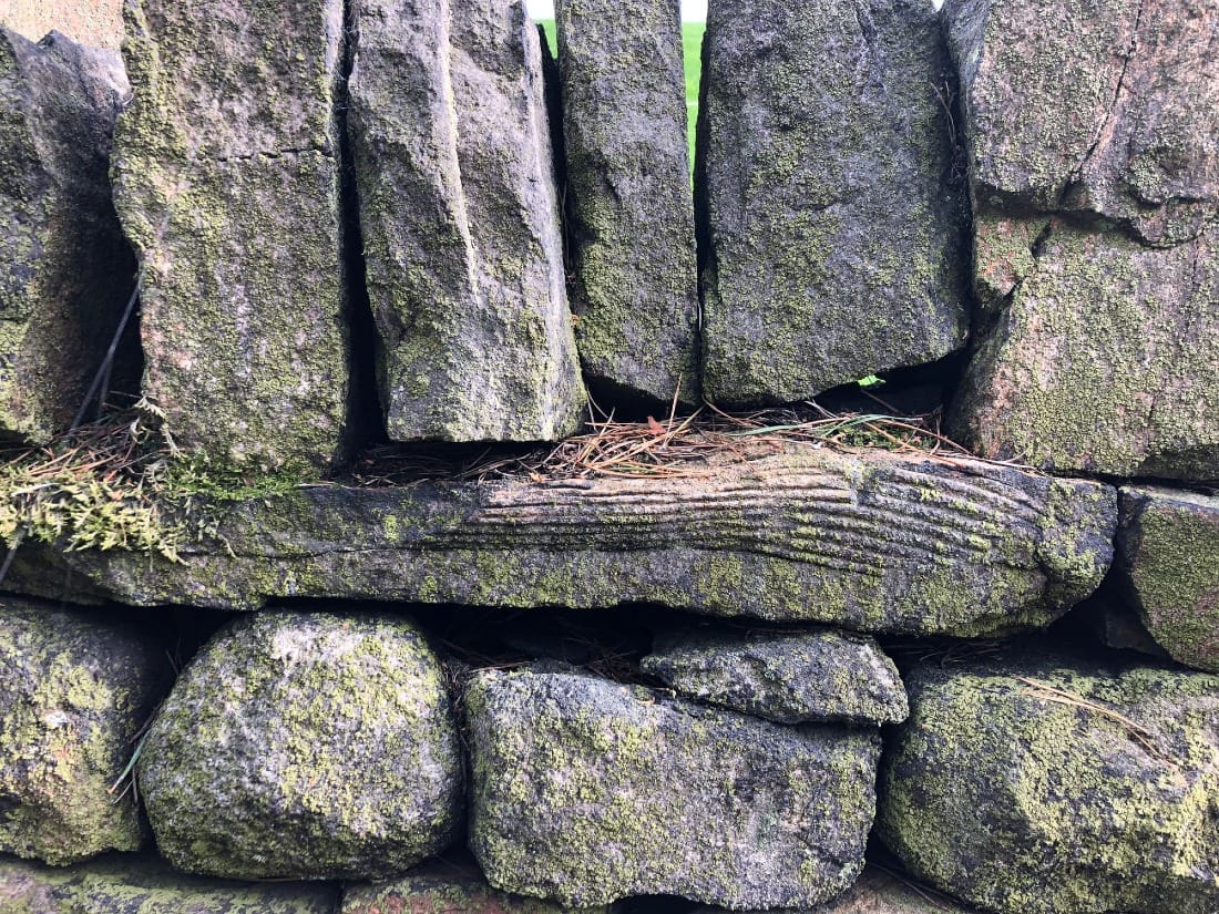 As I sit and observe the whale, touch the curve of its back and the grooves along its belly, it spins out another thread that is a springboard to a previous time in my life. I find myself on a designated walk in the first Covid lockdown. I’m up on a bluff near the Cheesden Valley where, amidst a horrendous moment of anxiety and worry, I find comfort within the pattern of a single stone set within a dry stone wall.