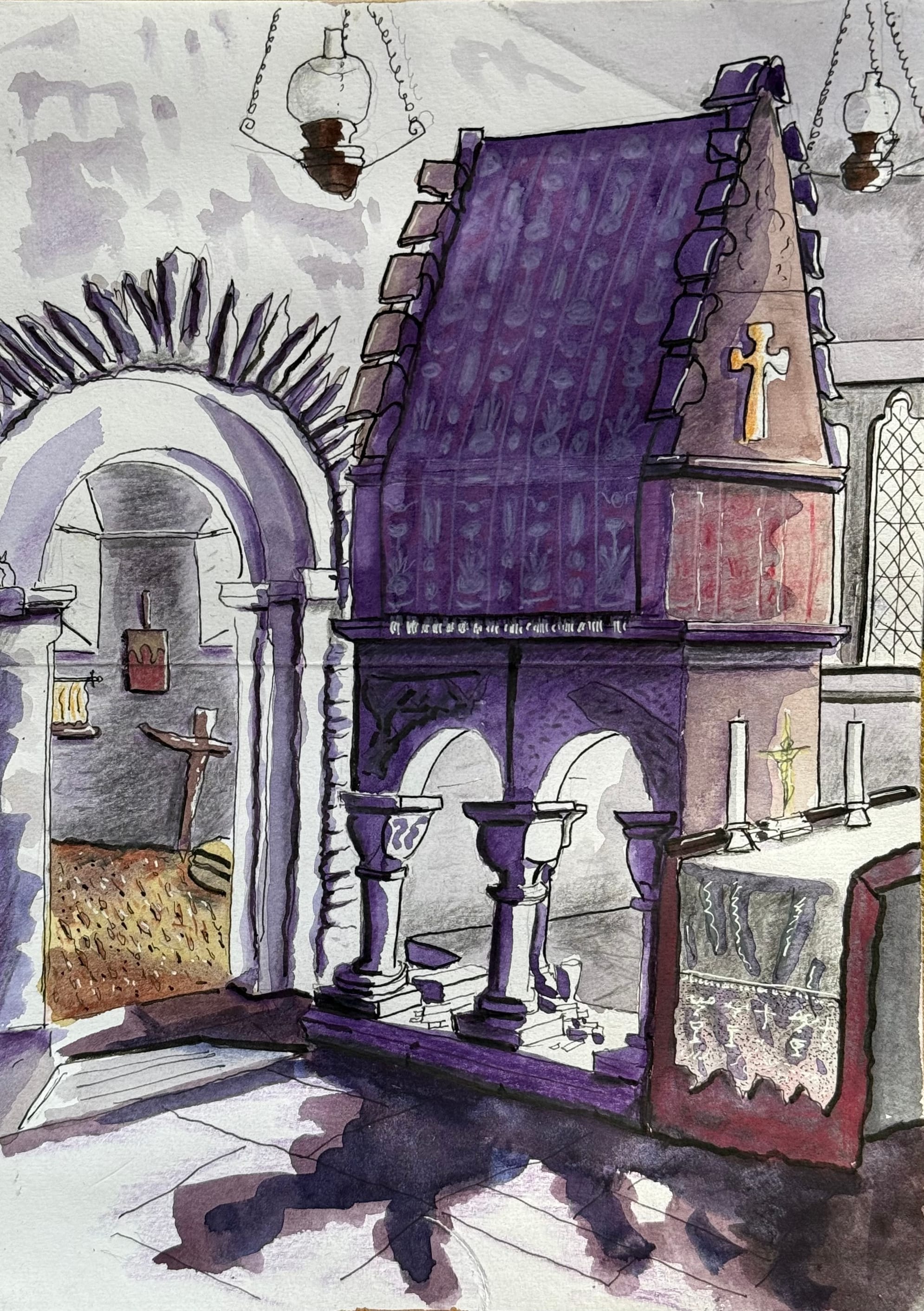 This space, with its textures drained, the contre-jour, the purplest of chiaroscuro, has passed the baton on to my imagination. I hover between the material and the intangible: this history, this shrine, this valley, this sketch are conduits to the ephemeral - making a sanctuary of the here and now by thinning out the boundary between heaven and earth.