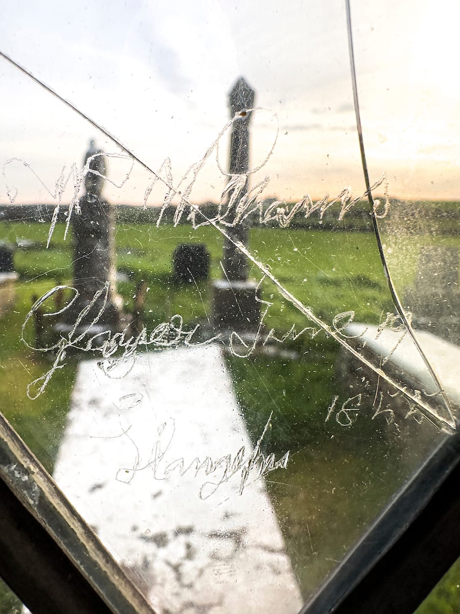 Later, I enter the church of St. Mary looking for more companionship, but it’s empty. The nave is voluminous, cathedral like and I feel small within its embrace, until something catches my eye: deep cut marks upon a column in the arcade. I can see hatchings and symbols and what looks like Gothic script.