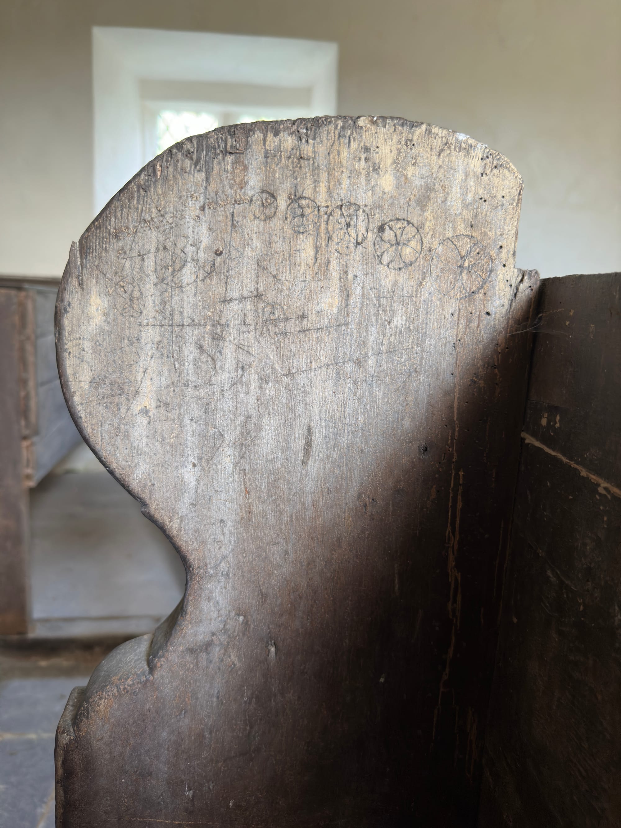 I pick up a pamphlet which takes me into the church tower. I look up at the north wall and suddenly I don’t feel so lonely. It’s full of writing from the people of the past.