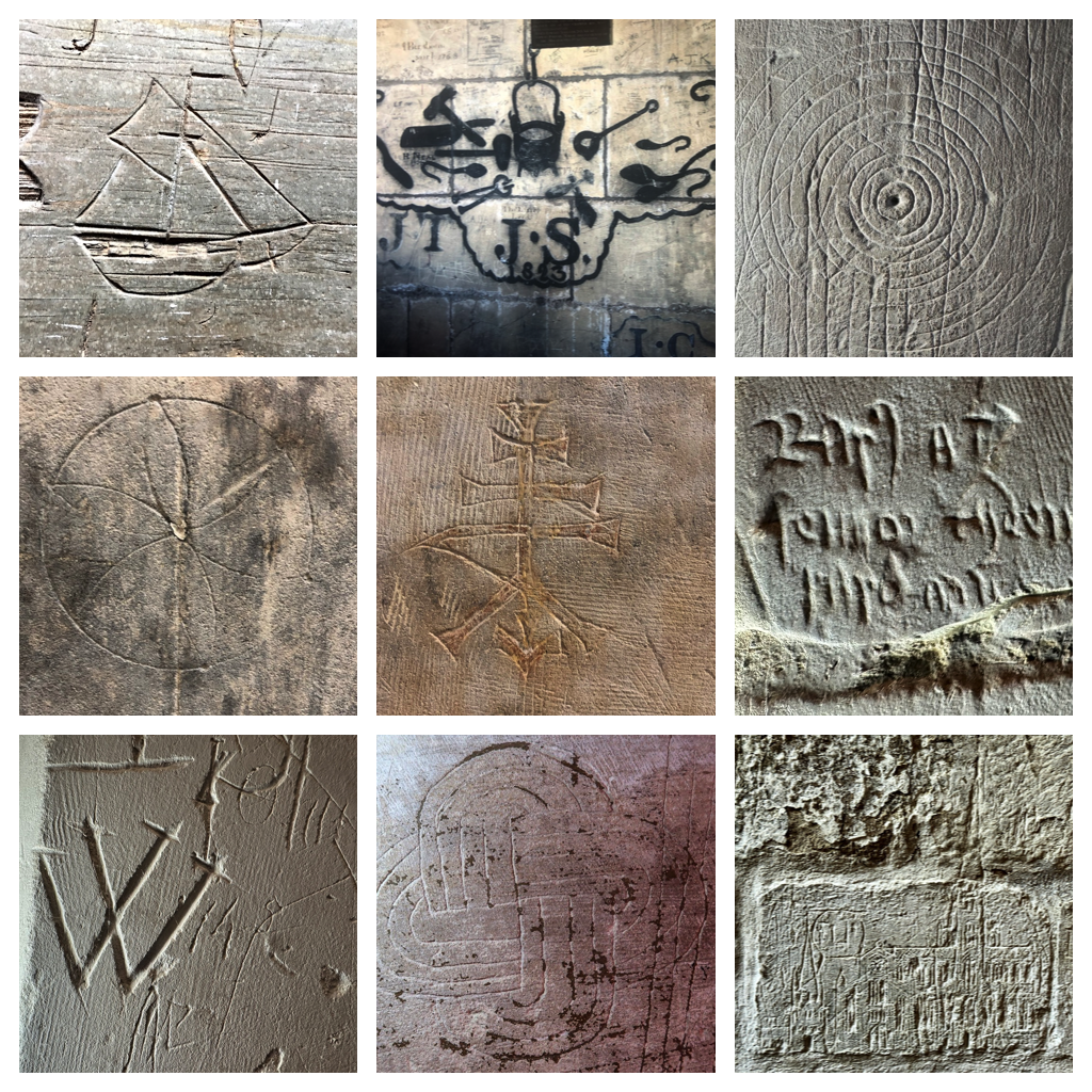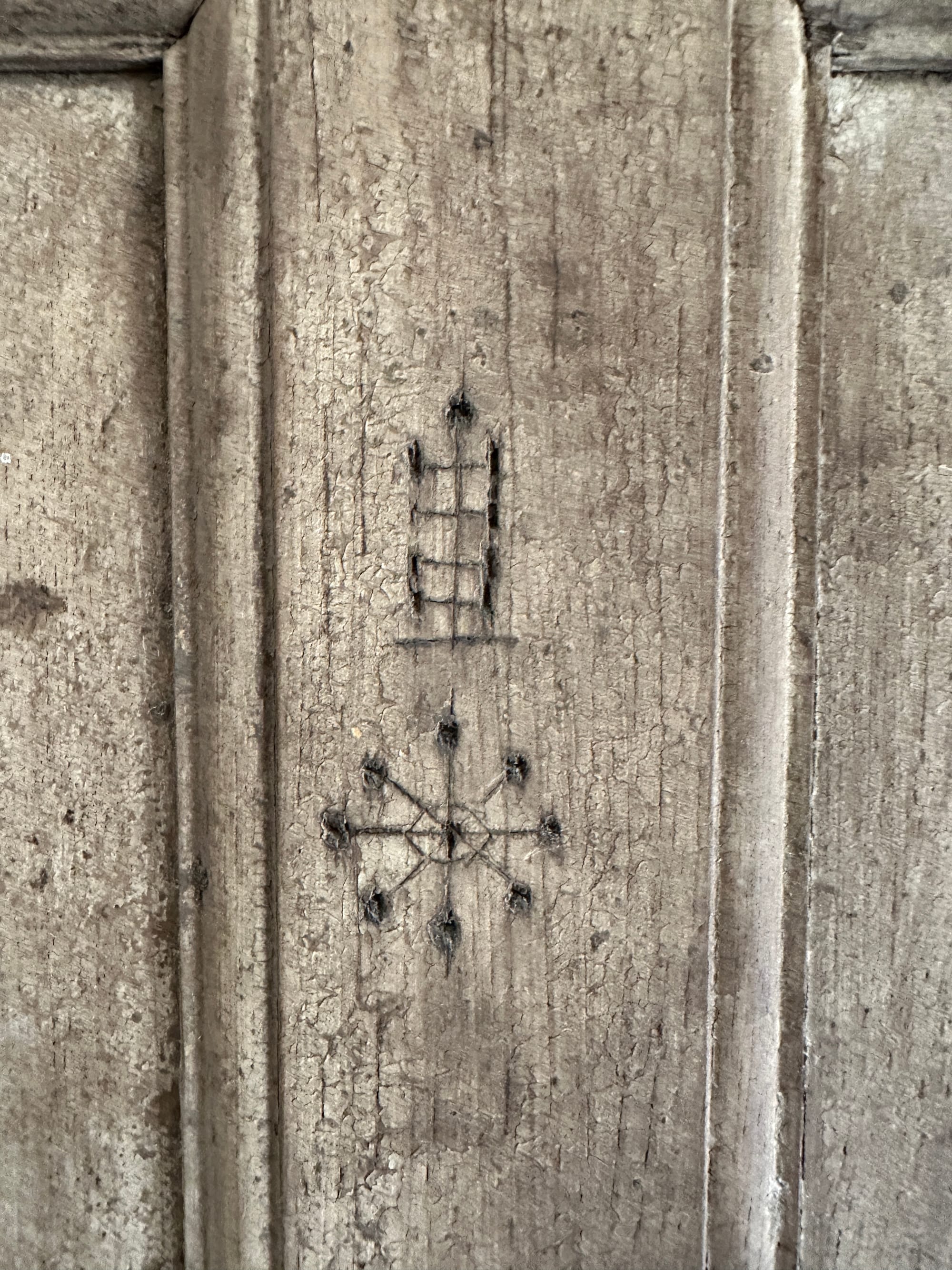 Become A MemberA little earlier than my visit to Ashwell - I find myself discovering more mark making in two churches in Anglesey. They are mostly symbols that are said to be 'evil warding' - protective of space and place and people. Some are simply made by people who want to mark an event, or pride in their craft.