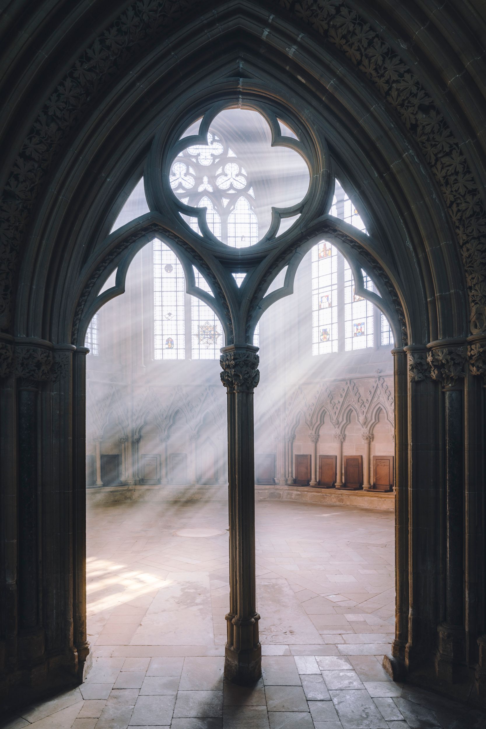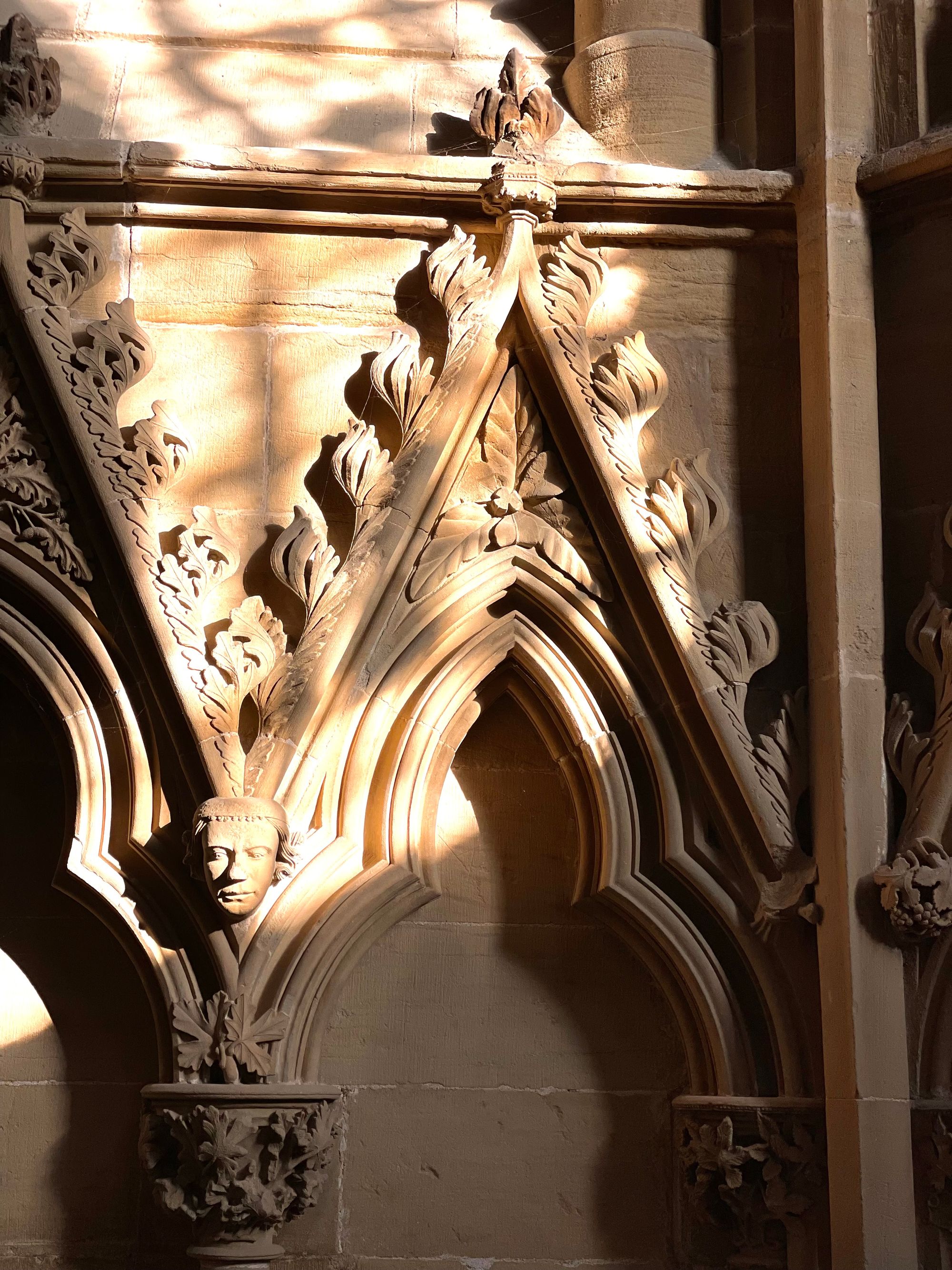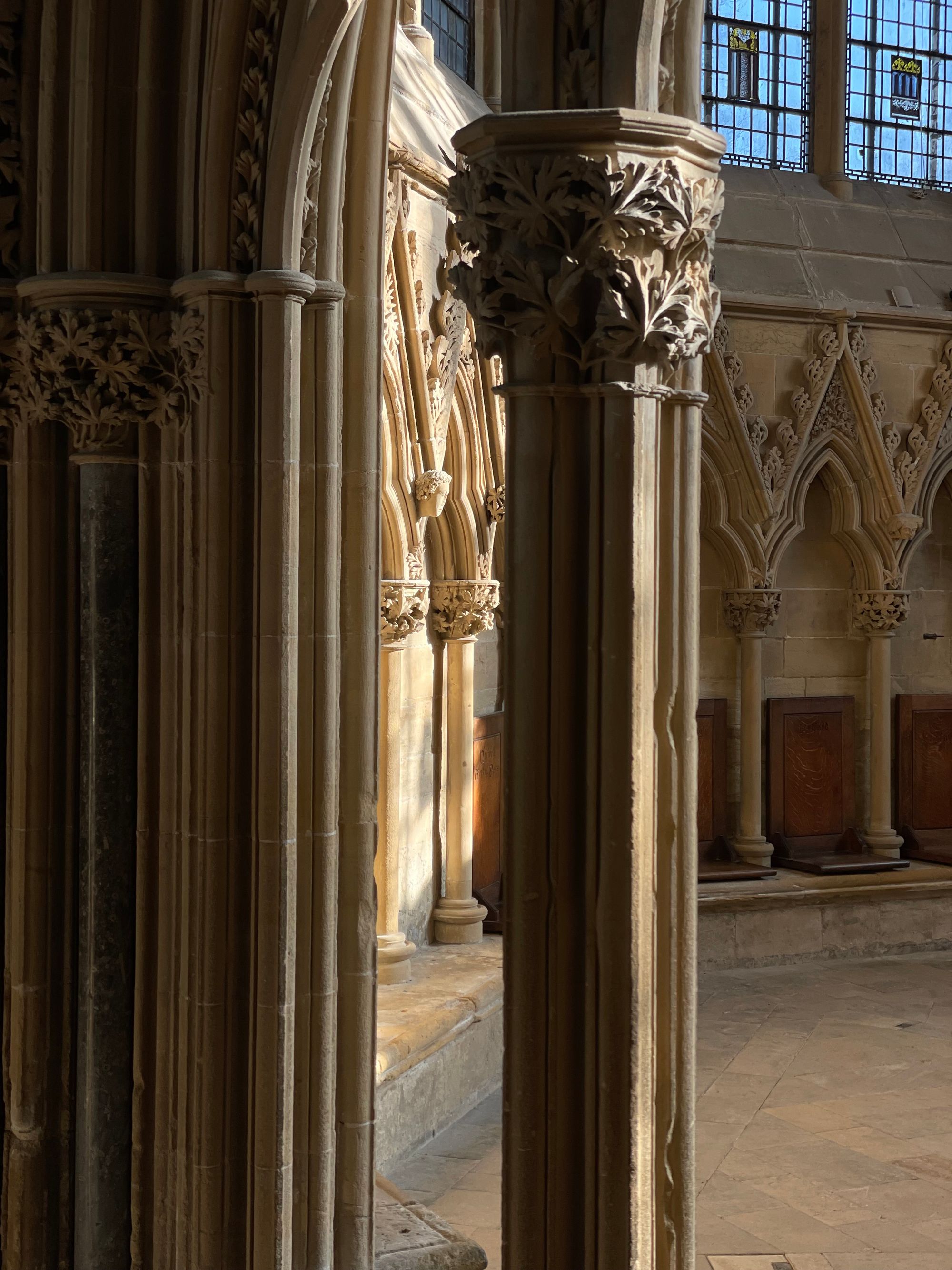 The early morning light is dancing around the stone carvings. The intricately sculptured leaves render this space a marvel of the Gothic genre.