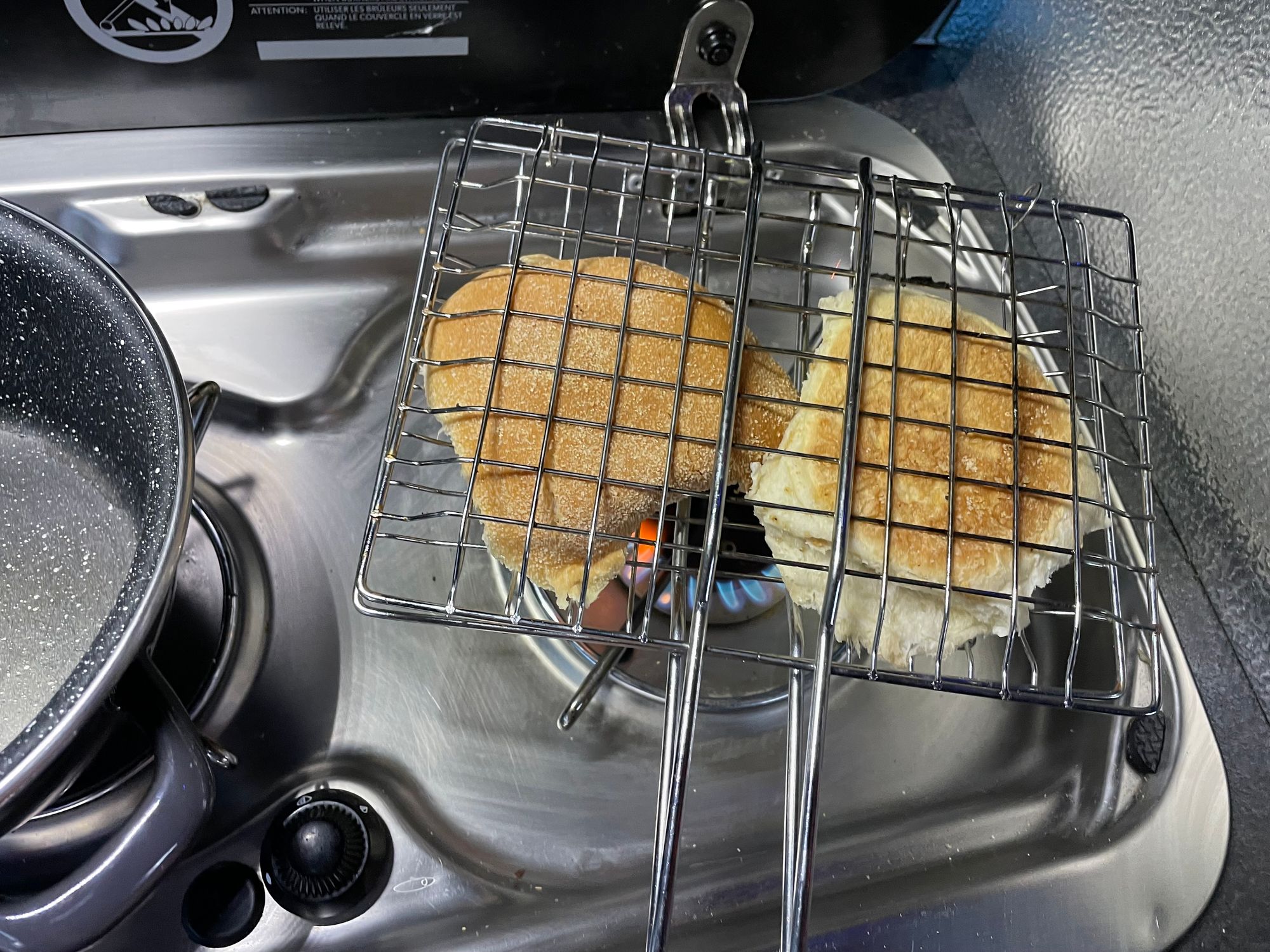 CLICK HERE TO GO FOR A SCROLL...The van can be hooked up to 240v electricity which will run a normal toaster - but when it's off-grid, I find this wire rack really useful. Great for roasting vegetables etc over a fire too.
