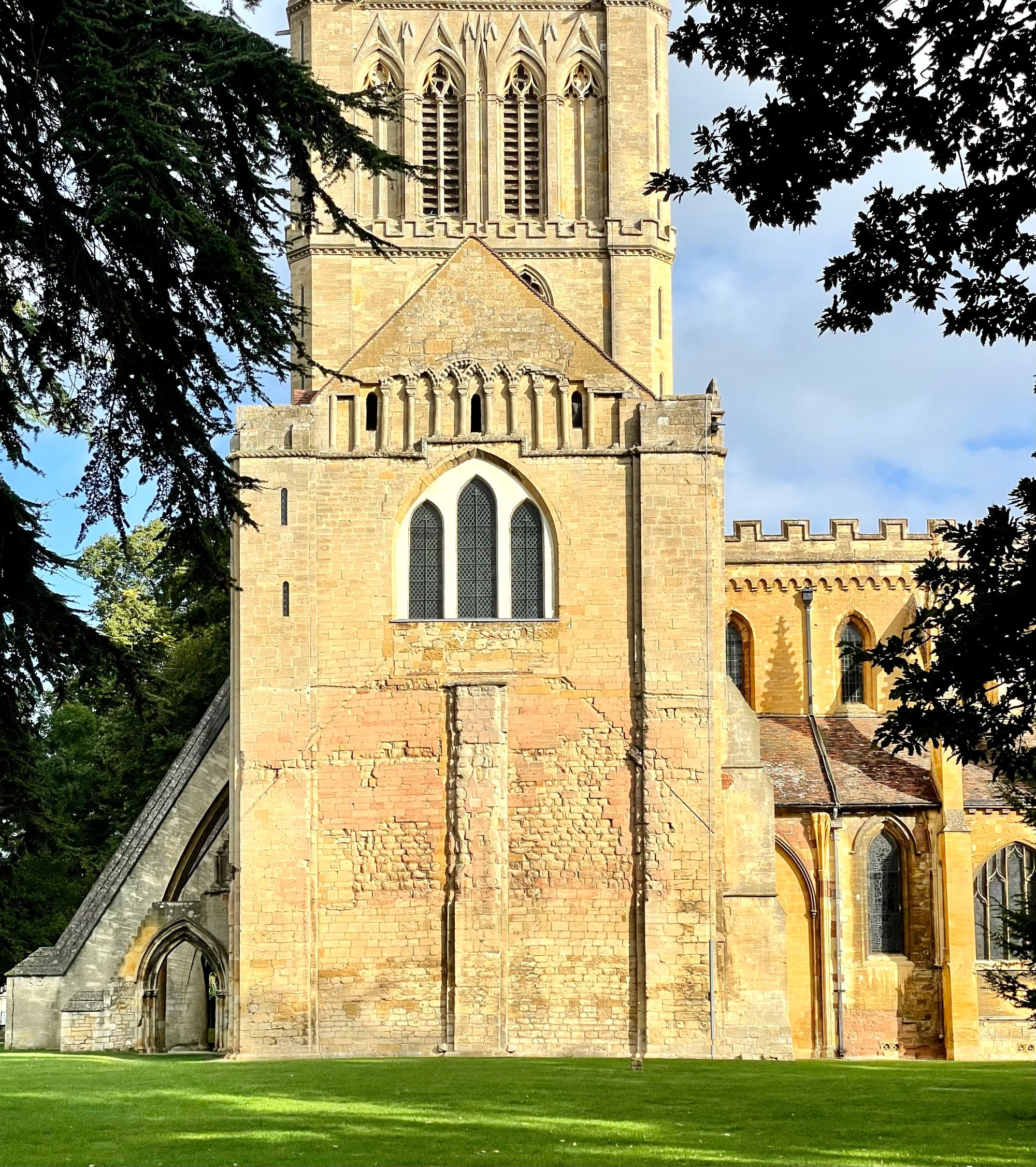 The south aisle bears its story, with its Romanesque origins highlighted by the chevroned blind arcading to the top gable. The ghost gable is of a former monastic building with a central pier.