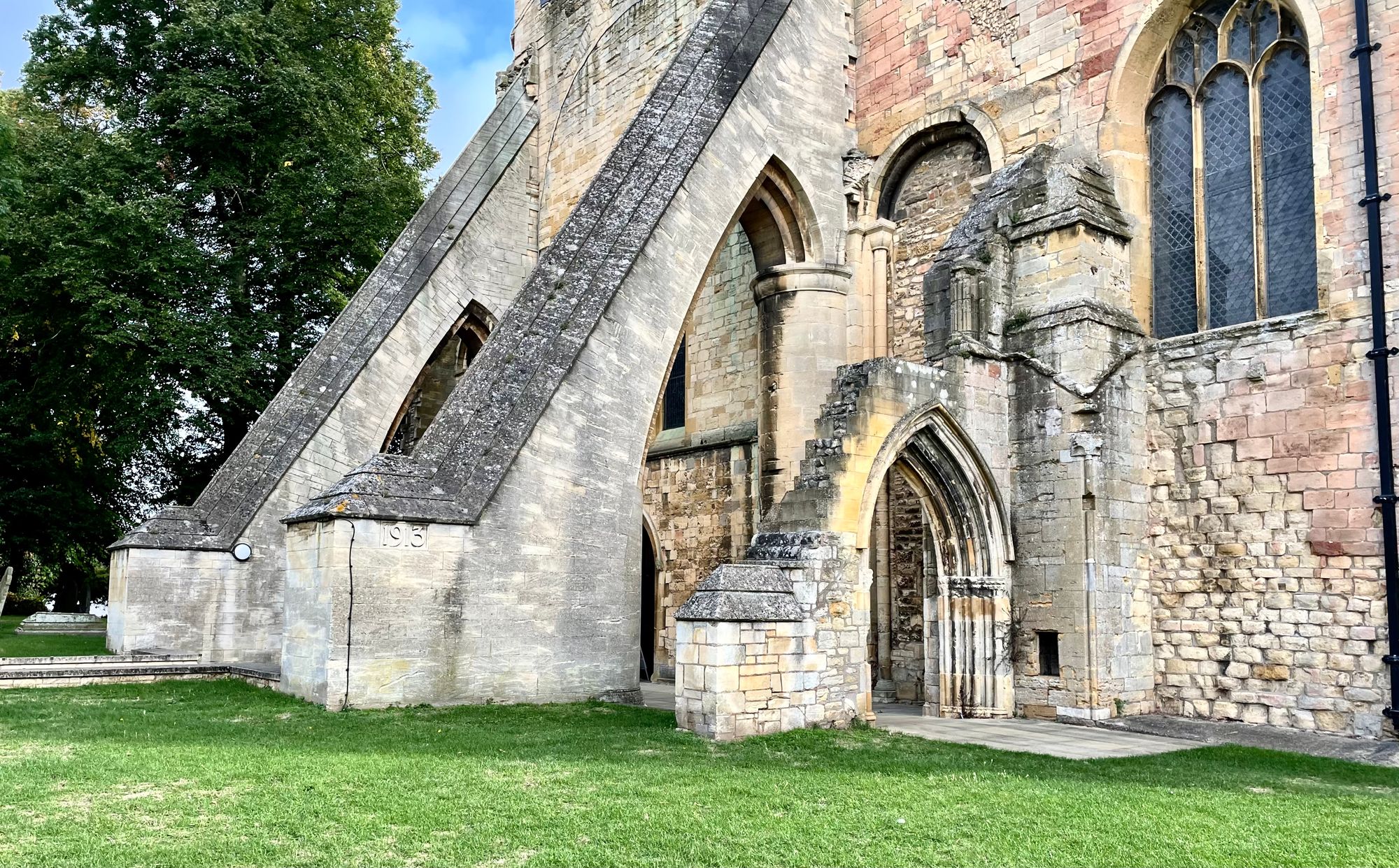 It's a windy day and they bend towards a tower that is old and stock and bears lots of scars. It is a church now, but once was an abbey - much reduced in its size. The standing archaeology points to more favourable times. The building has been subject to the trauma of the Reformation.
