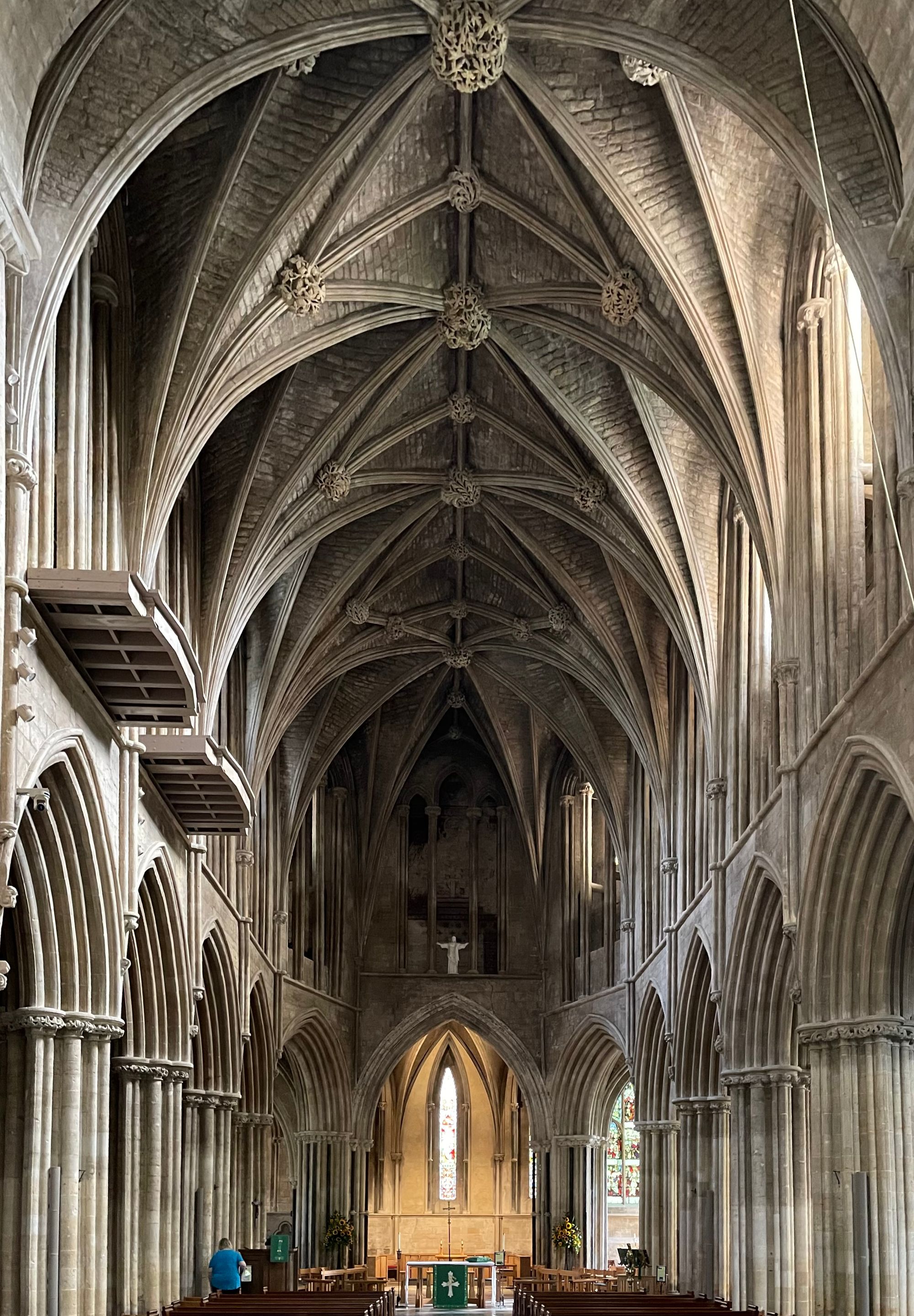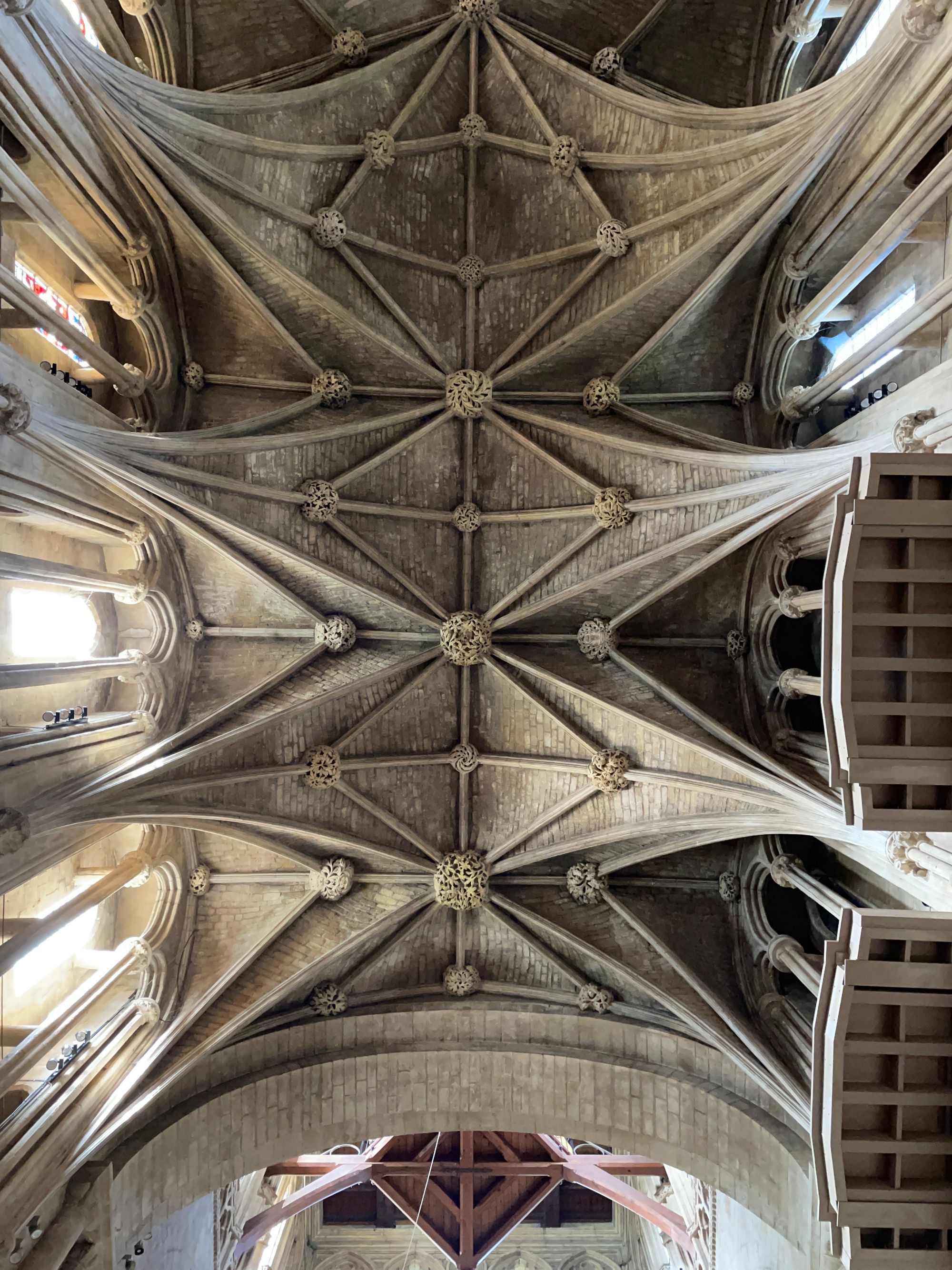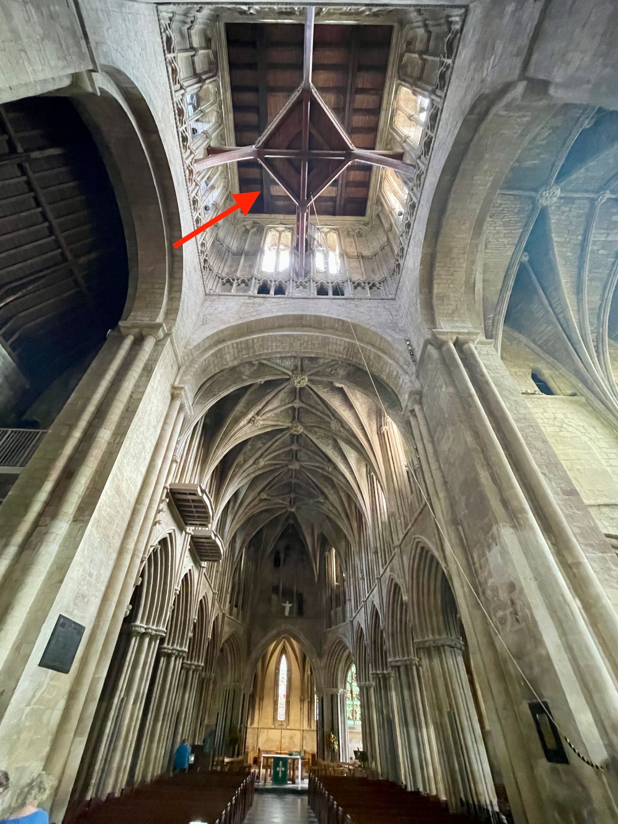 One remarkable feature of the church is its free-standing ringing platform. The platform hovers within the void of the lantern tower and the bellringers have to take a circuitous route to get to it. The platform is marked with the red arrow below: