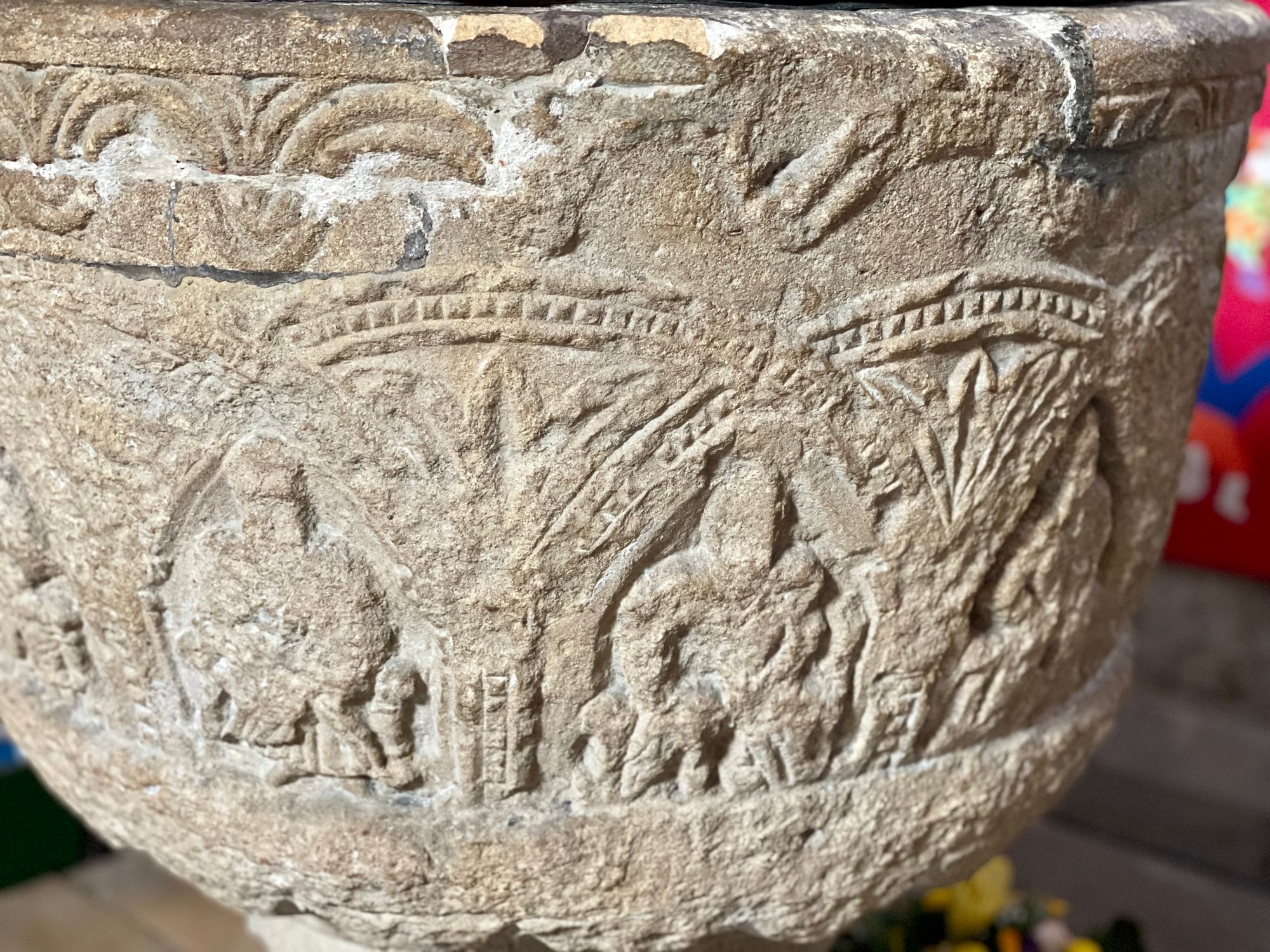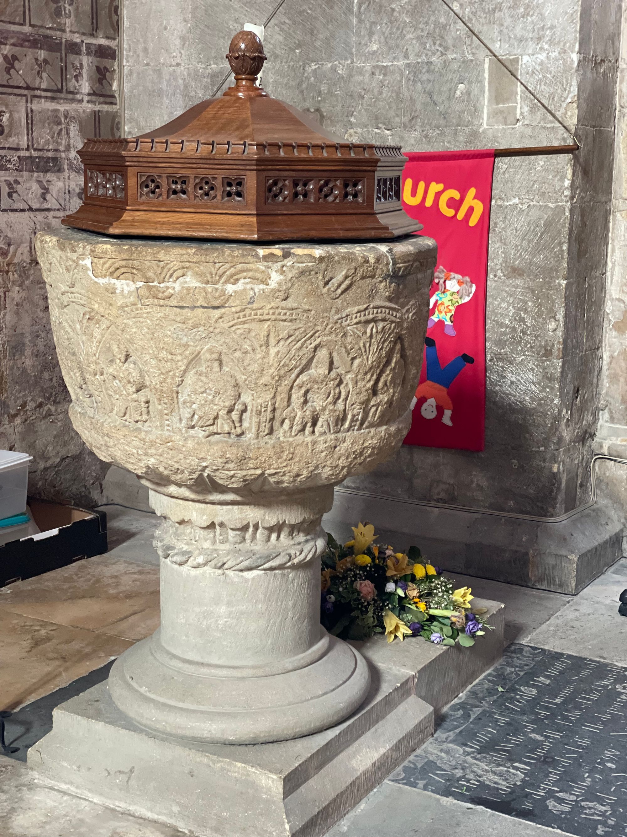 The font is Romanesque with a carved relief of seated figures under a billet-moulded arcade.