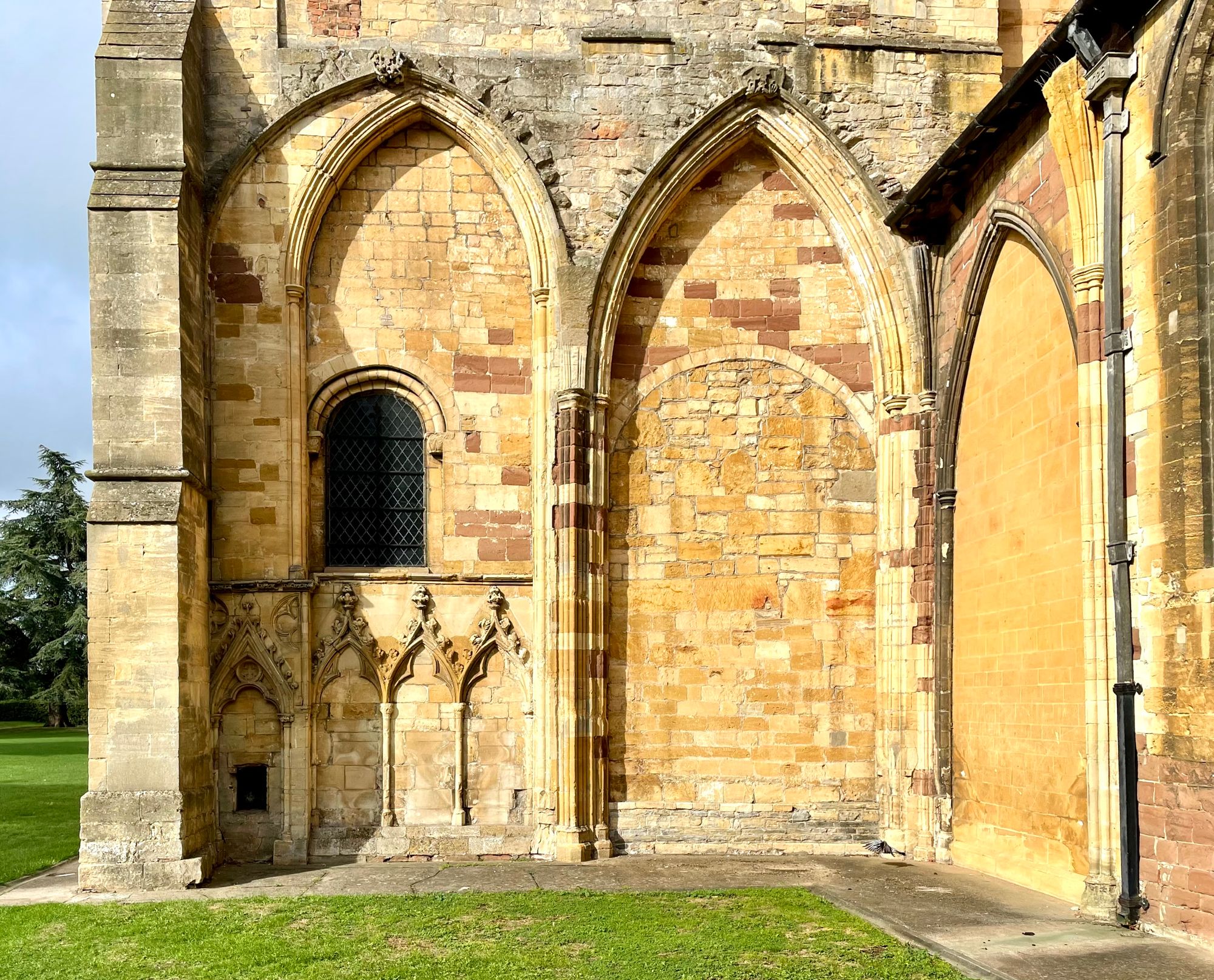 To the east side of the transept is a glorious concoction of layered history in stone. Springing points that terminate in truncated bosses reveal the former existence of vaulting. The crocketed blind arcading was once on the inside - a sedilia and piscina.