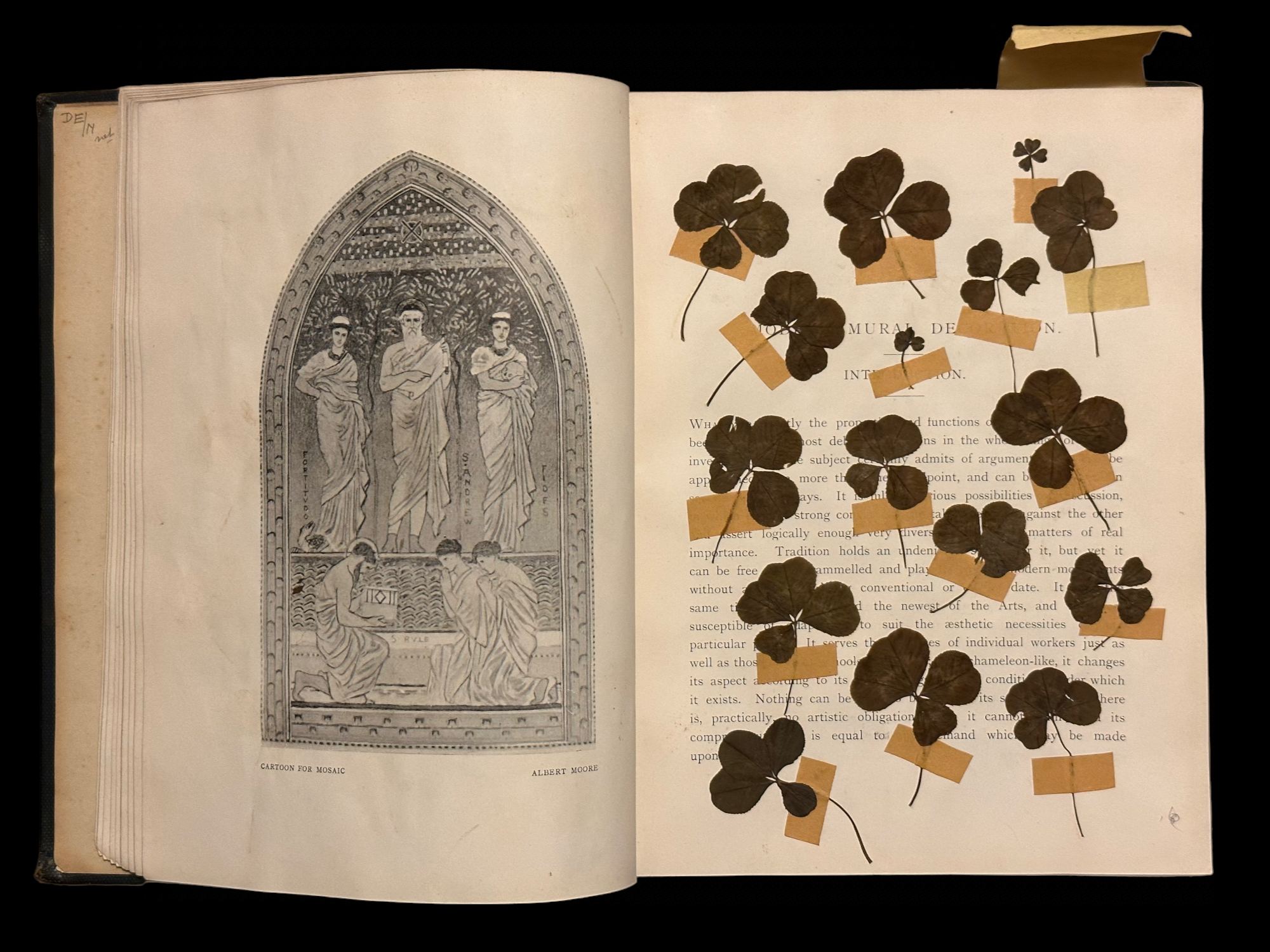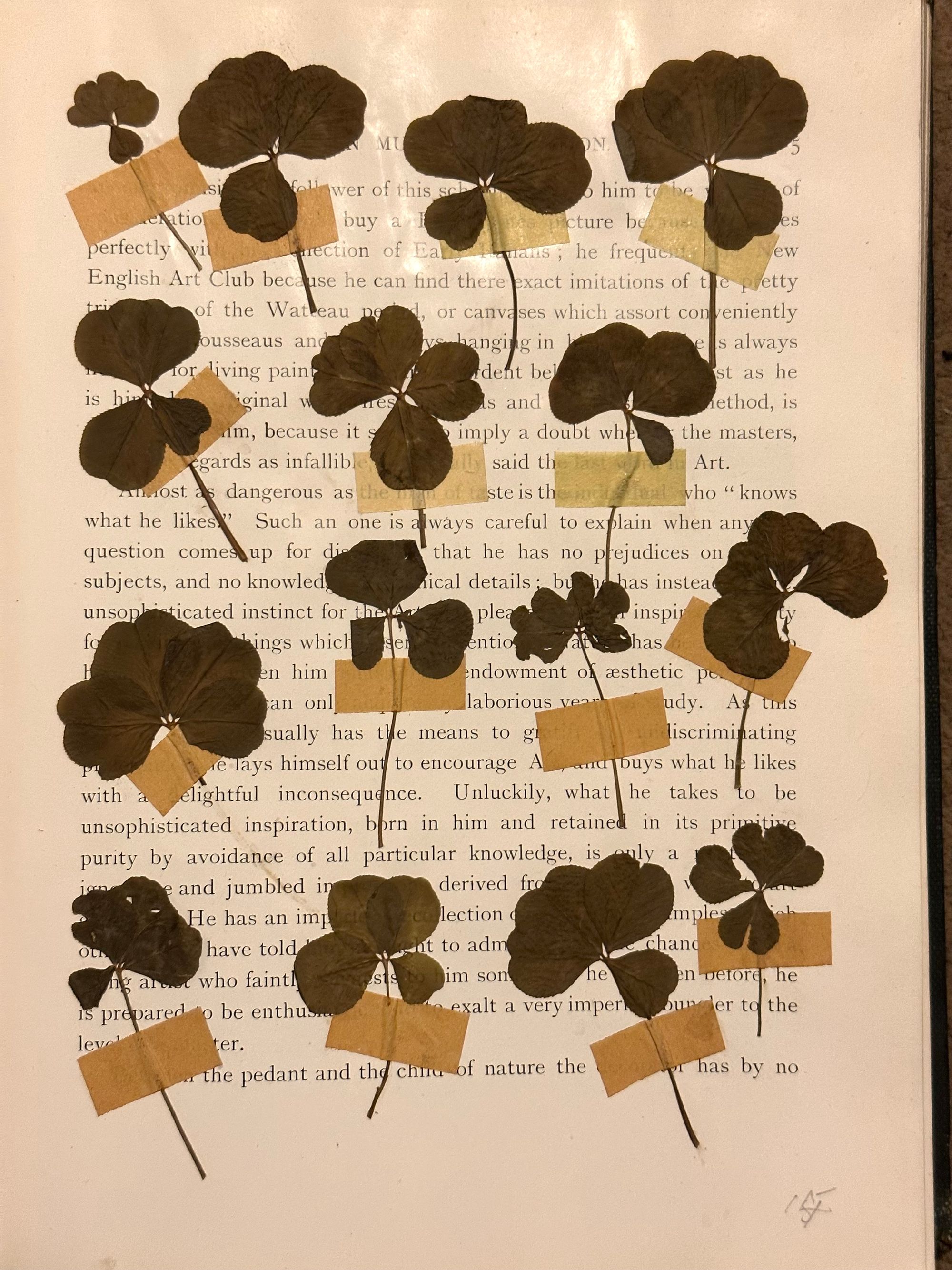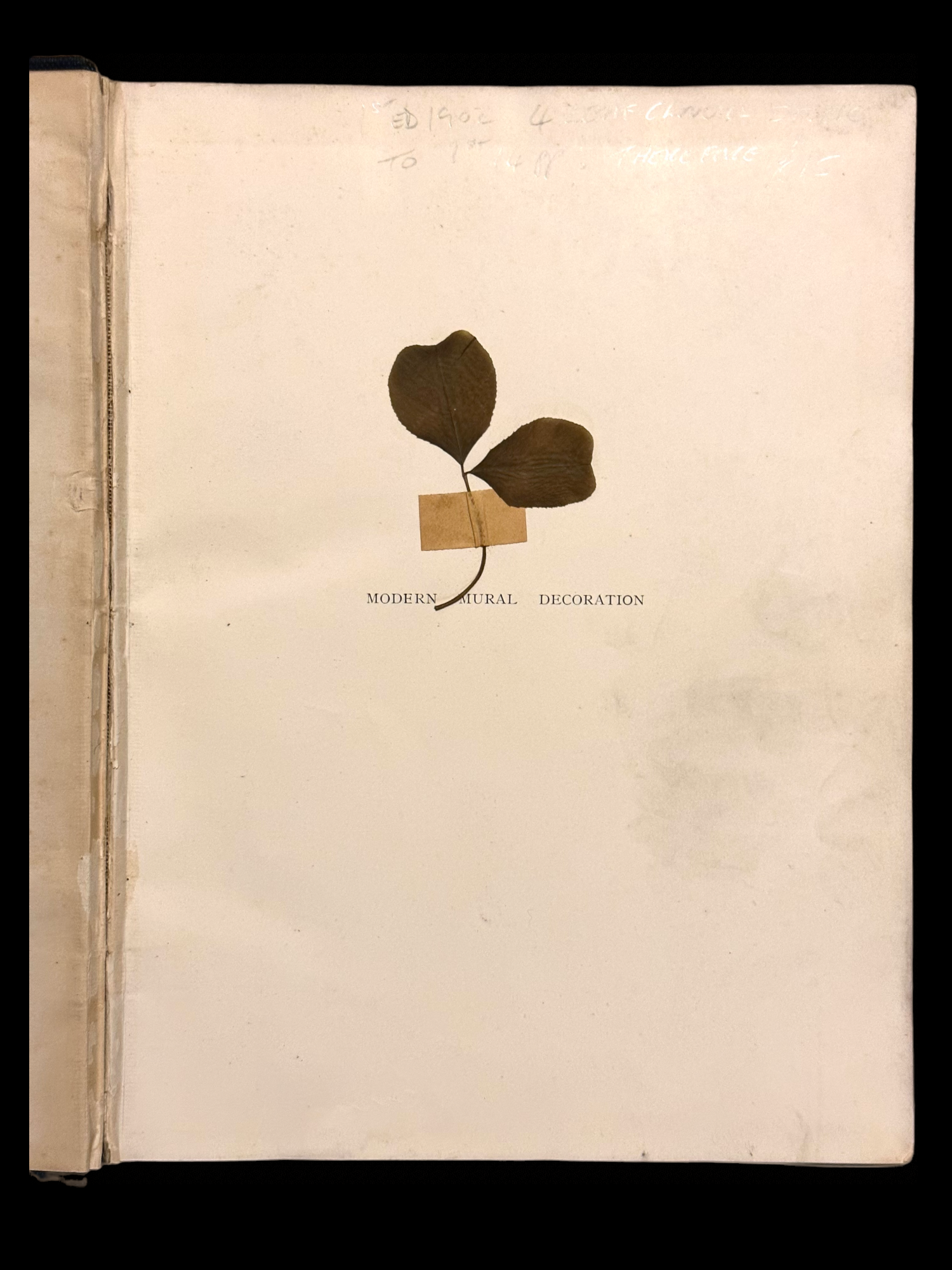 What does a book say that holds page after page of four leaf clovers? What does it tell us about the person behind it - the intent behind the fourth leaf? Was this book on Modern Mural Decoration chosen on purpose? Is the pencilled name on the inner leaf the perpetrator?