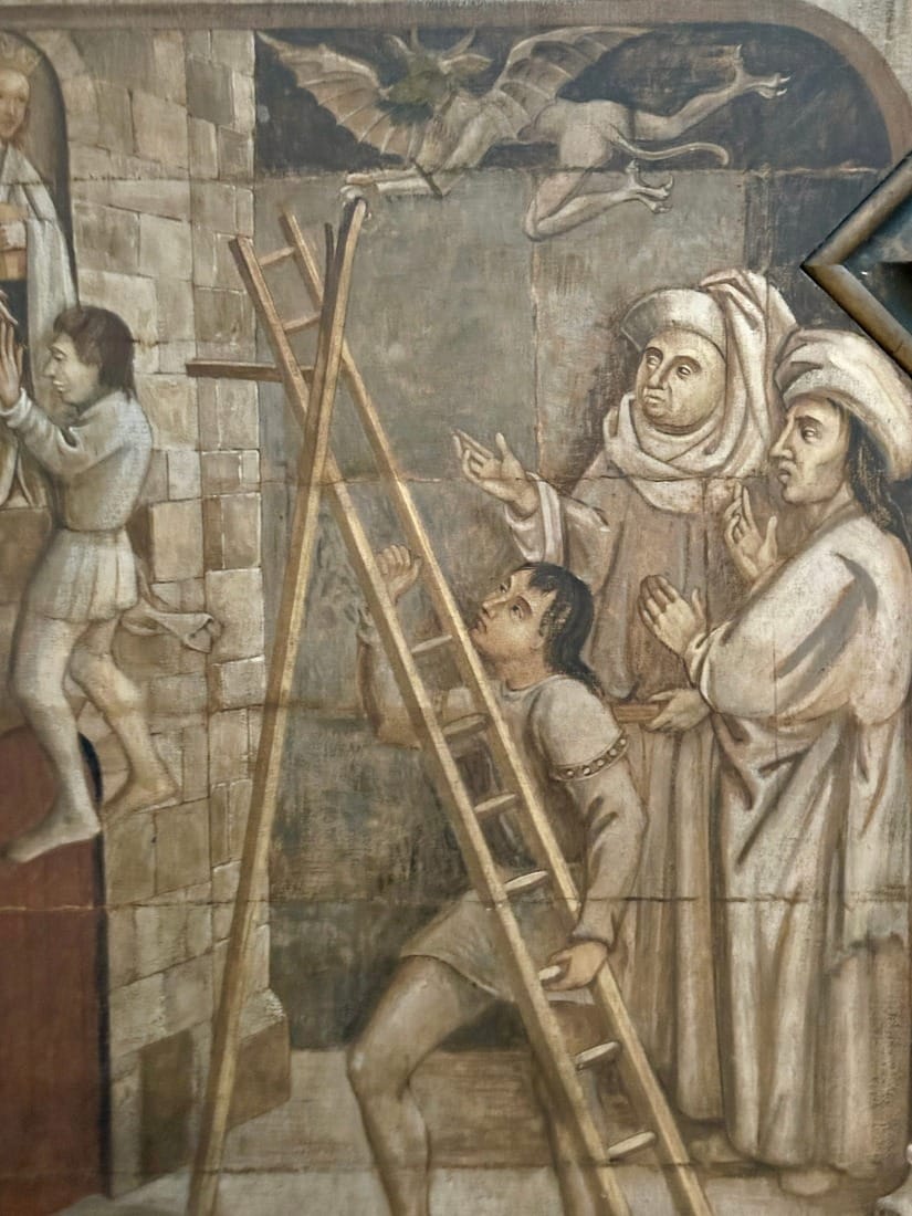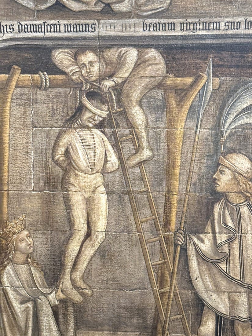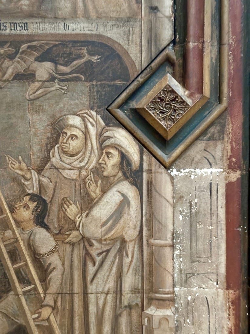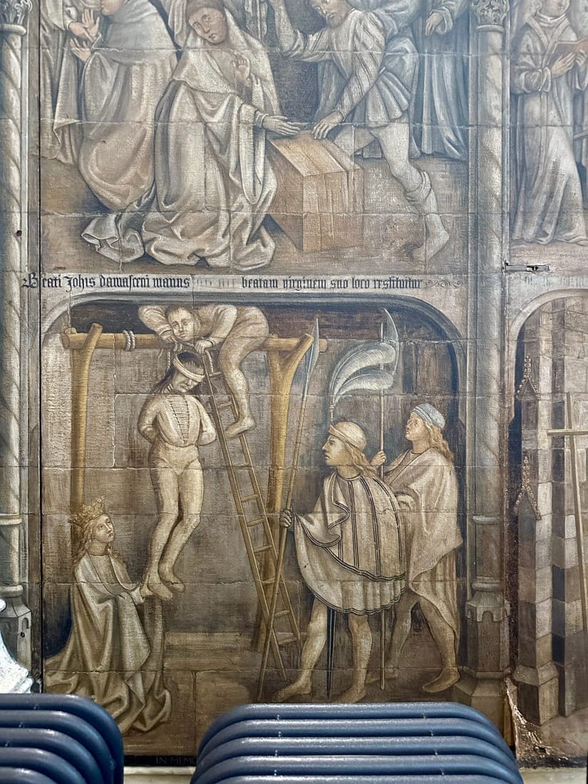 The paintings in the Lady Chapel date to 1500 and depict miracle scenes attributed to the Virgin Mary. They lie beneath a set of reproduction panels - but don't turn away - they give a wonderful sense of the period - how it might have felt to first see the room.