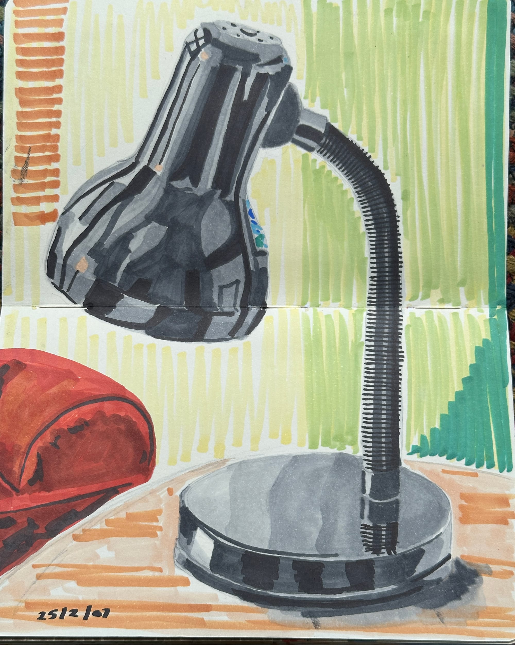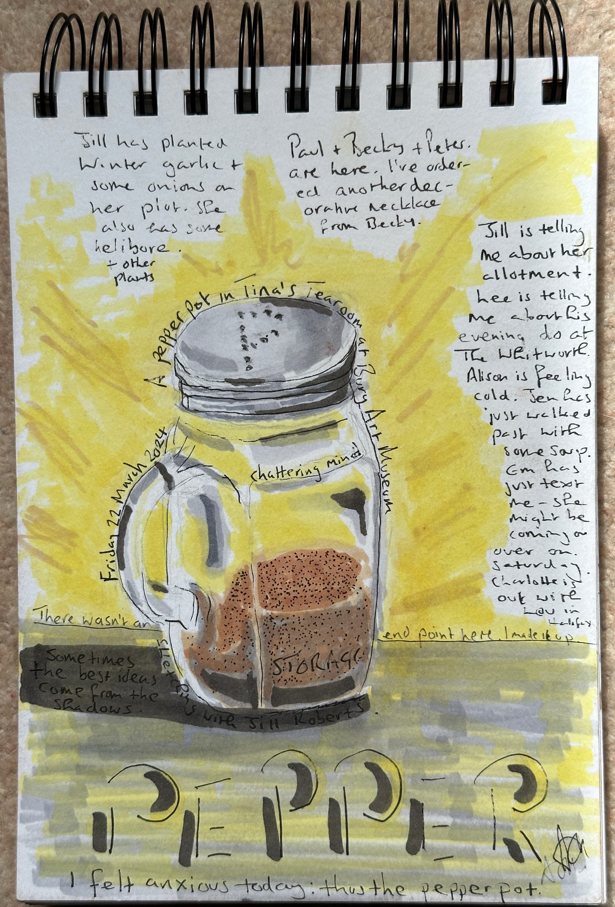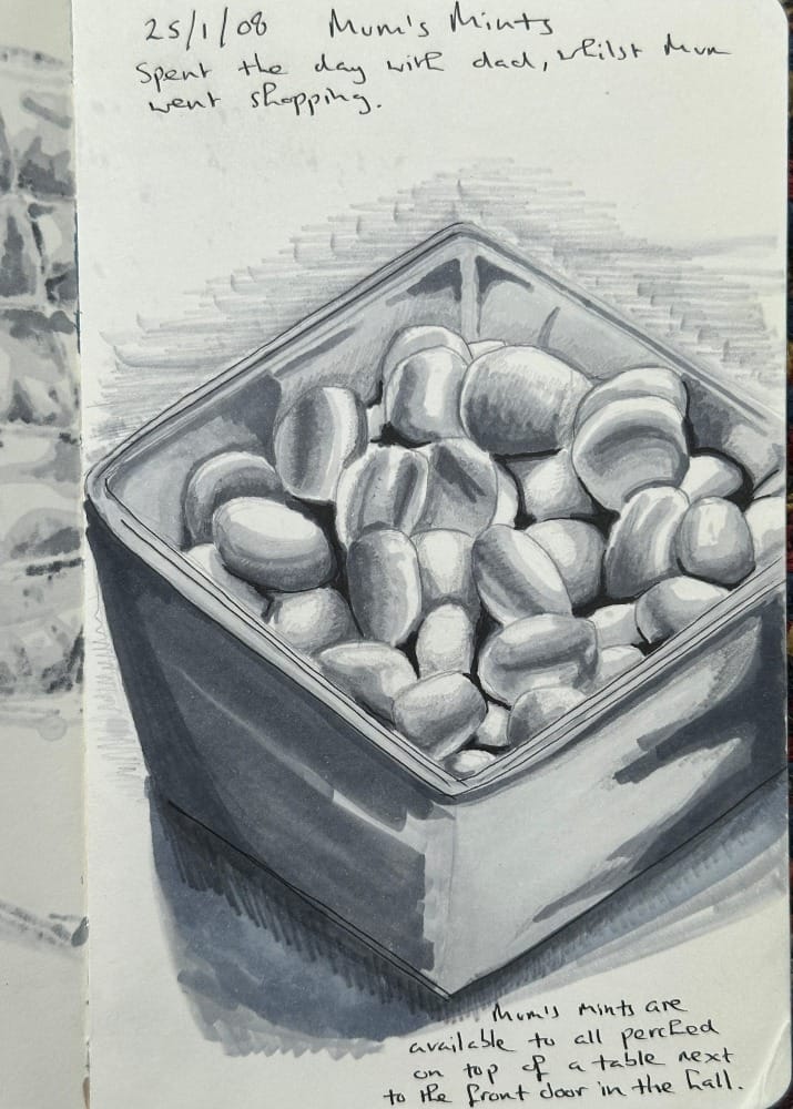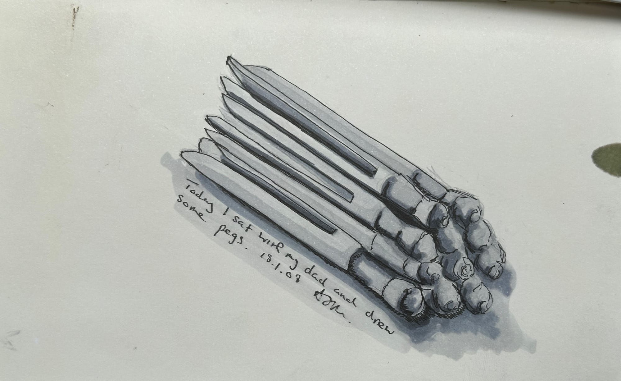 When my dad was in the last few weeks of his life, I sat with him and found solace in the mundane act of sketching a bunch of pegs. Whilst I was sketching I remember the profound feeling of my grief being drawn through the veins in my arm and absorbed by the marks I was making on the page.