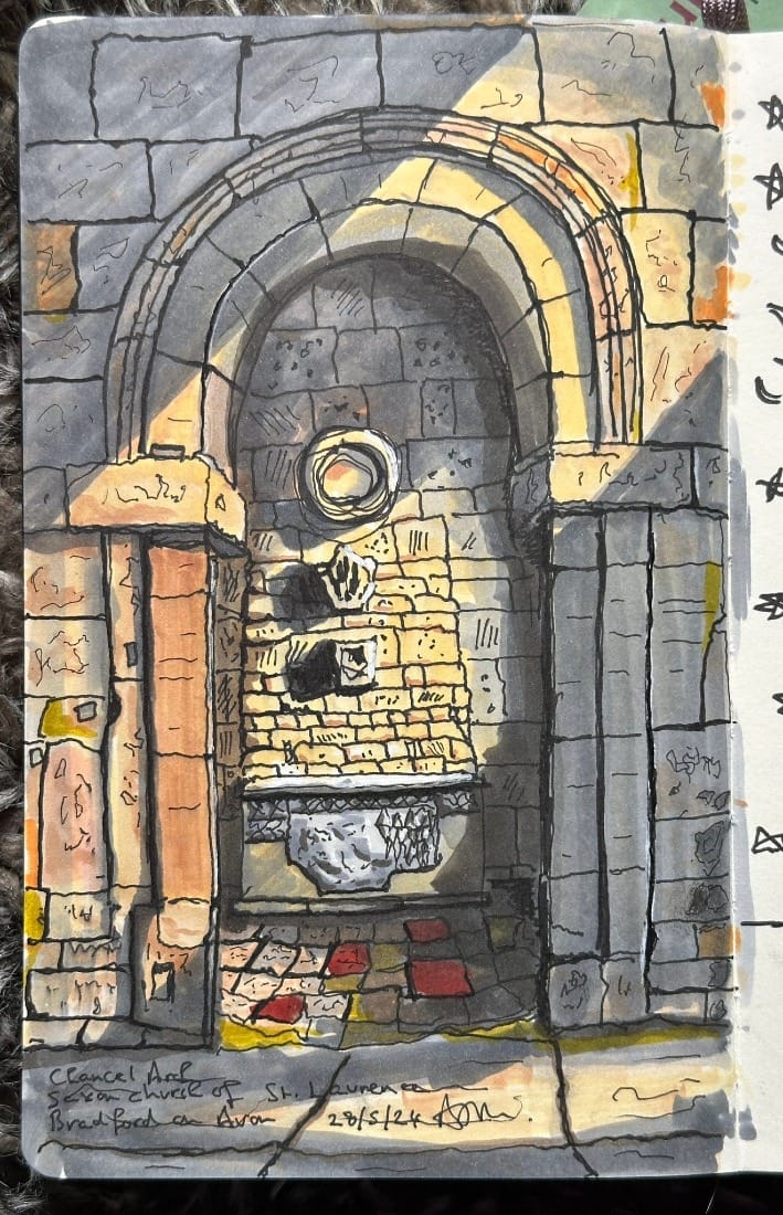 As I layer the sketch with colour, I become utterly absorbed in the space. It’s a feeling akin to hovering within the light. It feels as though the light is being drawn into my eyes, coursing through my arm, and flowing onto the page. This moment is charged with emotion, and I feel unalloyed bliss as both place and feeling start to emerge on the page.
