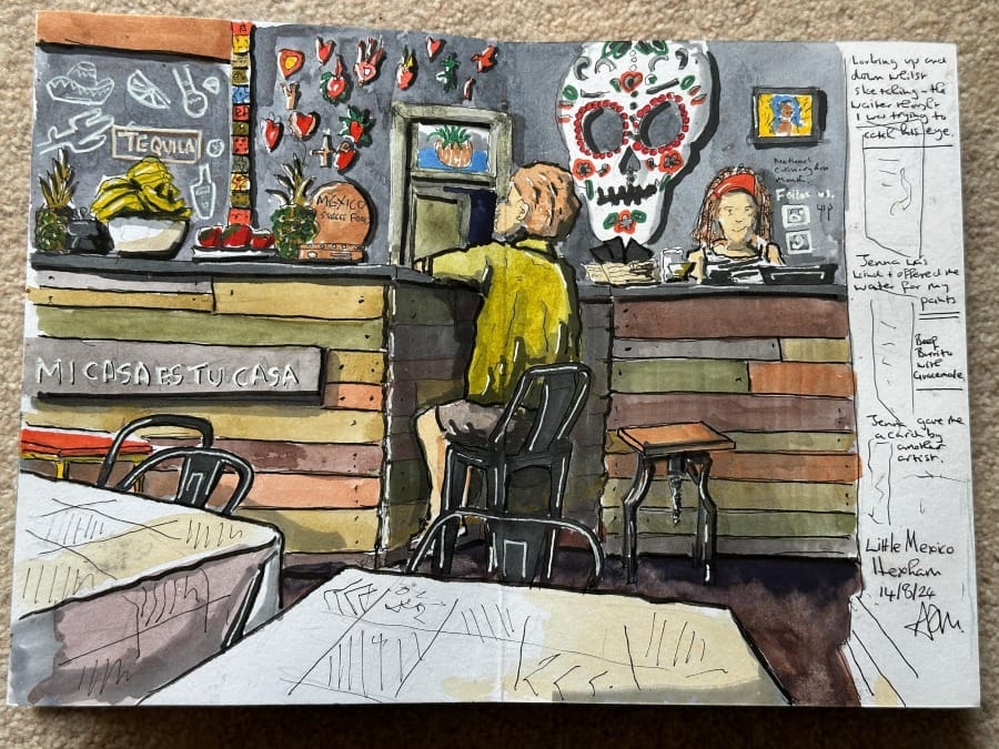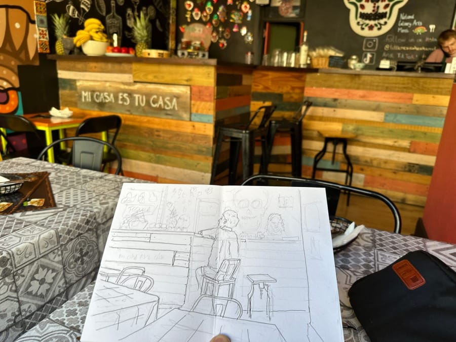 I take lunch in Little Mexico on Market Street/Church Row and I do one of the hardest things to do when sketching - I start to sketch from the table in front of everybody.