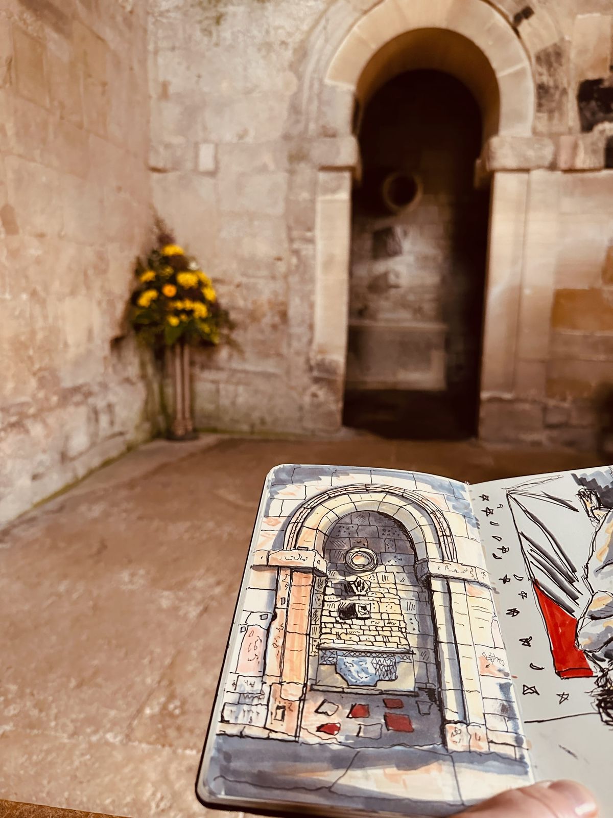The dip in the weather is the calm before the storm, for a sharp blast takes us above the market place and then on to the abbey proper. Below, in a pocket of the abbey that was once part of the cloister, is a travelling photographer - recently breakfasted in his camper van at the park, but now sat upon a slab observing and sketching a wall spliced into a building.