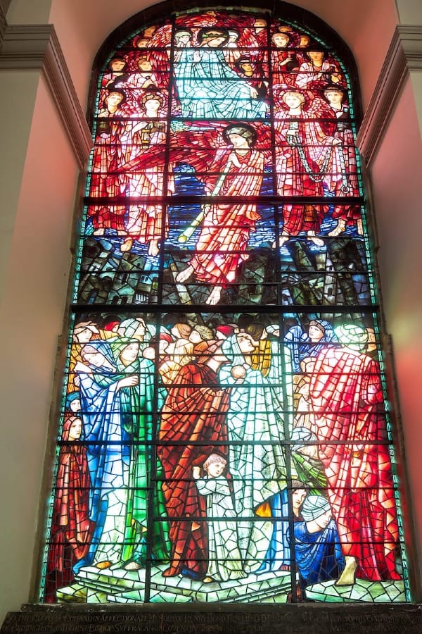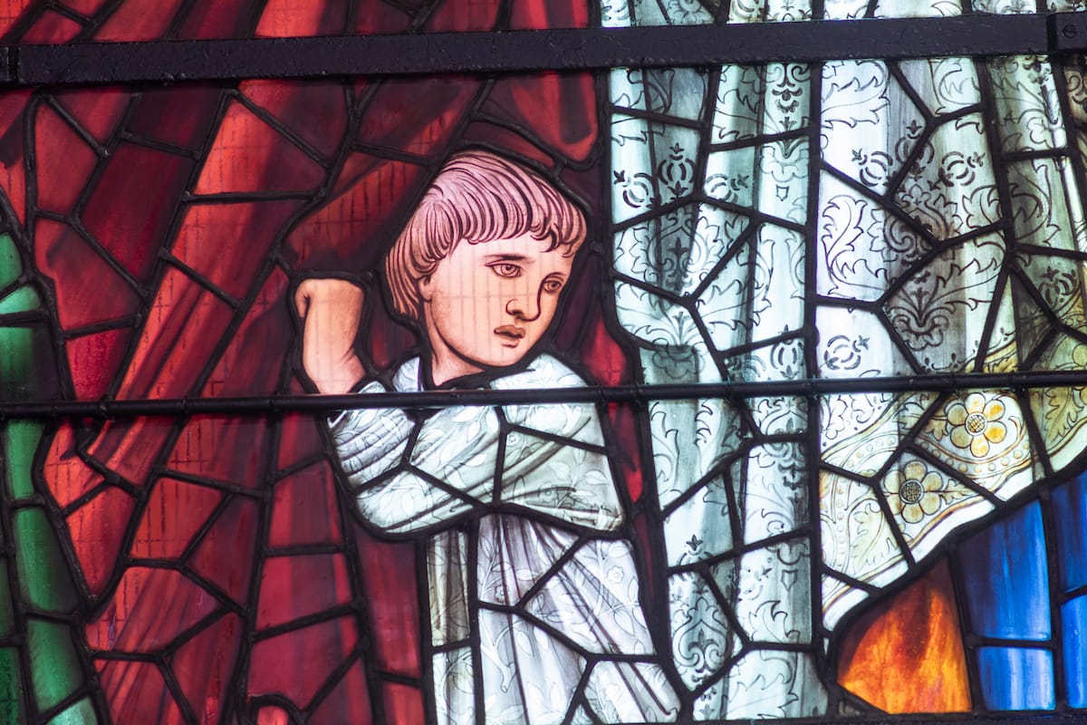 Across Europe, especially in France and the Low Countries, stained glass often leans toward lighter, pastel tones, with a more stylised, almost cartoon-like approach to figures and scenes. By contrast, the stained glass of these isles — particularly in the Victorian and Arts and Crafts periods — tends to be more illustrative, with richer, saturated colours and a painterly quality. A sense of narrative depth arises through techniques that bridge artisan craft and figurative art, drawing on a strong tradition of illuminated manuscripts.