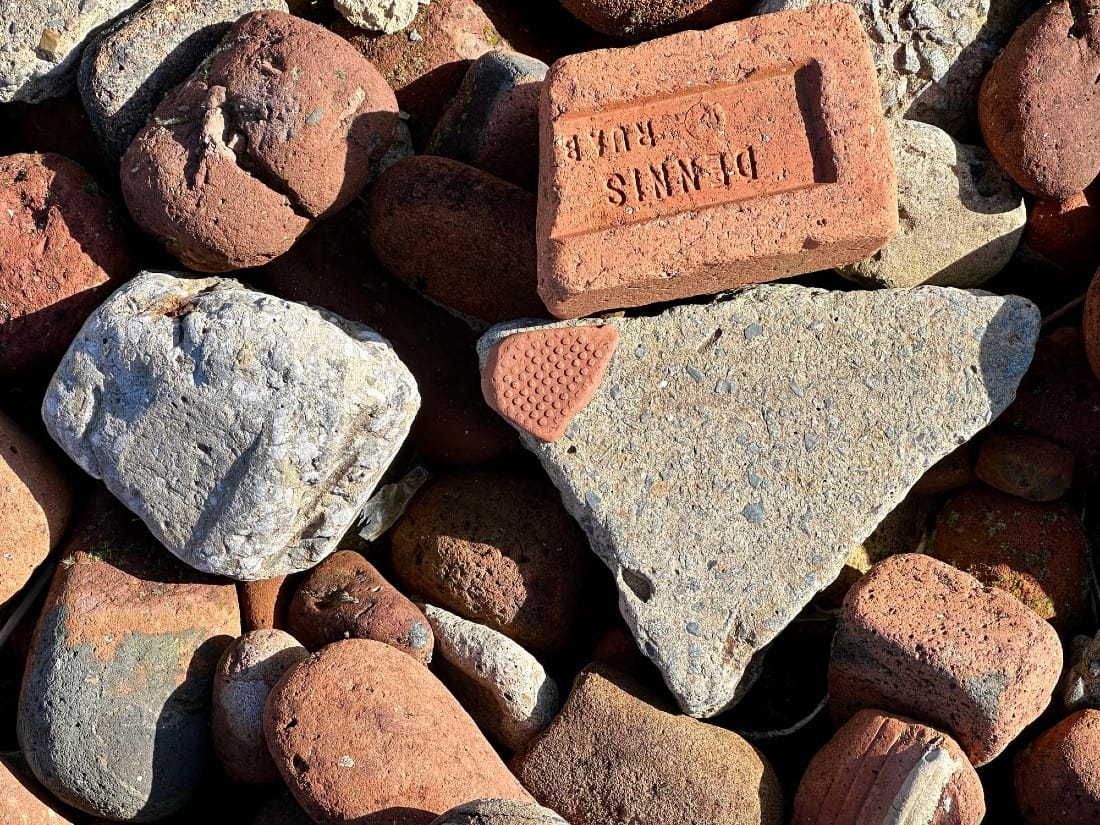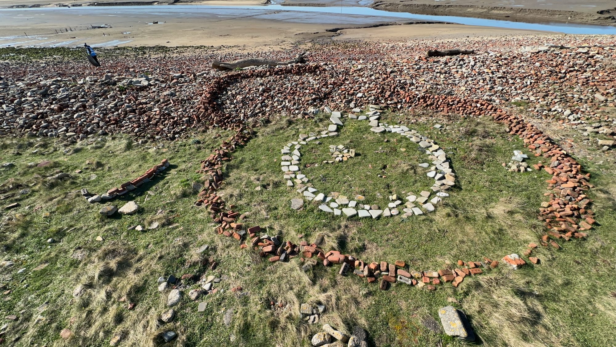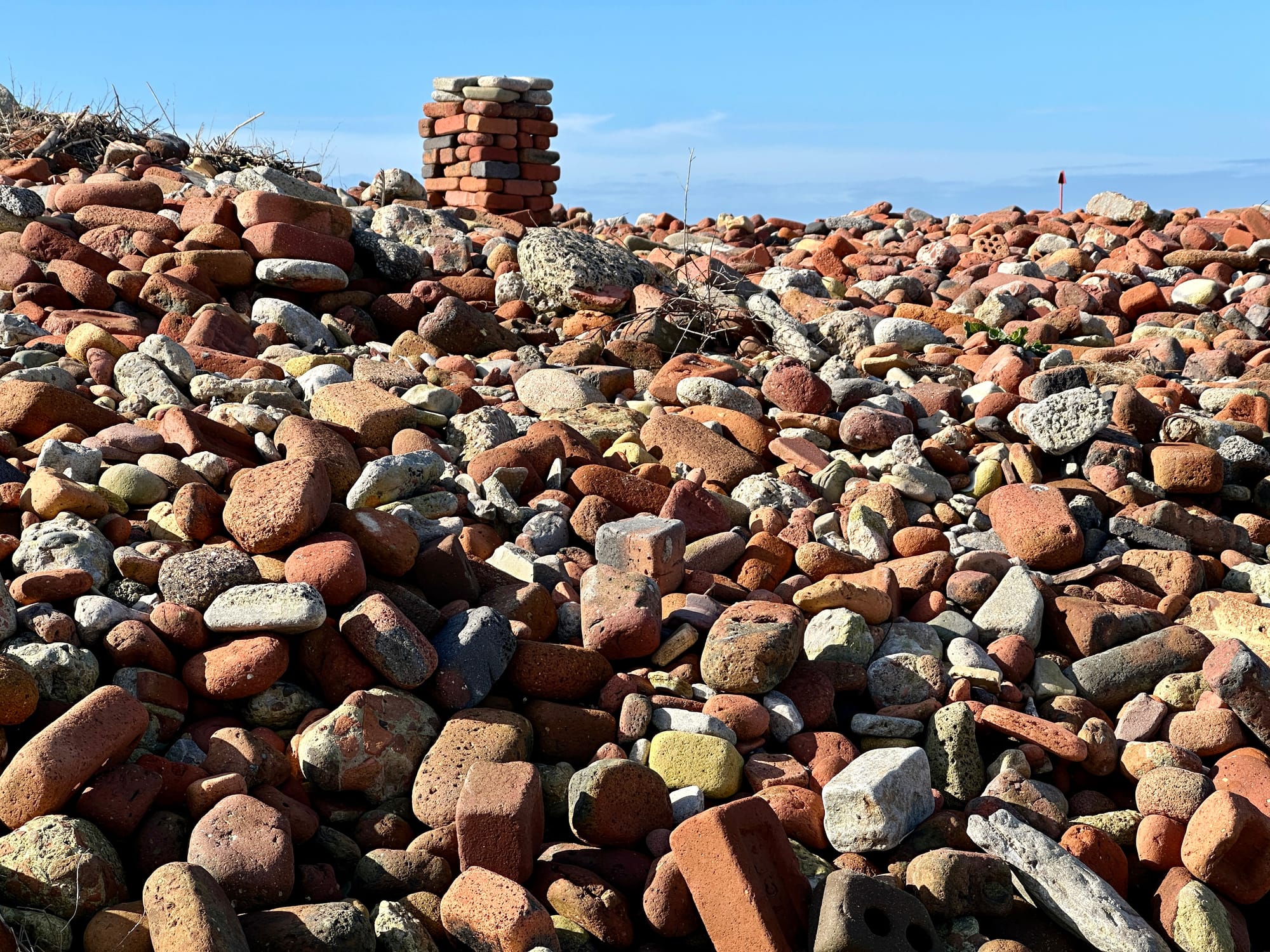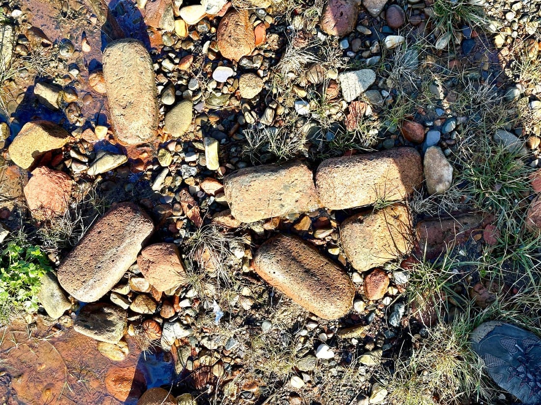 I come across a brick bank and explore it. I’m a brickonaut. I bask in the joy of the fractal patterns, but the wonder is punctured by the sadness of it all, until I spot something beneath the spit - a brick circle.