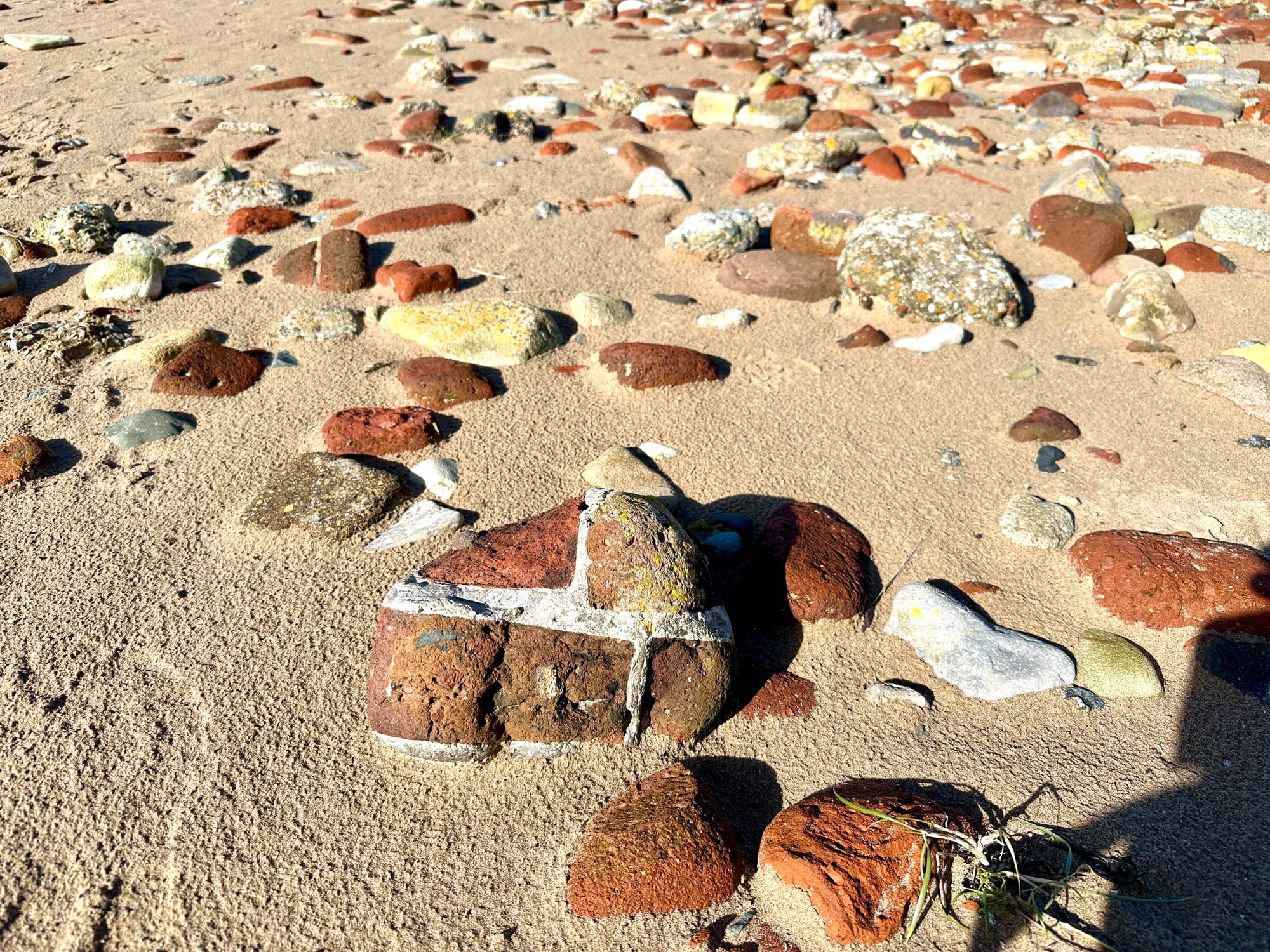 I’m told that the bricks (amongst other later demolished sites) were deposited here after the blitz of Liverpool - swept up from the bomb-pitted terraced houses and trucked onto the beach. I think of the occupants and the shock of losing their homes and loved ones. The walls they kissed against, threw balls against, are now fragments on the shoreline.