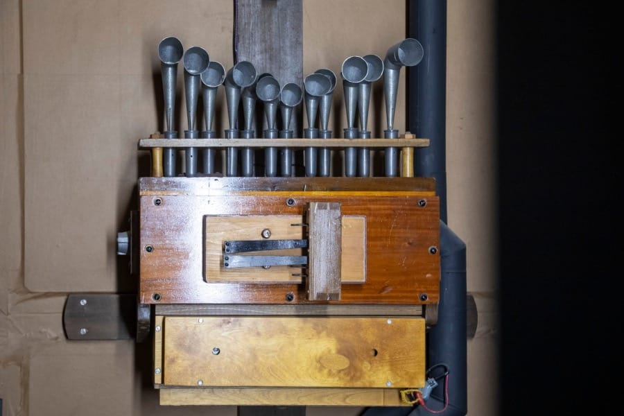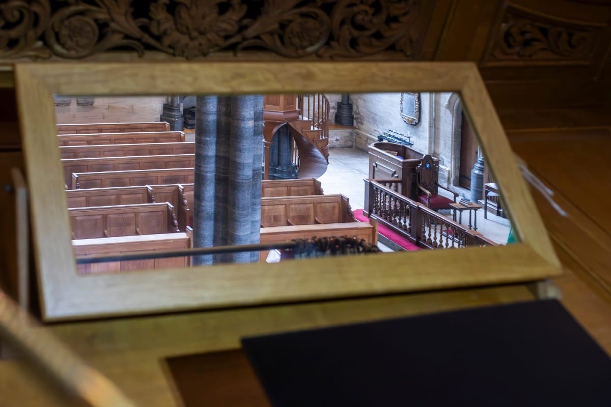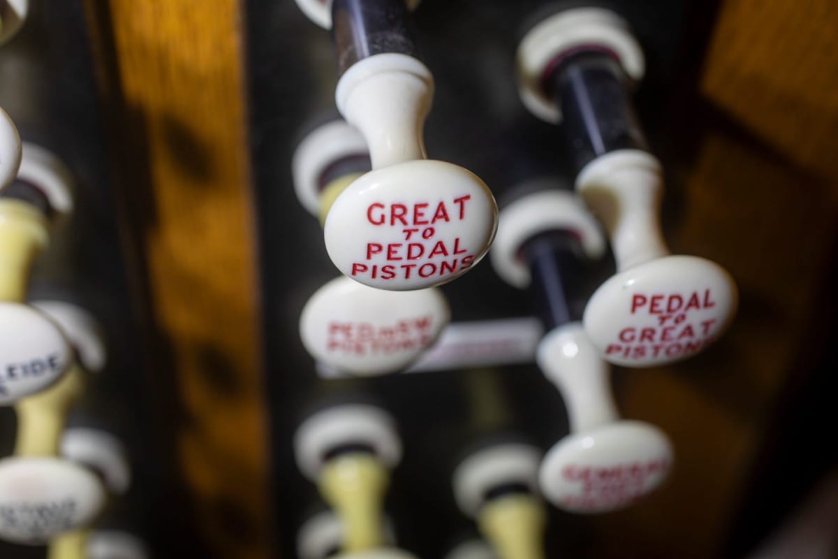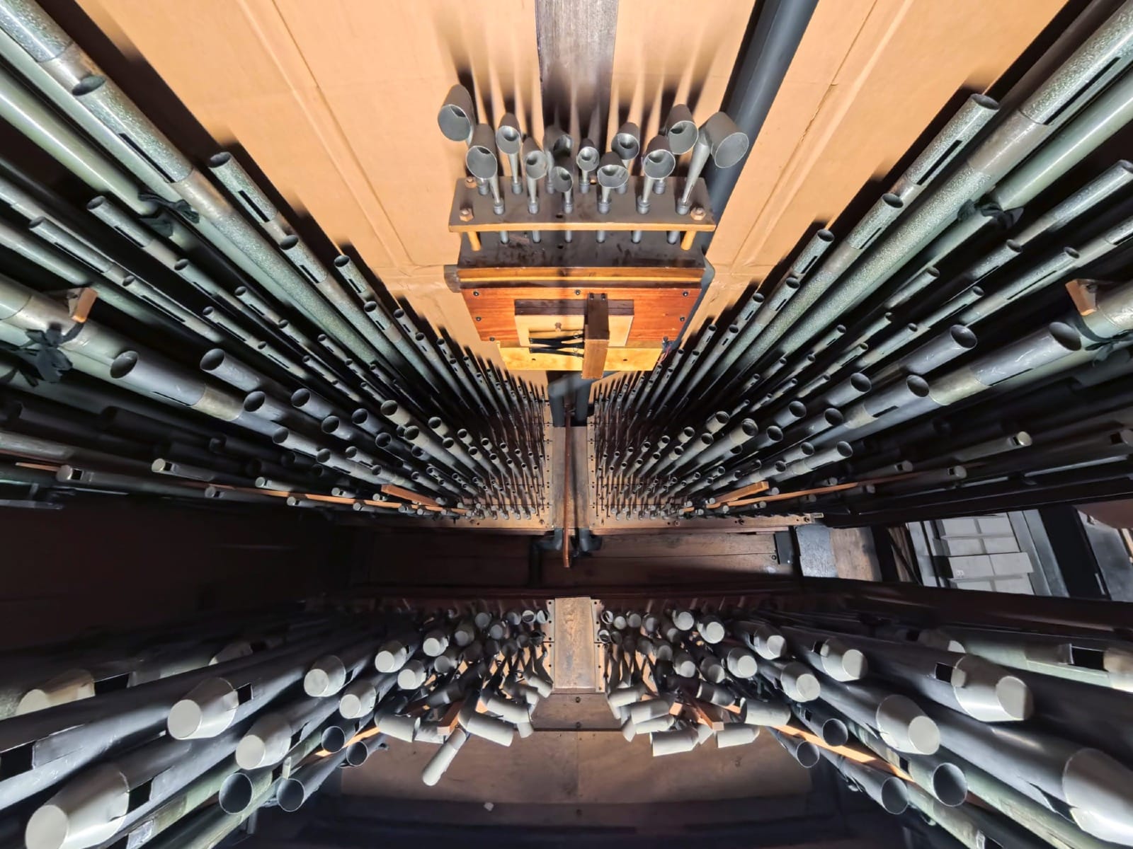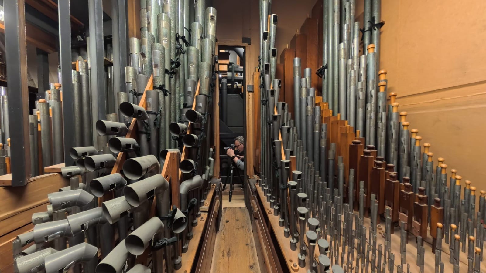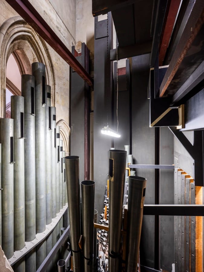 Later, I climb into the organ chamber — a warren of small partitioned rooms — to photograph the pipes: from the most delicate, reed-like conduits, no wider than a quill, to towering, chimney-like giants — industrial in presence, black as Brunel’s top hat.