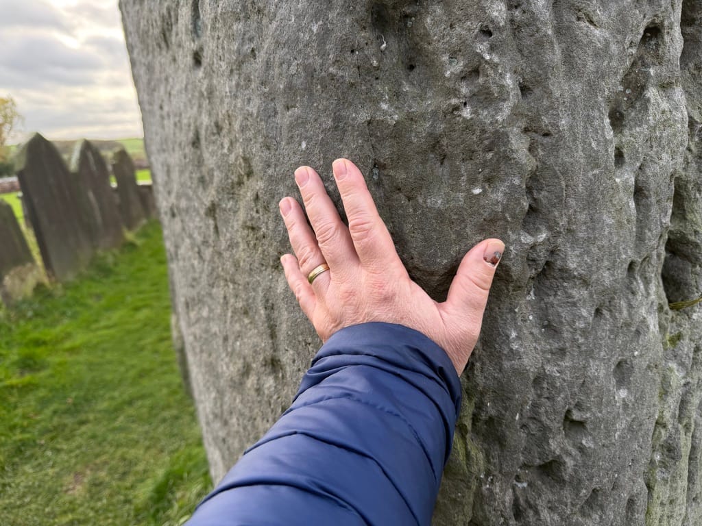 I arrive at Rudston on the cusp of sunrise. I drive the van onto an embankment and, as I switch the key to off, the clocks and dials sink into the dash and the world outside presses in. I first see the monolith from the van window and through the bony branches of a tree. It is bathed in a light so thinned out that it looks ghostly, silver.