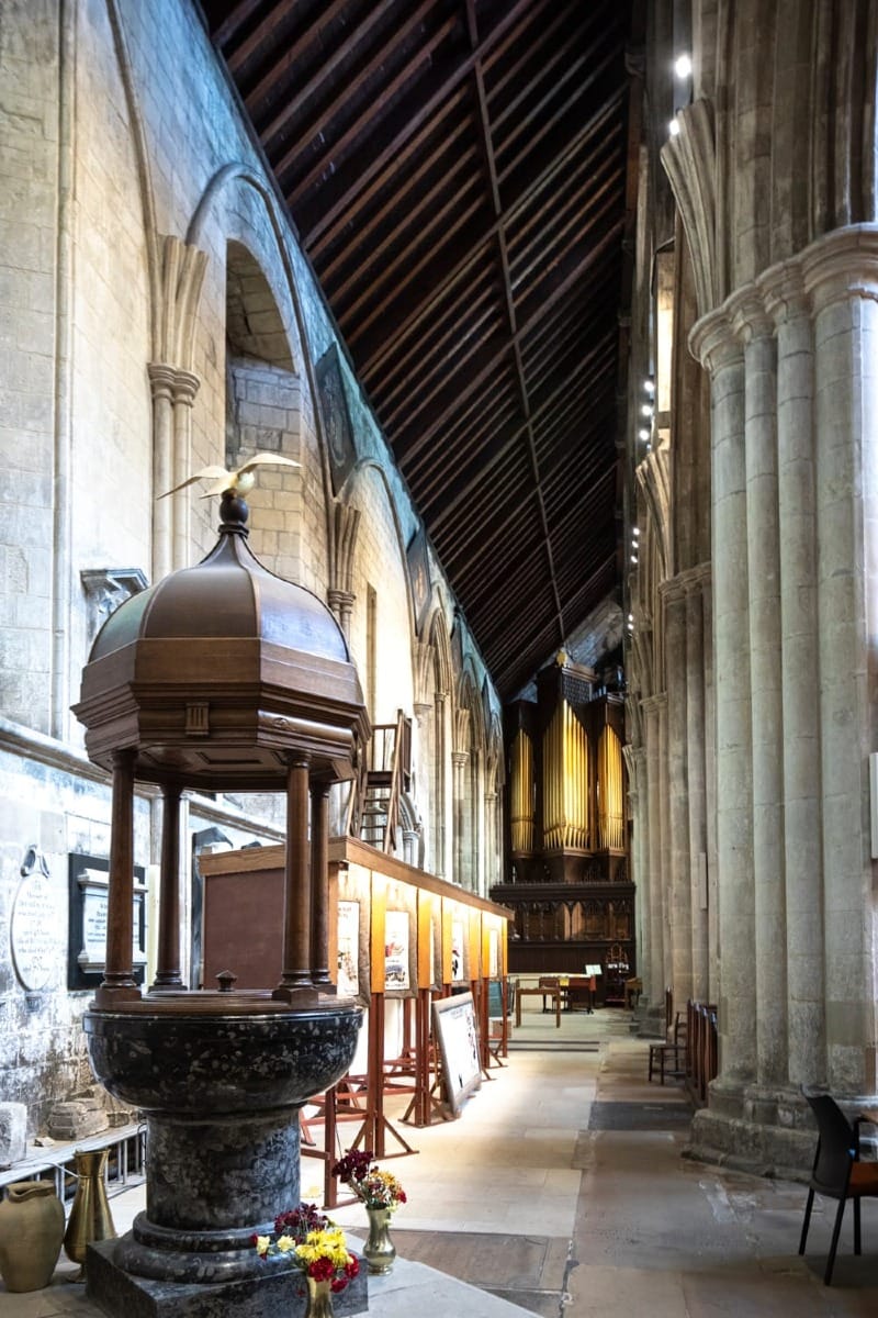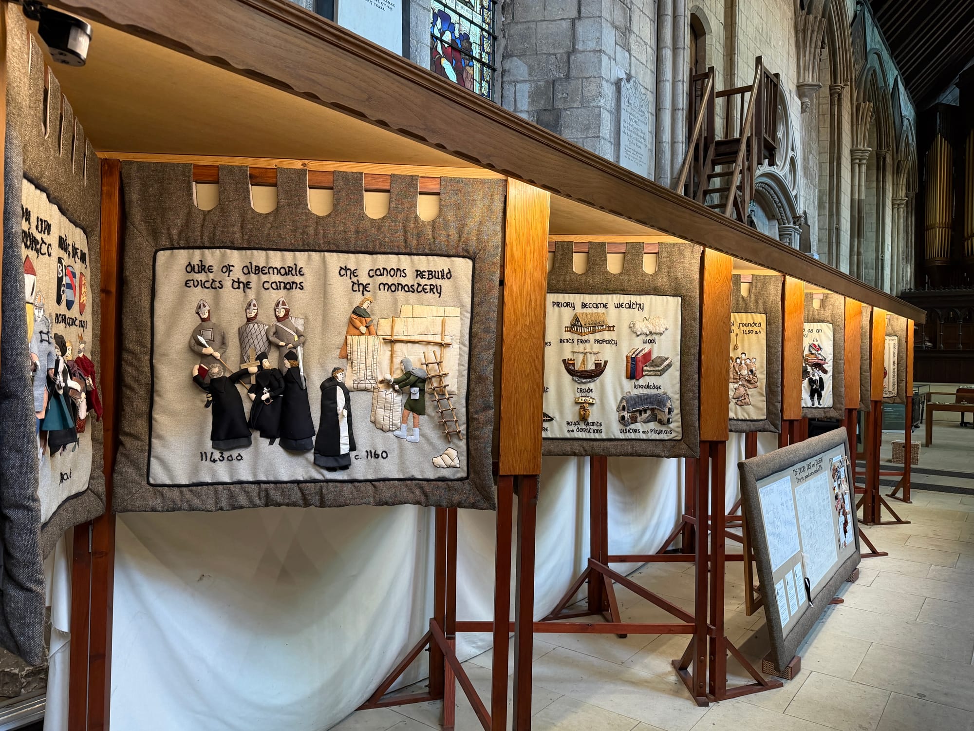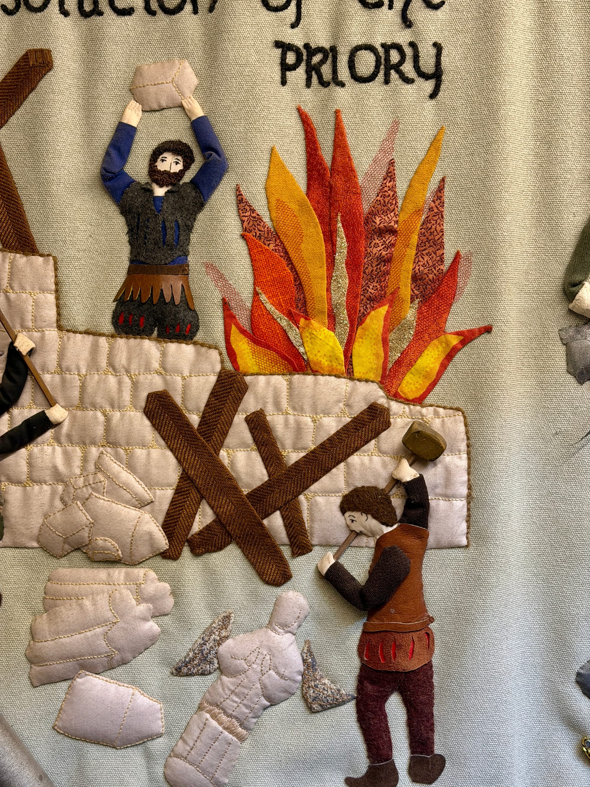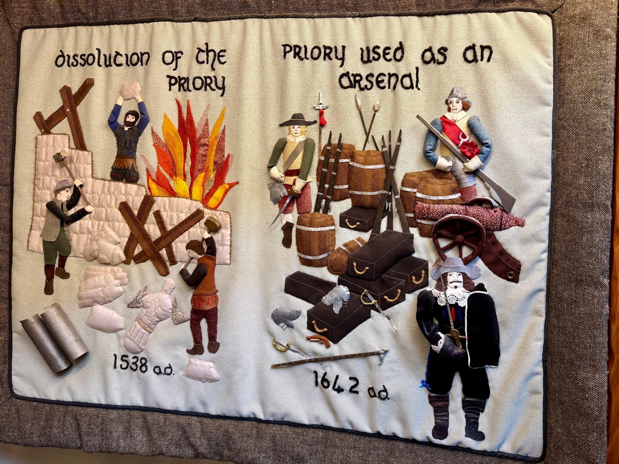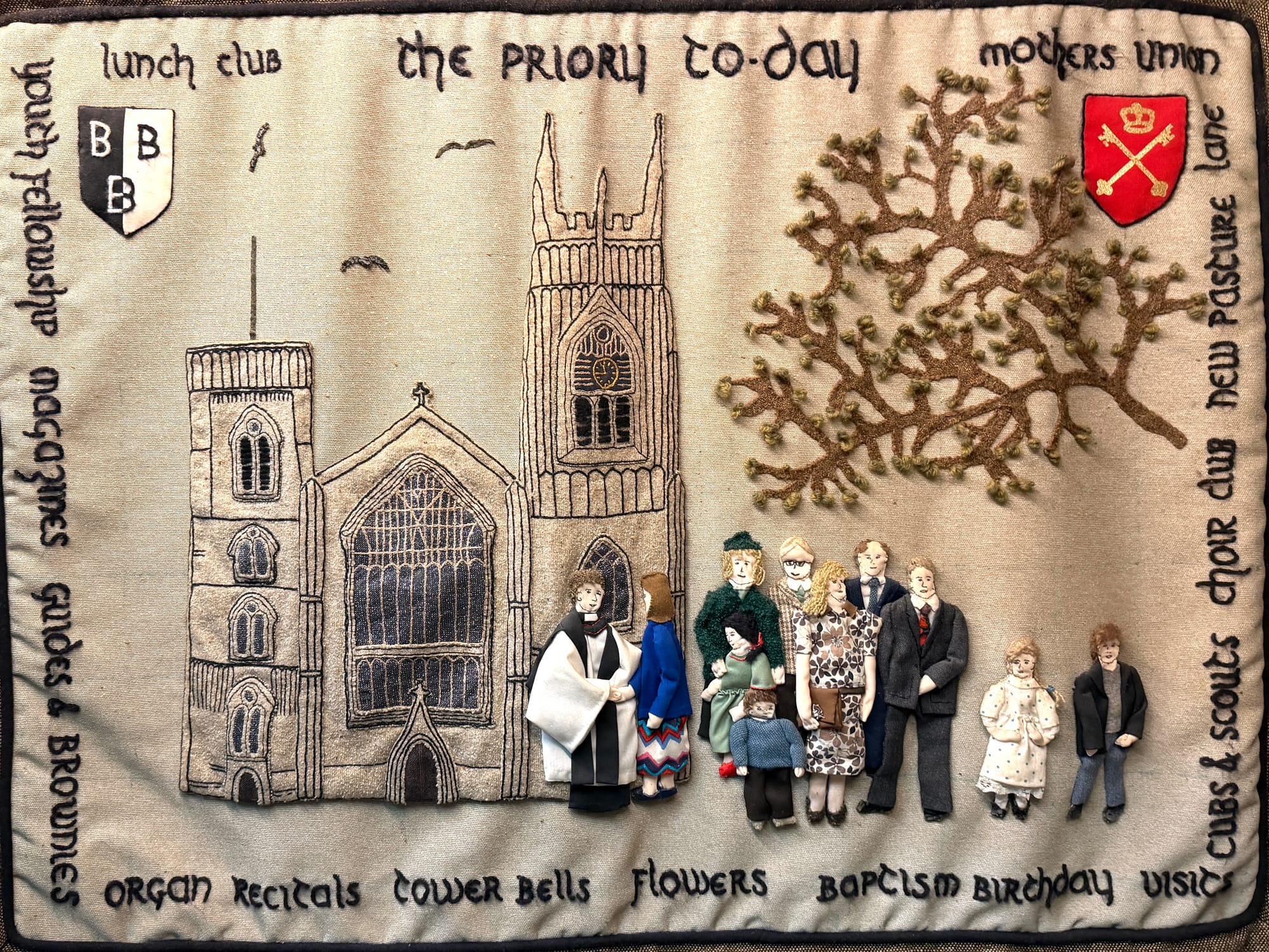 Tucked along the north aisle is something unexpected - a tapestry that feels less like decoration and more like a communal heartbeat. Created in the 1990s by a group of parishioners, each panel stitches together a chapter of the Priory’s story: its medieval origins, its upheavals, its survivals.