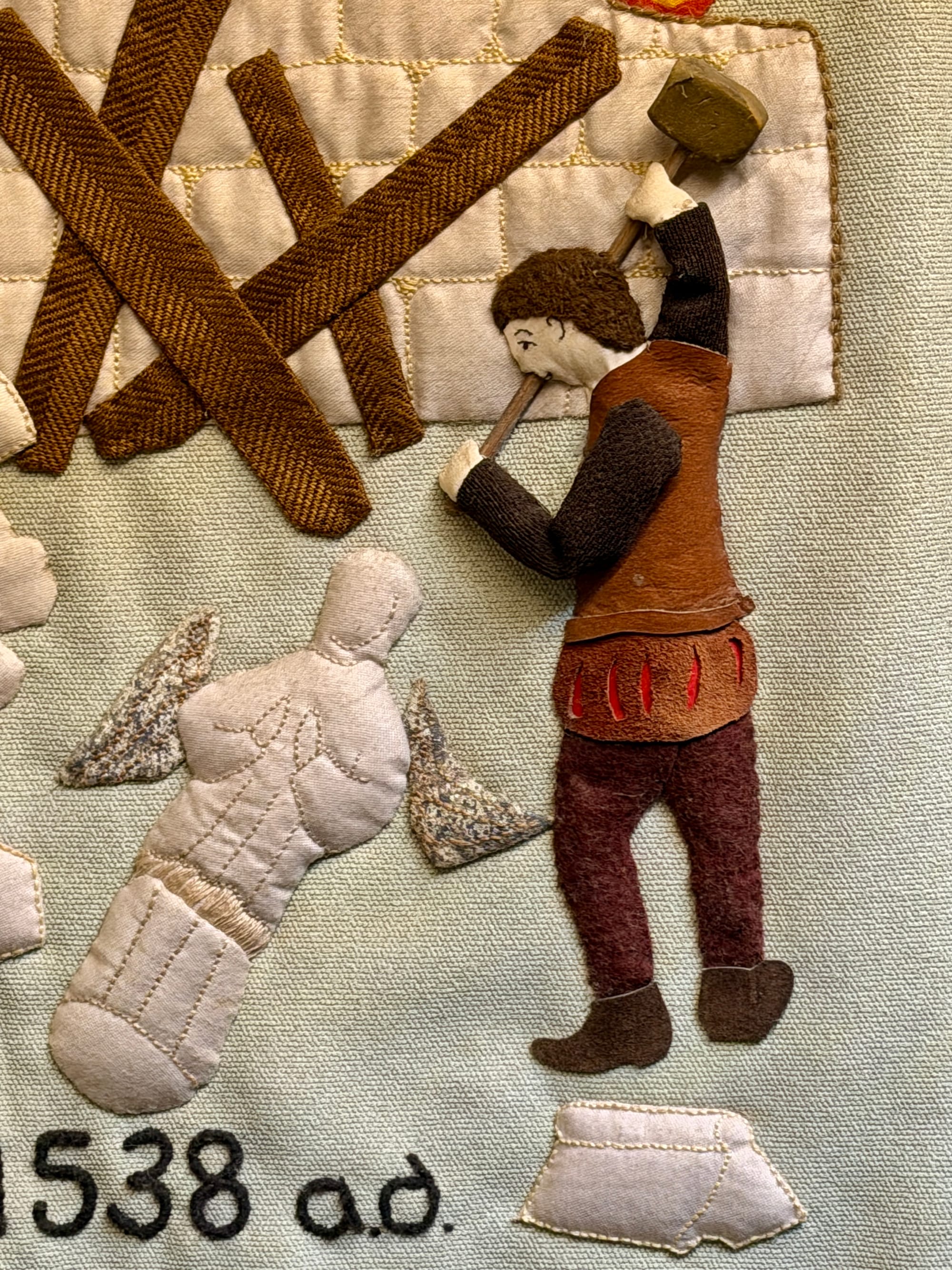 The tapestry is a map of memory - applique figures, textured fabrics, and small material choices that echo the building’s own layered history. It’s another reminder that heritage is not just what we inherit, but what we keep remaking.