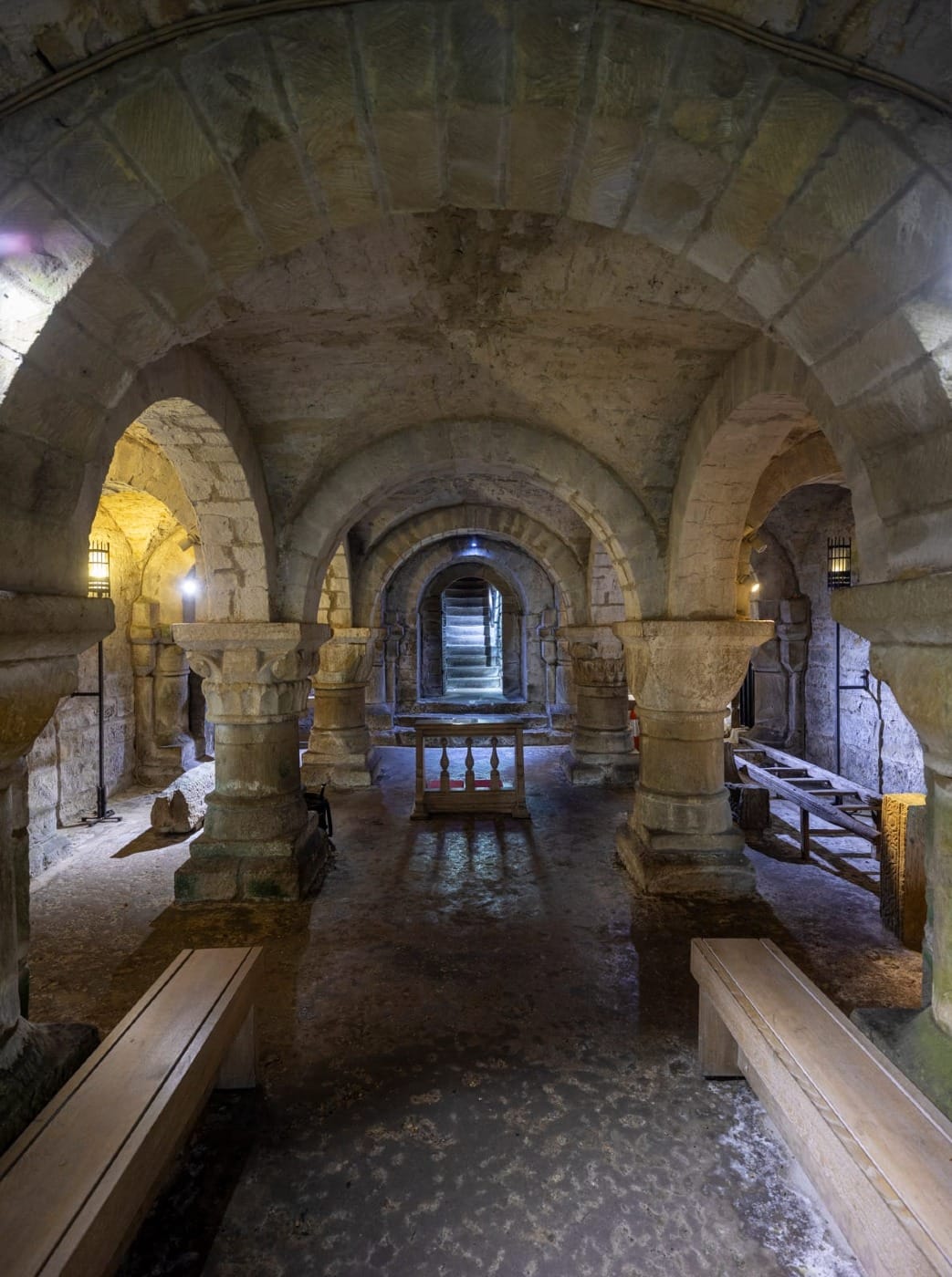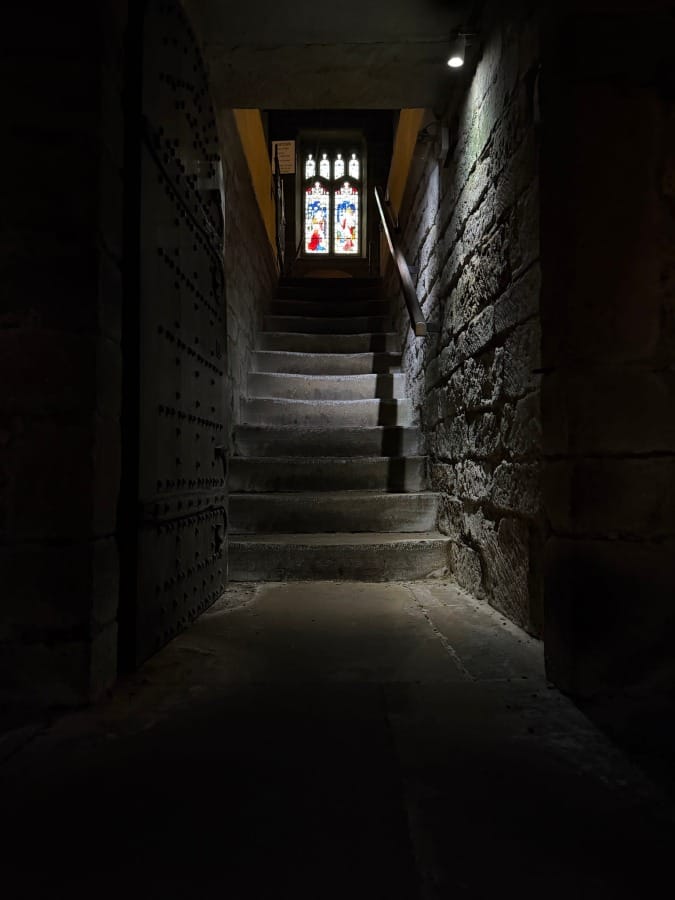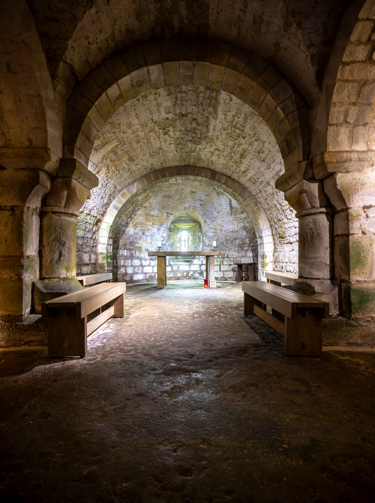 I walk up to the door that says ‘crypt’ and it looks as though it’s locked. I look around, there’s nobody here to ask - so I lift the sneck and it opens. I negotiate a set of worn steps down into the crypt. Without any expectation of what awaits, I start to dust off a cobweb caught on the arm of my coat from the wall. Then I look up and see the crypt for the first time.