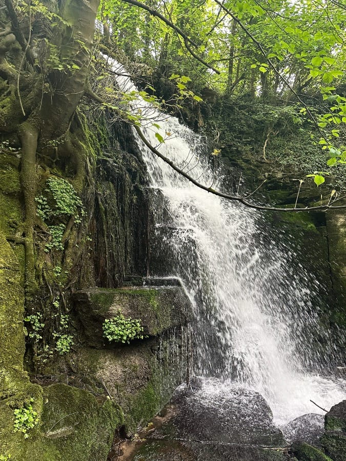 I can hear it clearly now: the rushing of the water is over to my right beyond a dip beside the road. I skirt along a small track and head down towards the waterfall. My first view of the Harmby Falls is sublime: cascading sheets of white water. I stand for several moments, lulled into a dream state. I can't help but think that despite the anarchic bent of every gushing molecule, the body of water holds the same shape as it crashes over the roots and rocks.